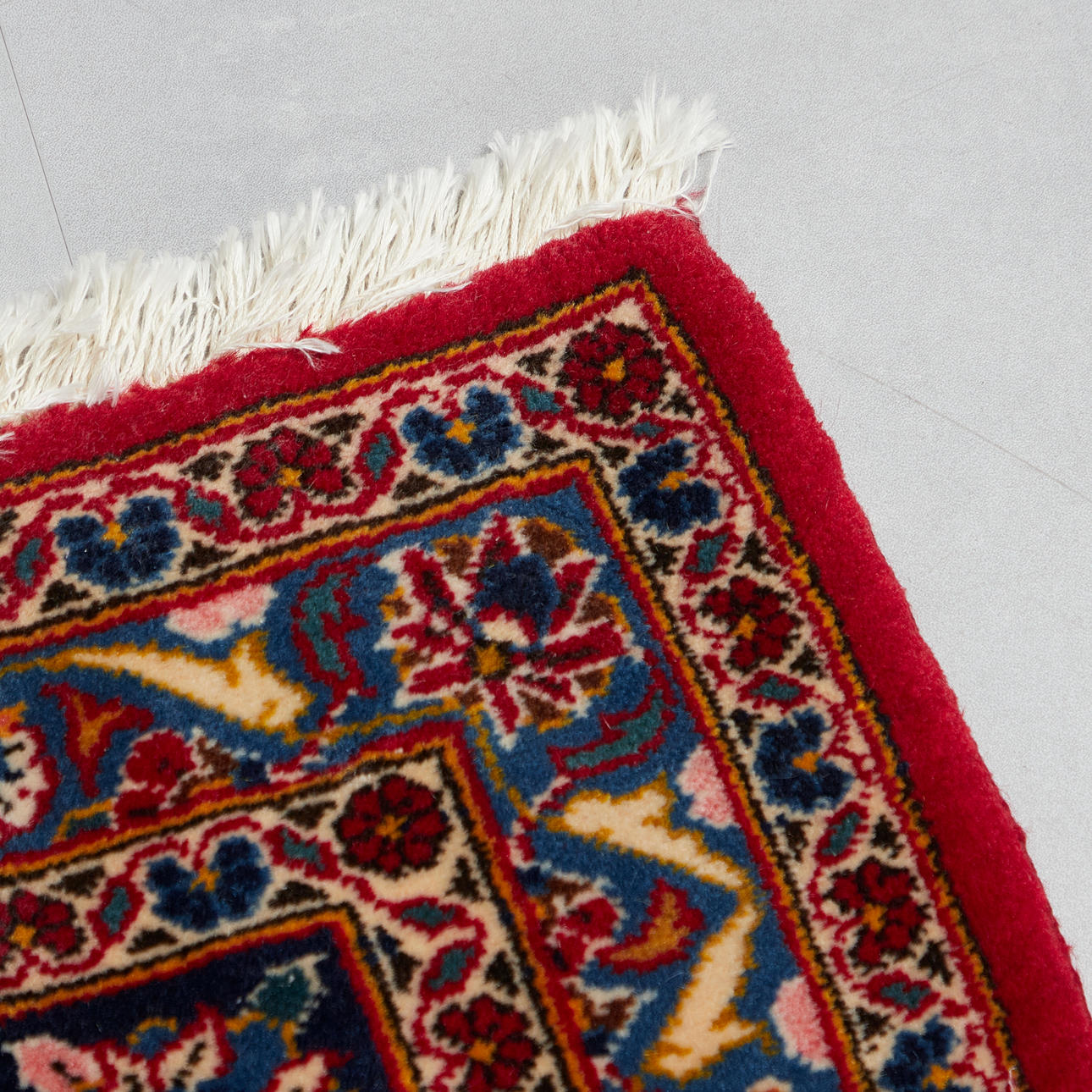 Wool carpet on cotton with a polychrome depiction of a central symmetrical medallion on a red background, decorated and framed with floral ornaments and several decorative borders in dark blue, beige and red, with fringes on the long side.