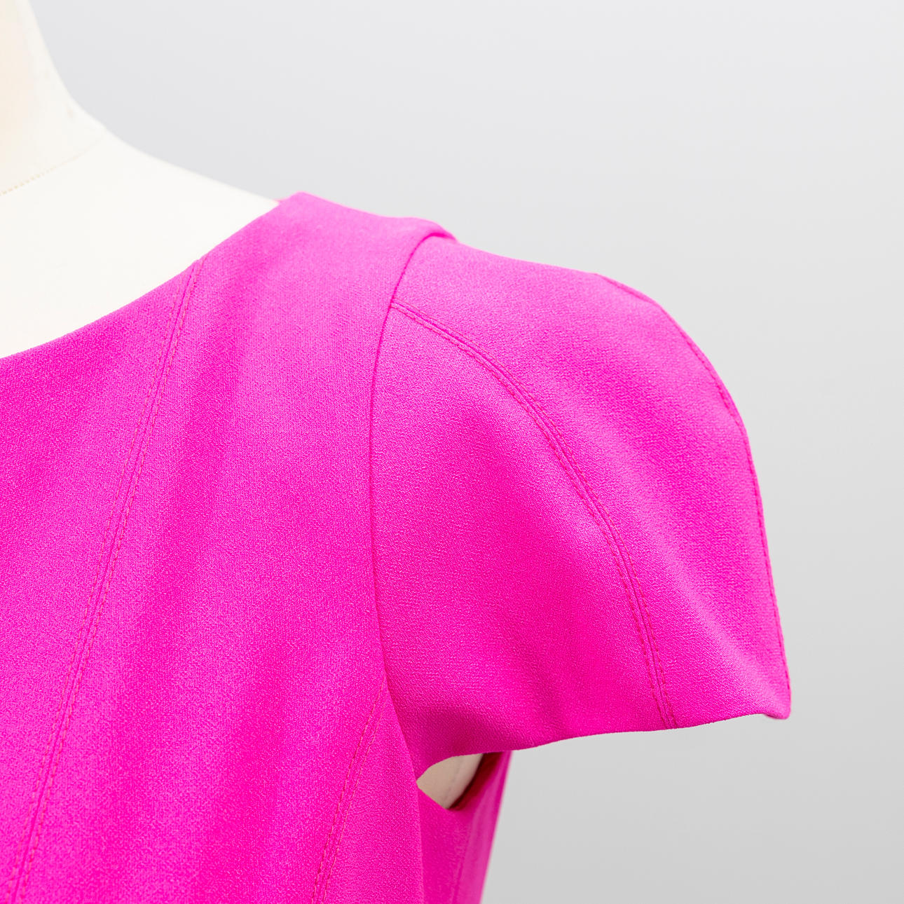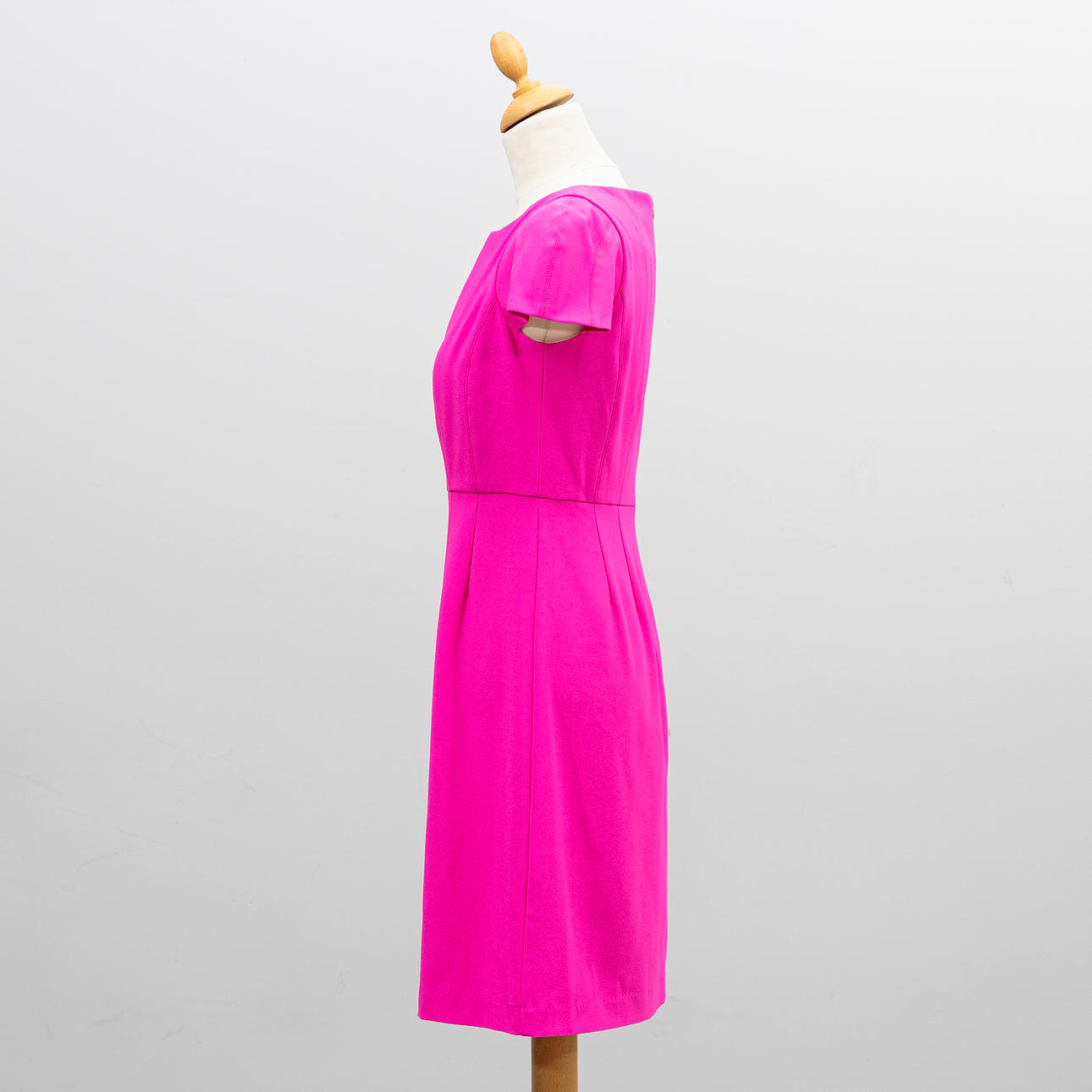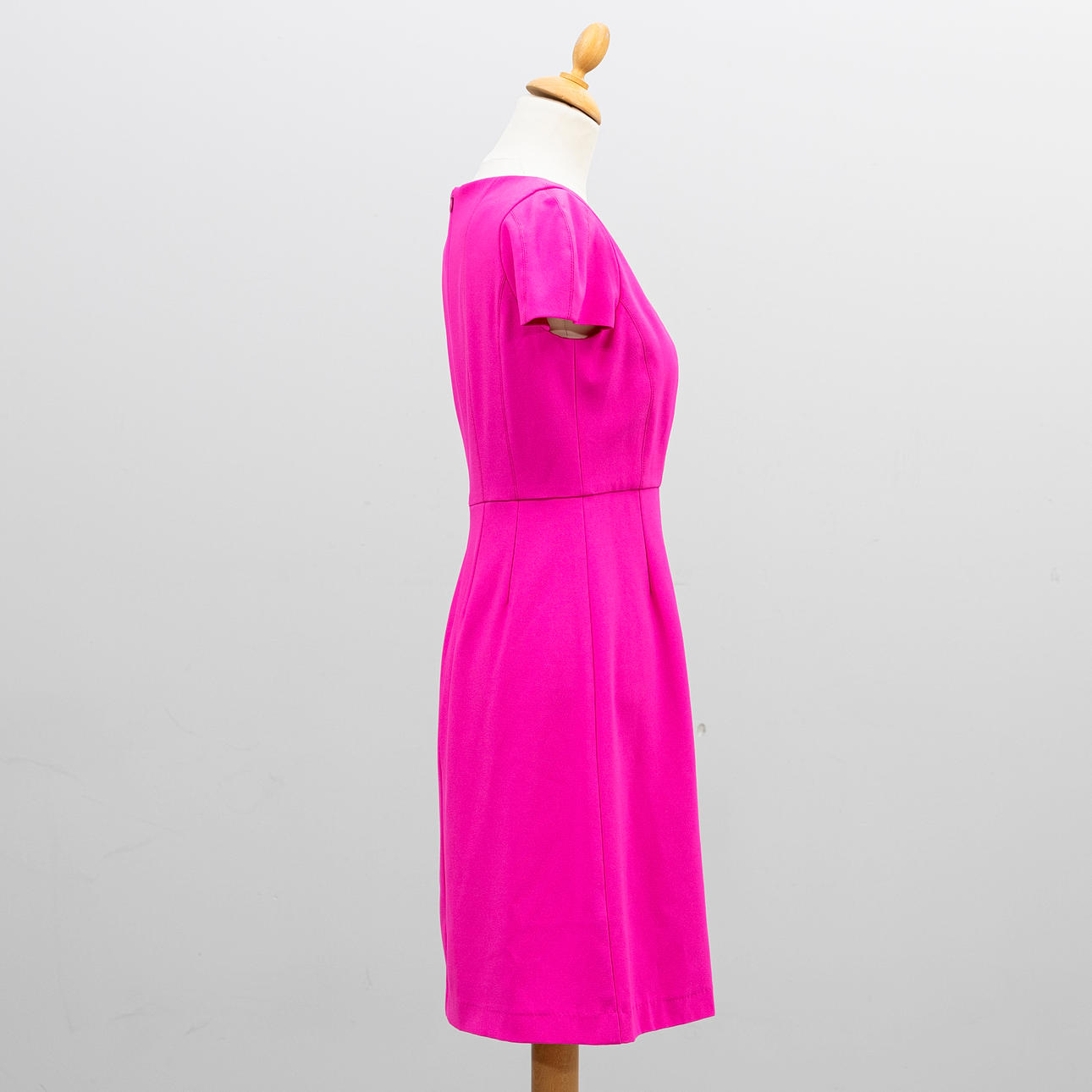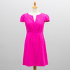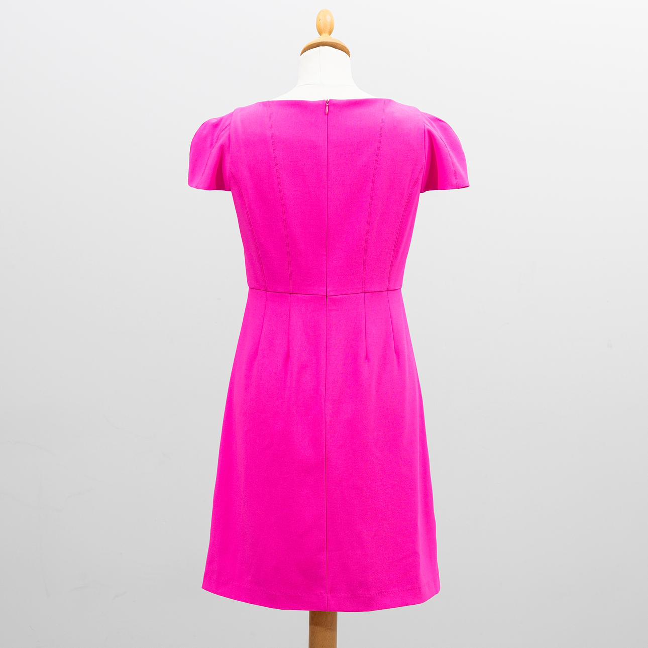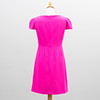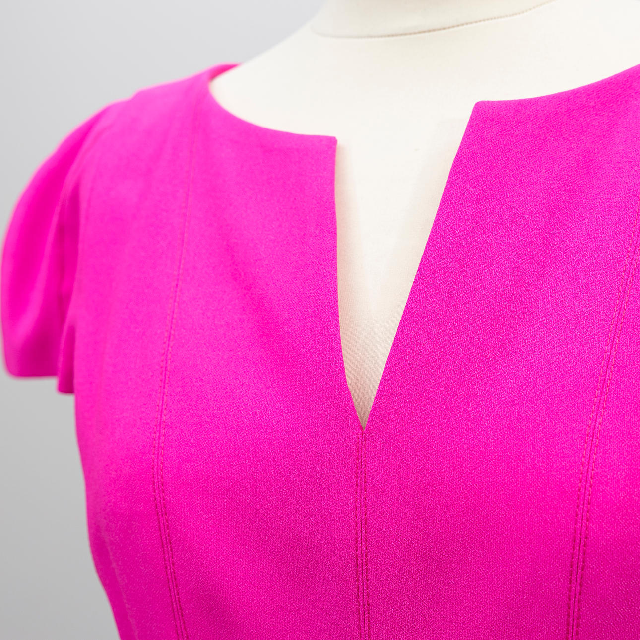 Cerise cotton and polyester blend. Short sleeved figure-fitting model with stitching and v-neck. Fully lined, zipper in the back.