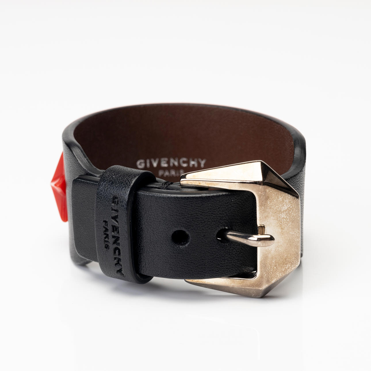 Givenchy in black leather with red star decor. Marked “GIVENCHY PARIS”, length approx. 20 cm (three holes for buckle).