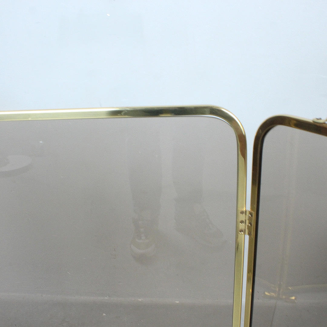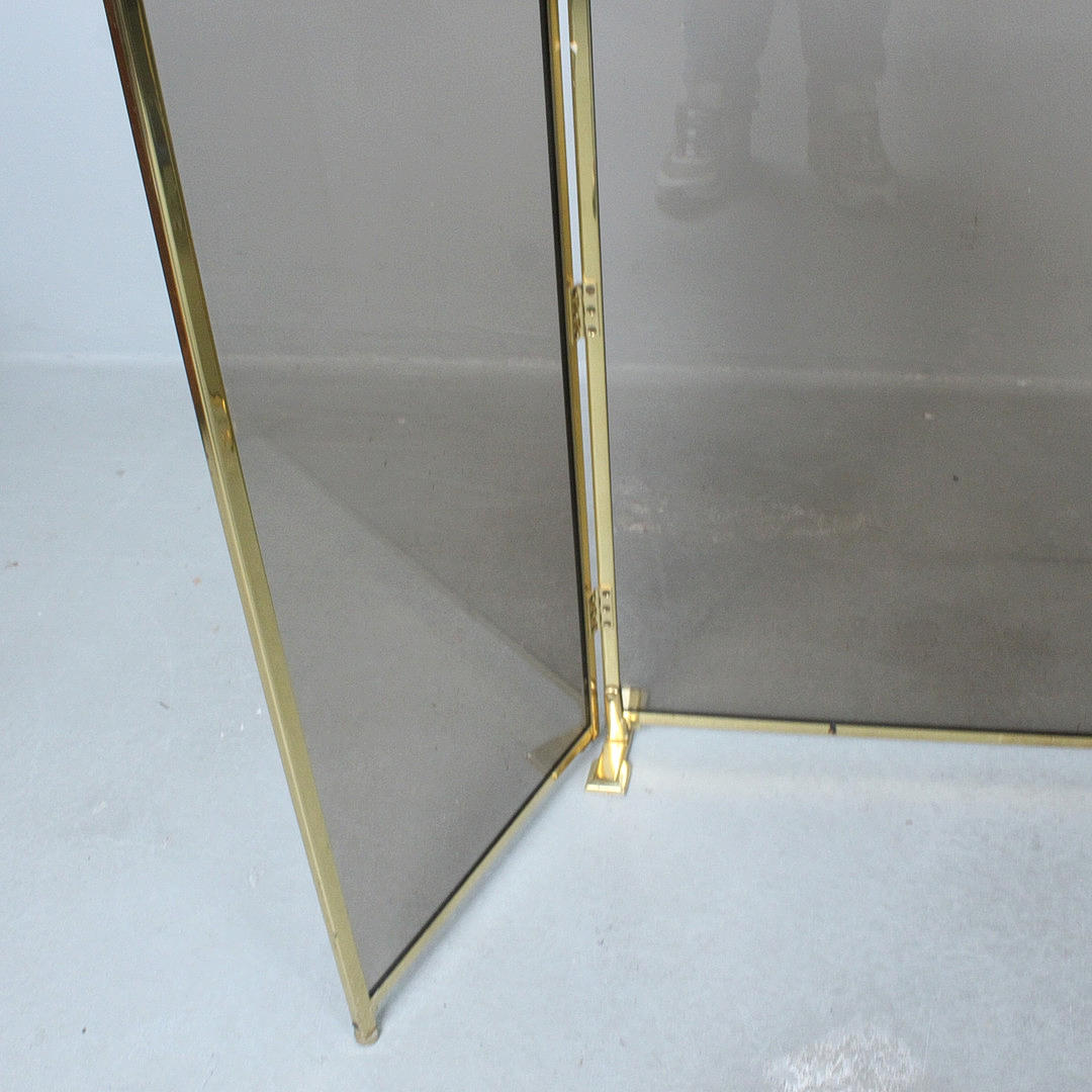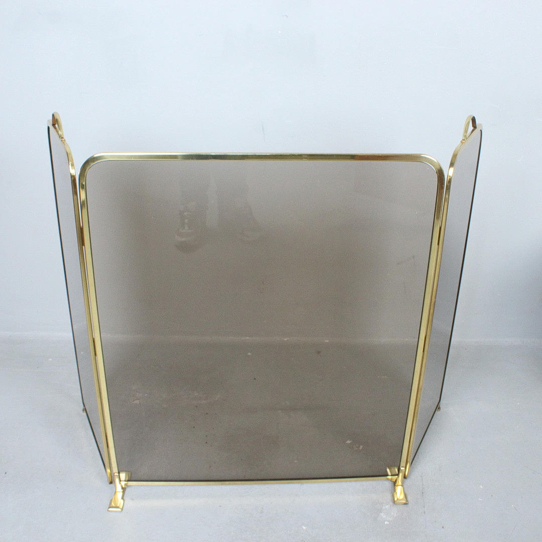 Foldable fireplace protection made of brass and smoked glass.