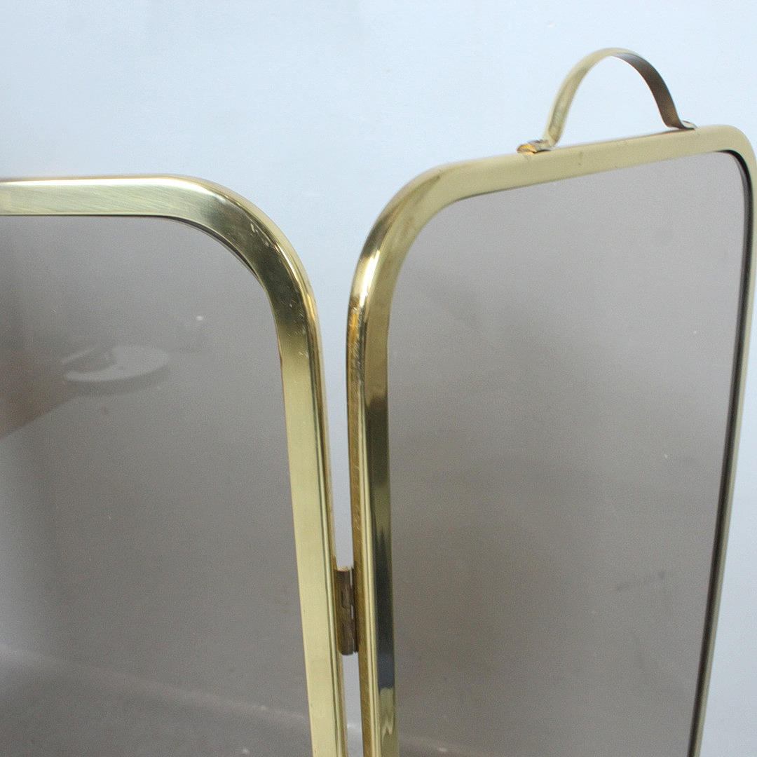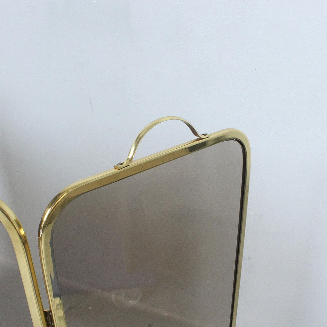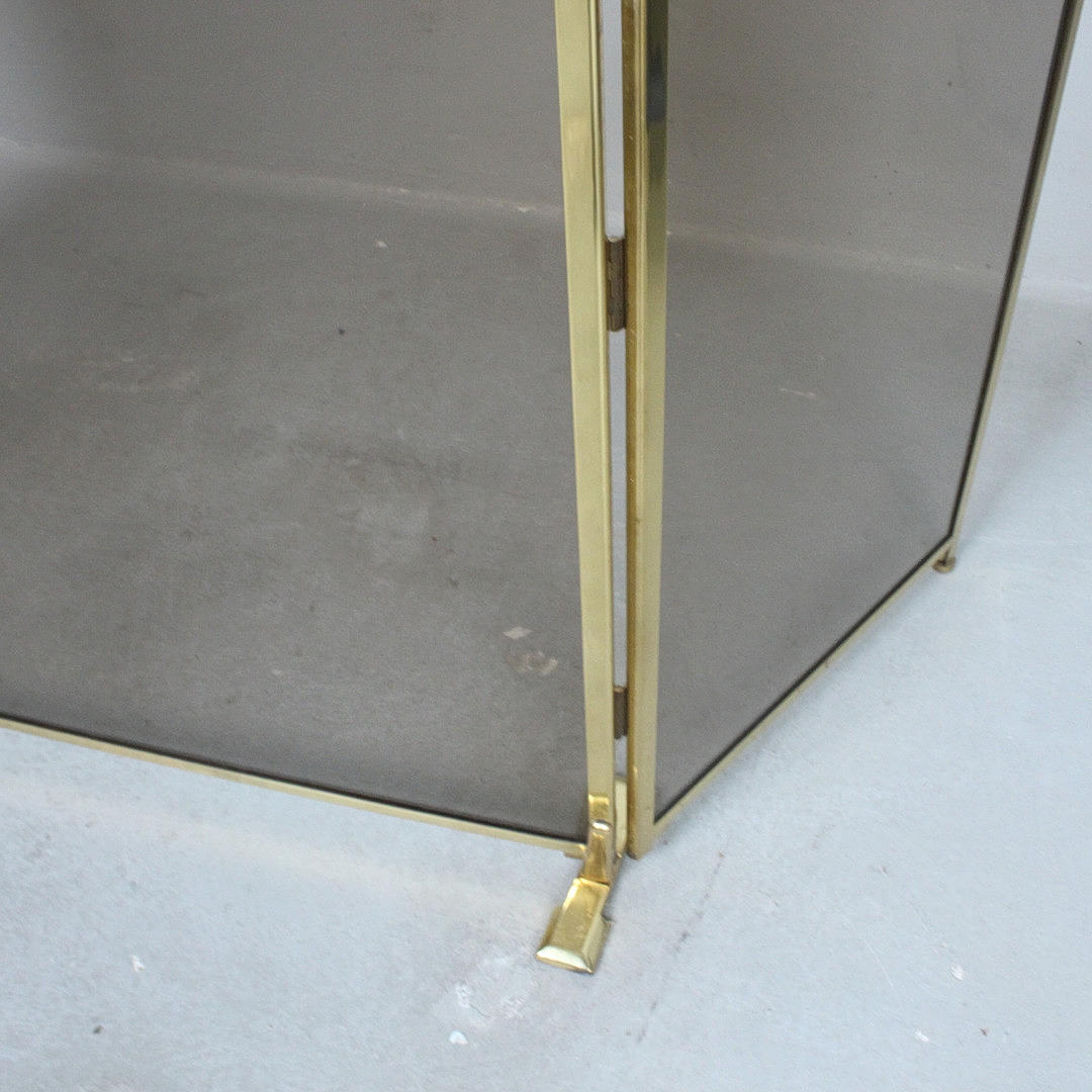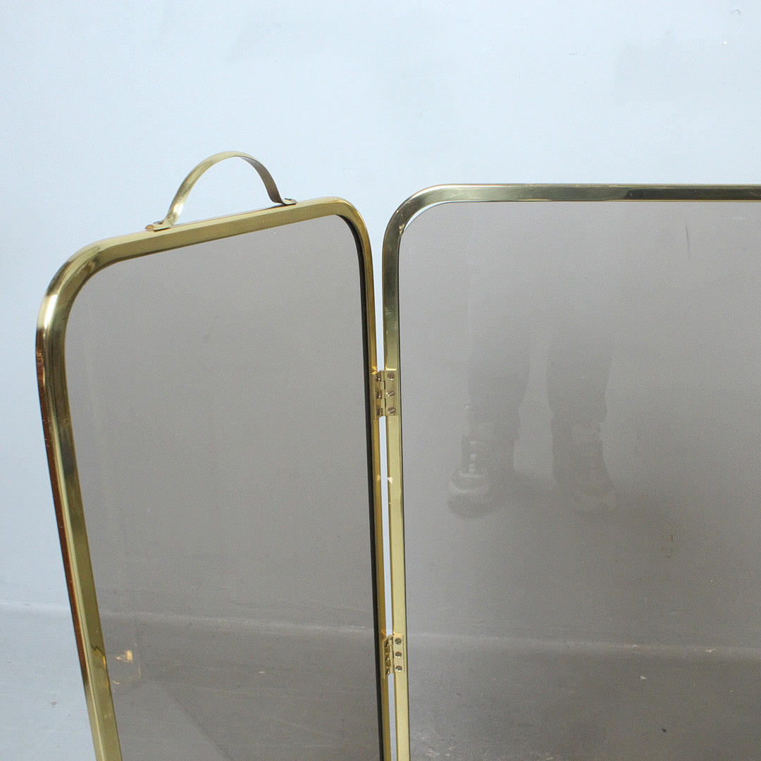 Foldable fireplace protection made of brass and smoked glass.