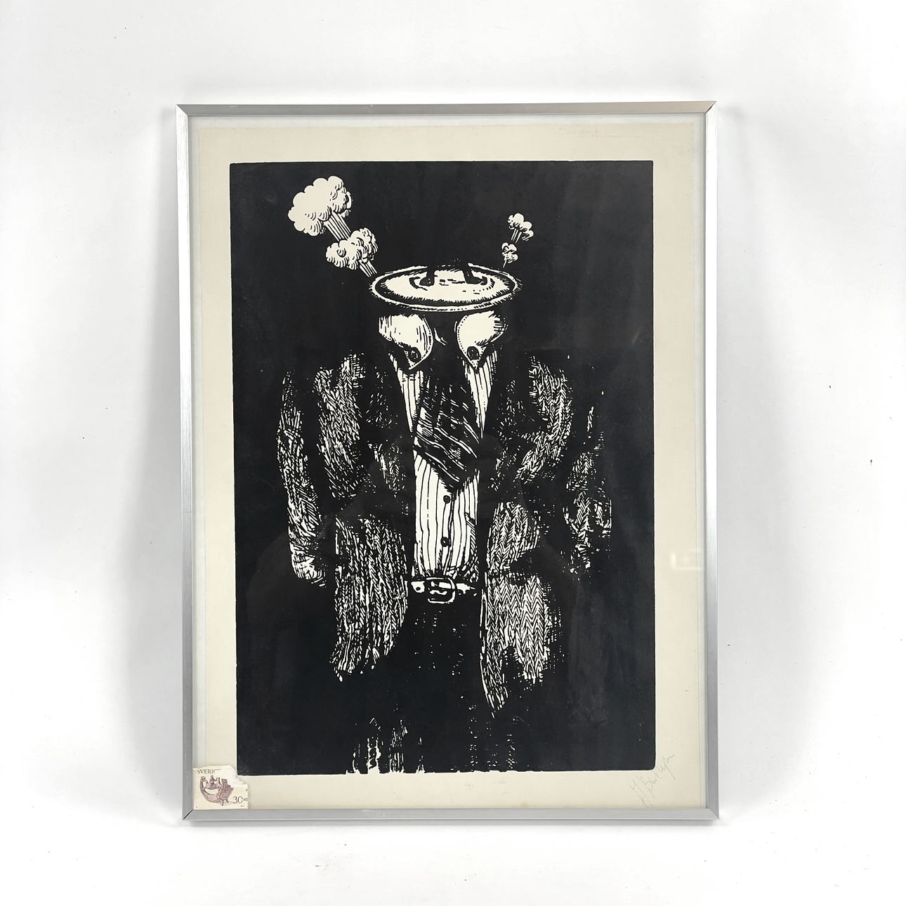 UNIDENTIFIED ARTIST. Graphic leaf, surreal figure, signed.