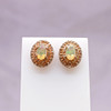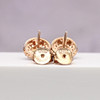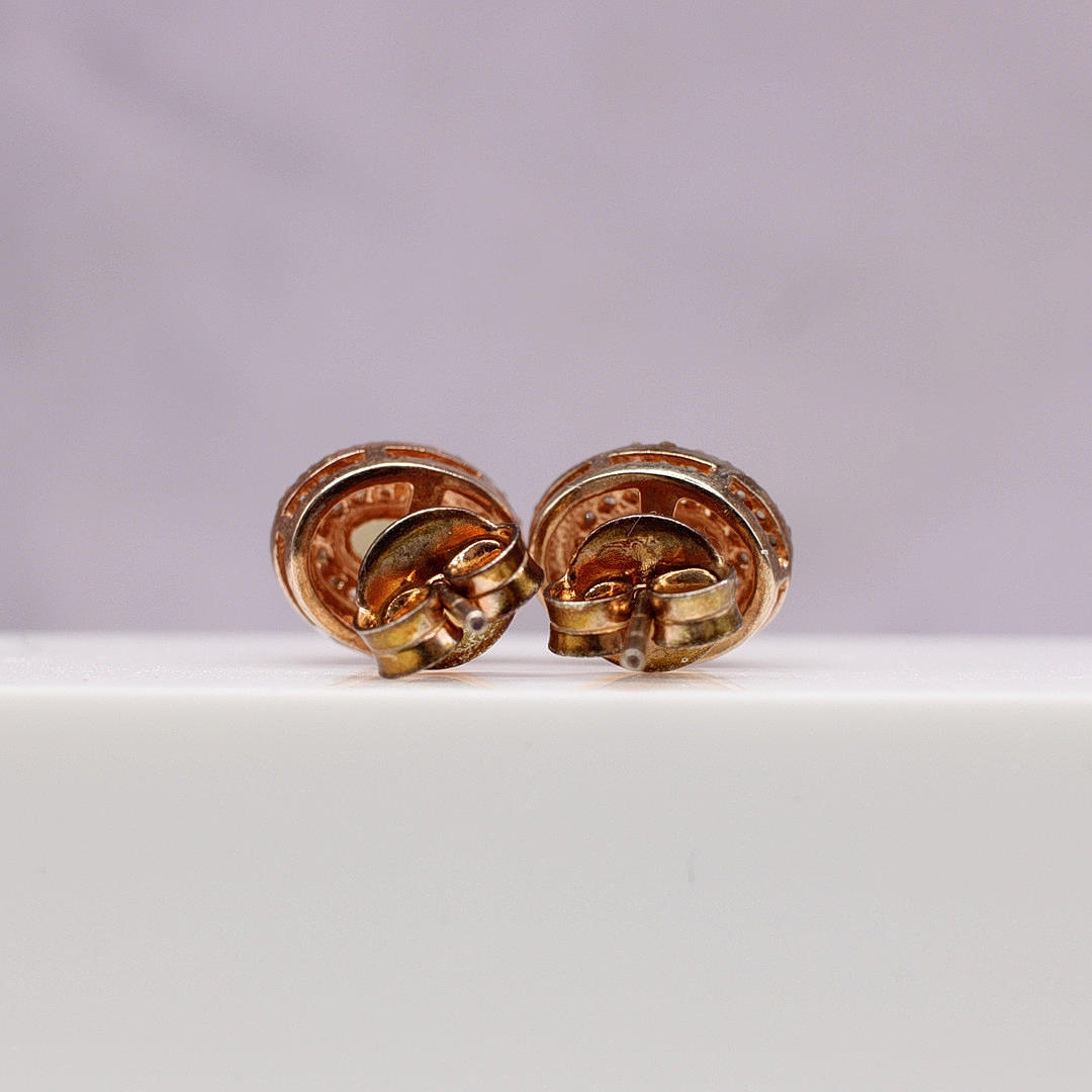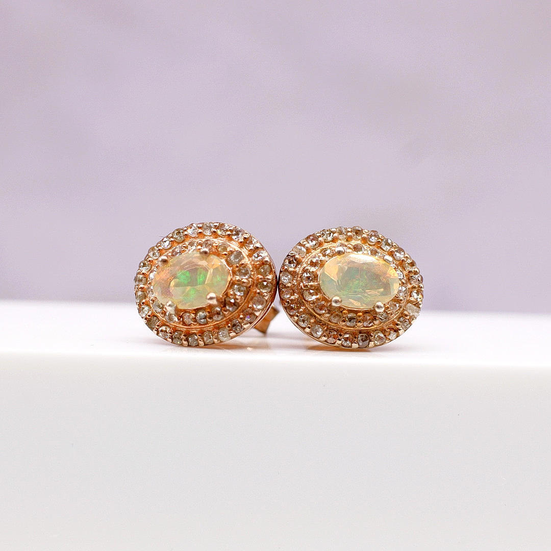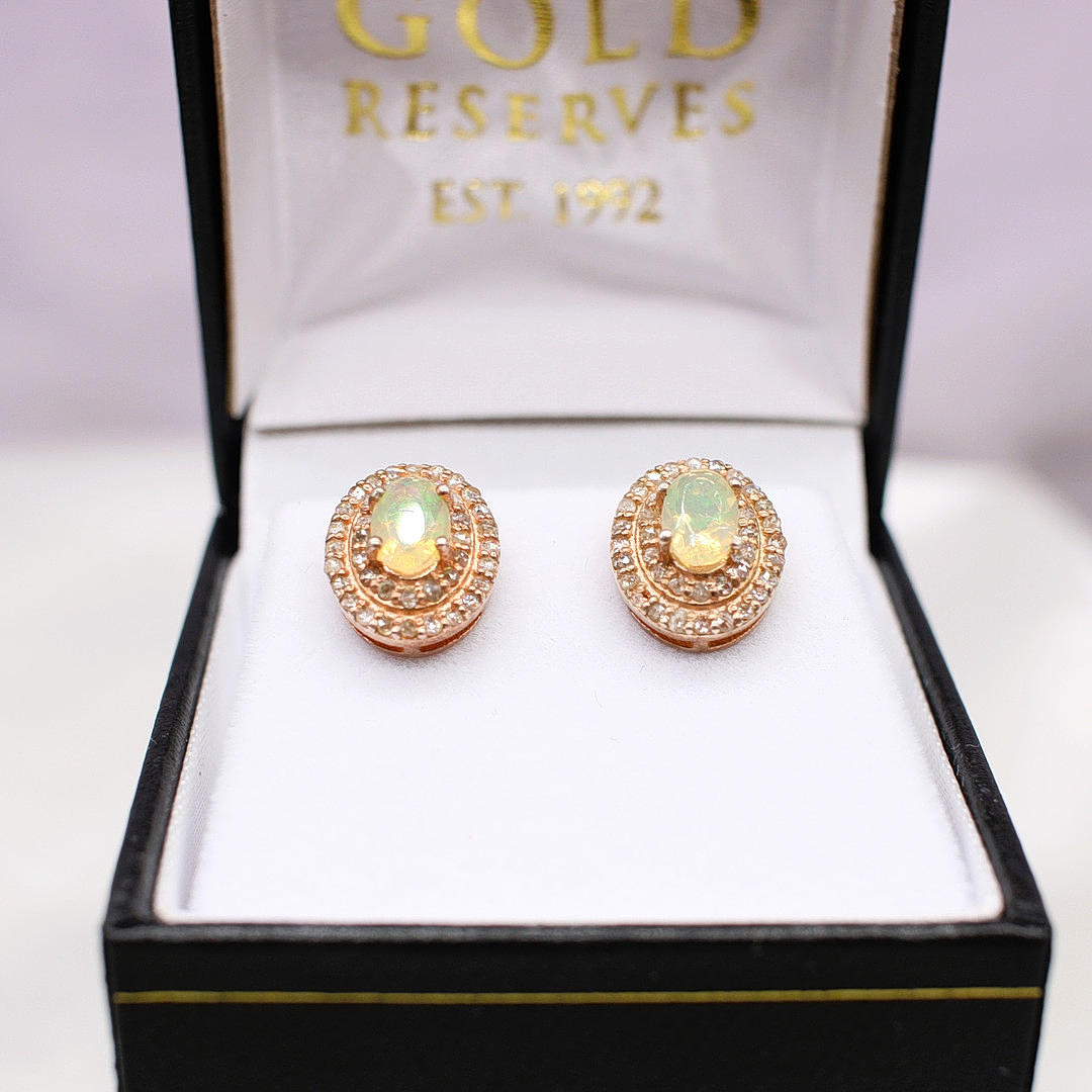 A Pair Of Rose Gilt Silver (Stamped 925) Oval Studs Set With Opal And A Double Halo Of Diamonds.