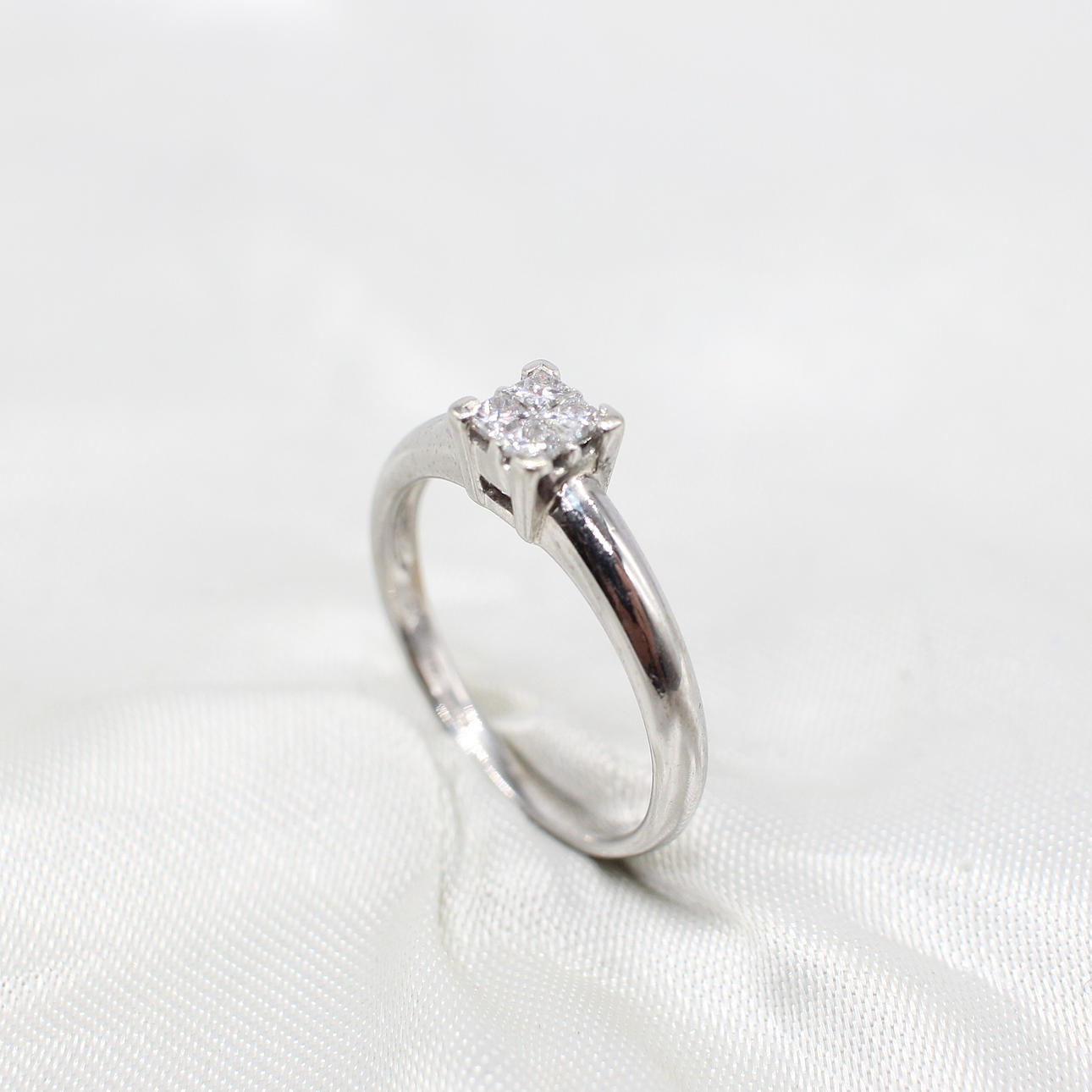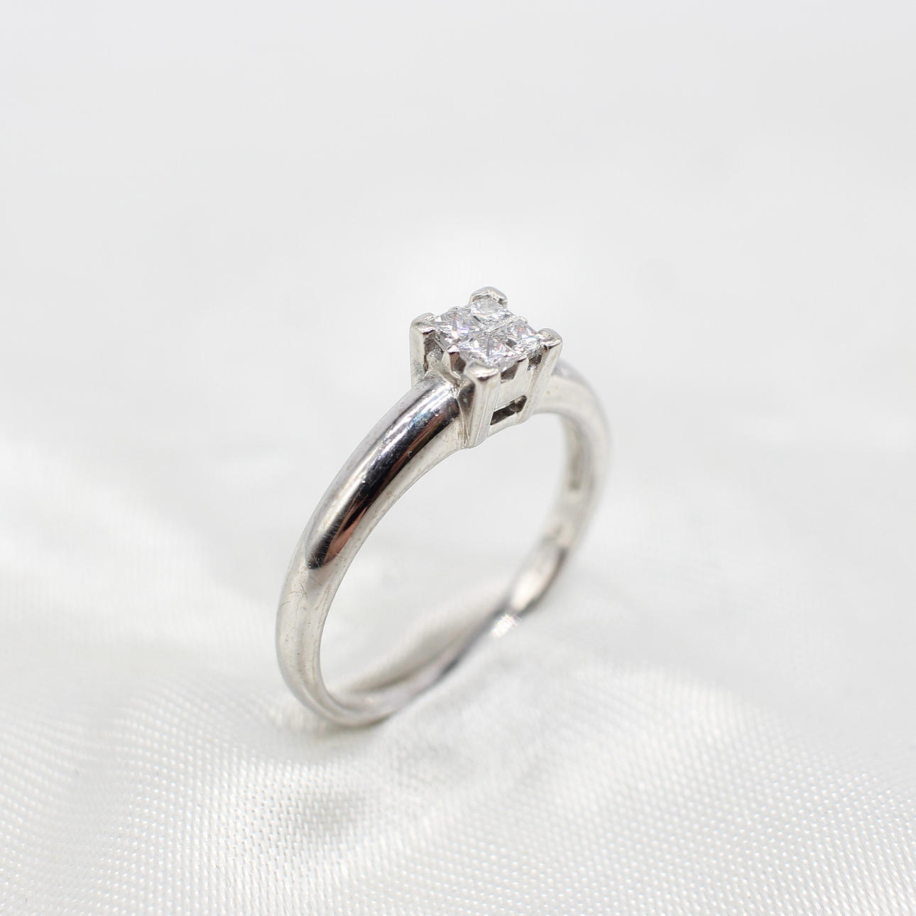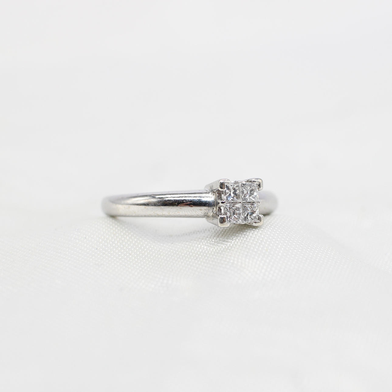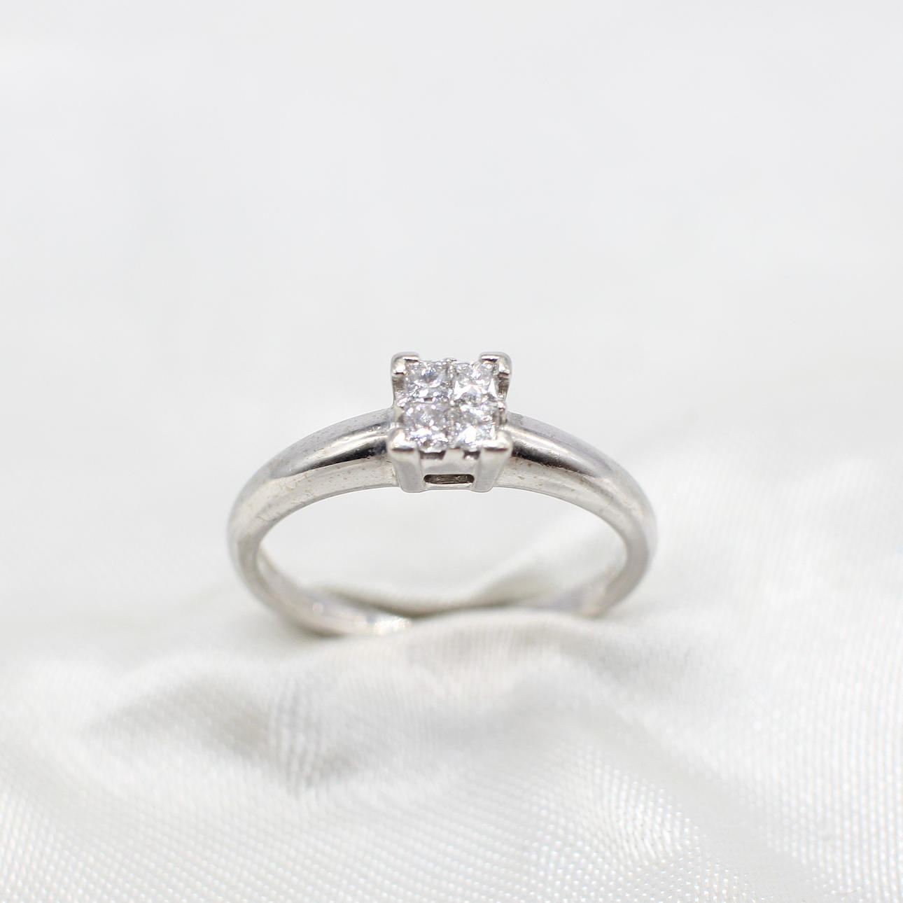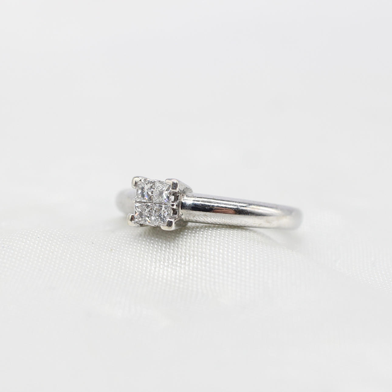 A 9K White Gold (Hallmarked) Princess Cut Illusion Ring, Set With 4 x Princess Cut Diamonds.