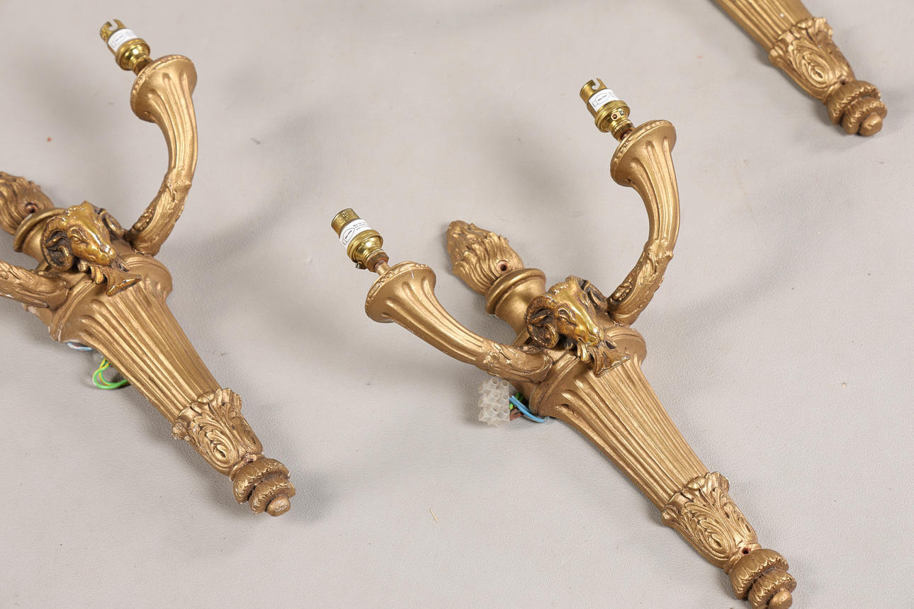 Each with two branches and rams mask decoration, 23cm wide 34cm high.