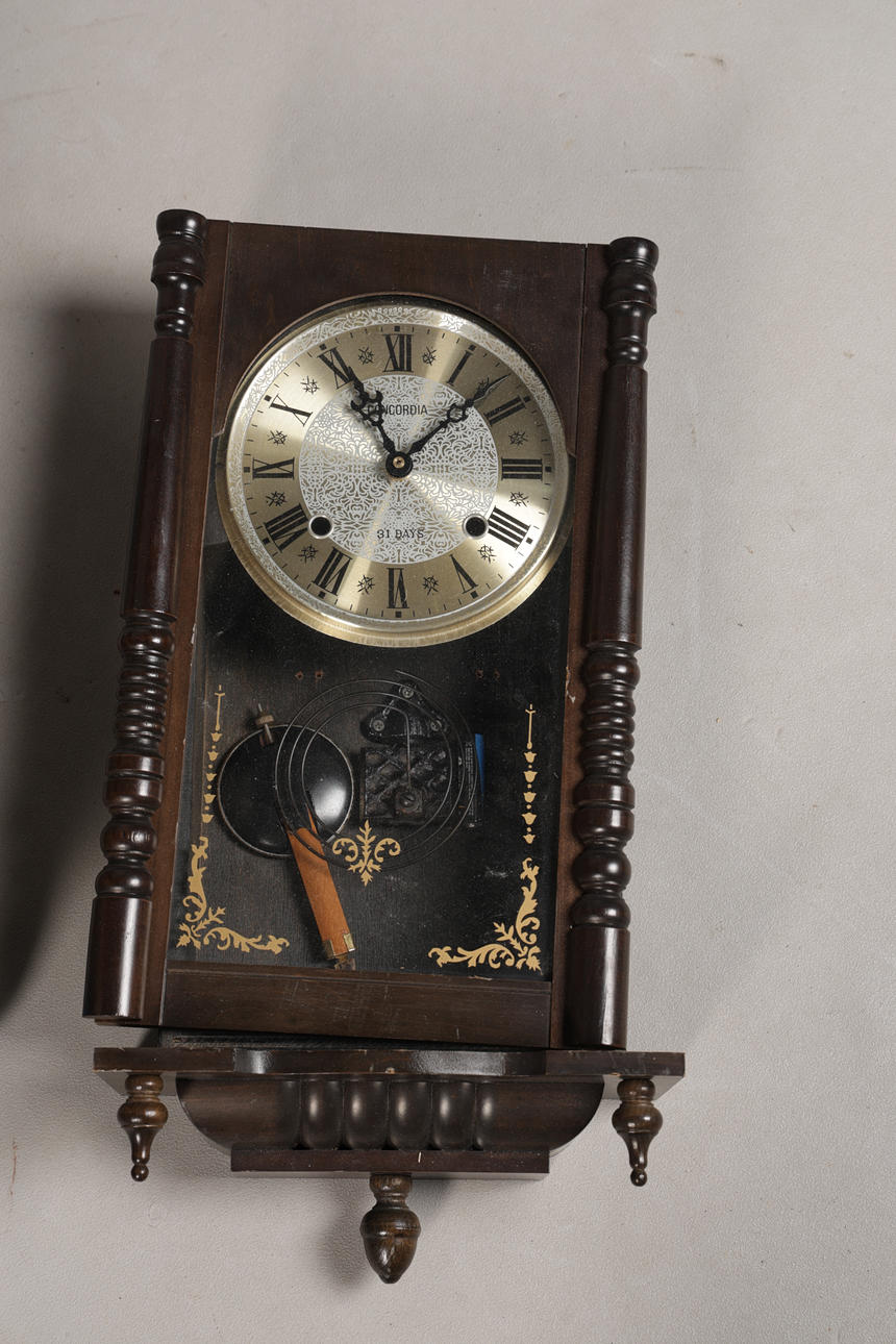 Missing weights, missing pediment to one, all with normal wear, we do not guarantee the working condition of any clock.