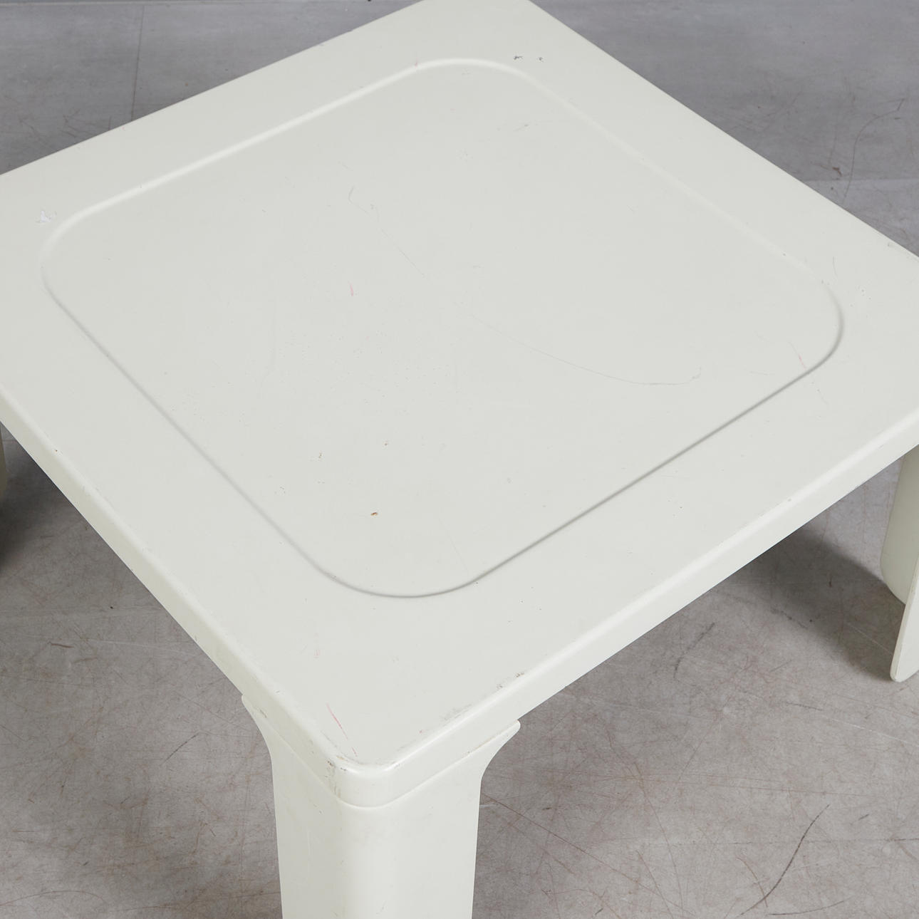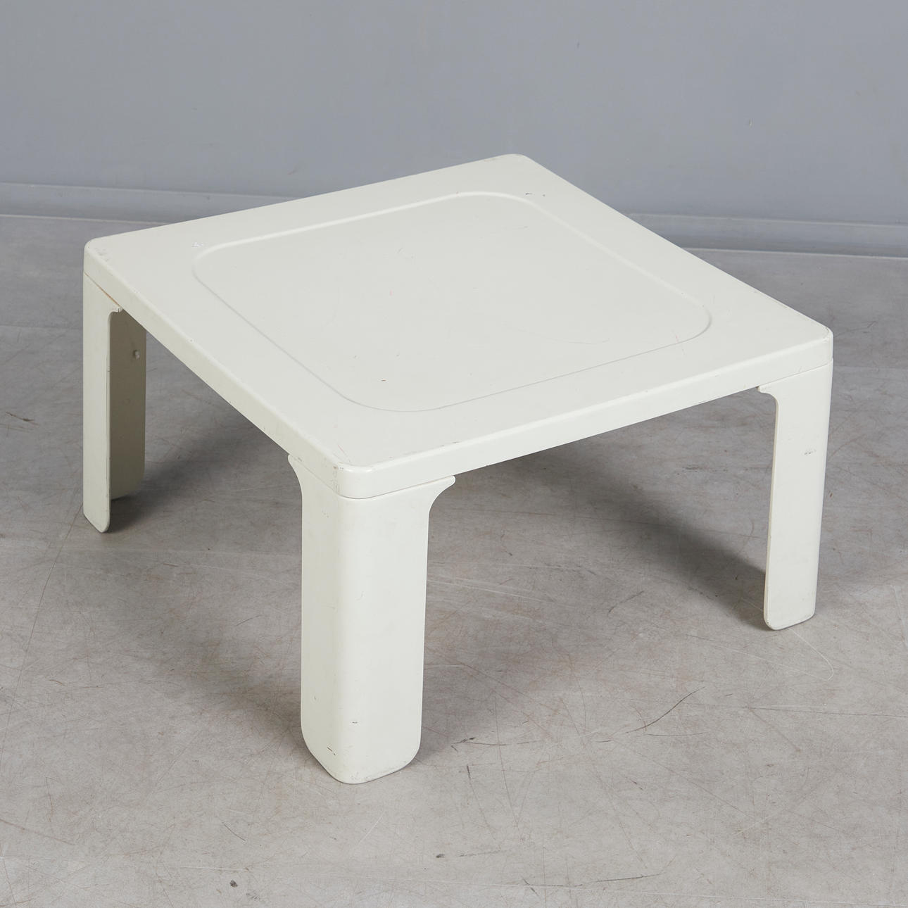 Square coffee table made of glass-reinforced plastic painted white, with rounded corners, H.38cm, L.65.5, W.65.5 cm.