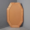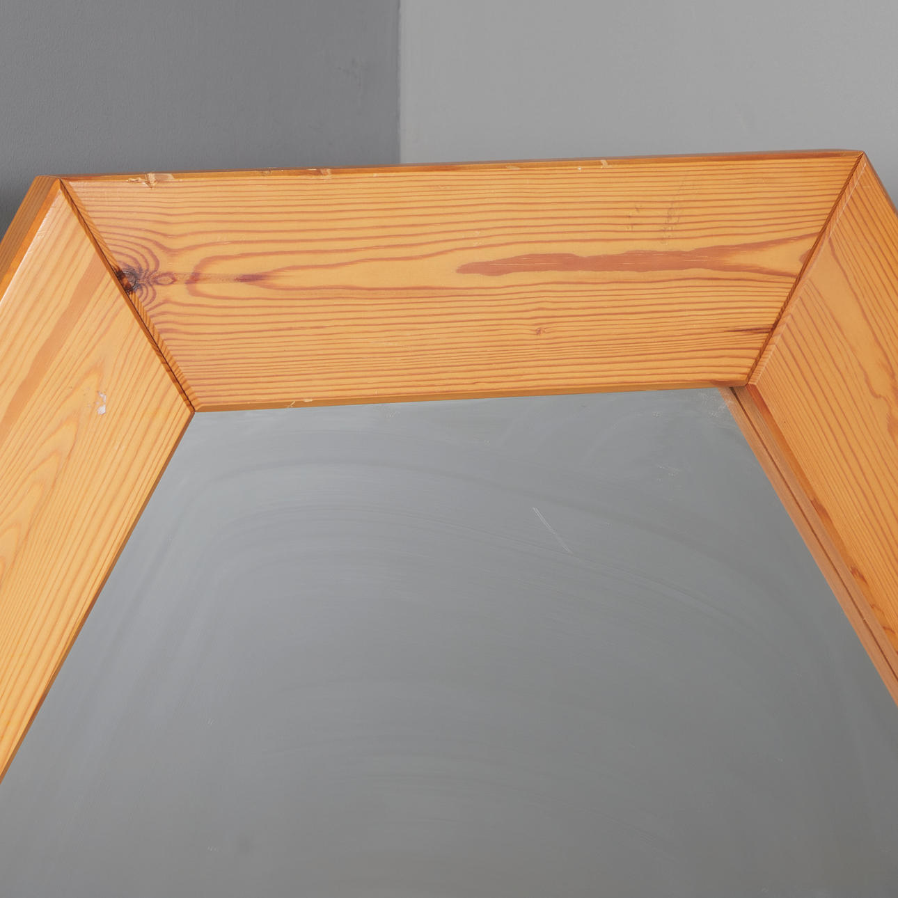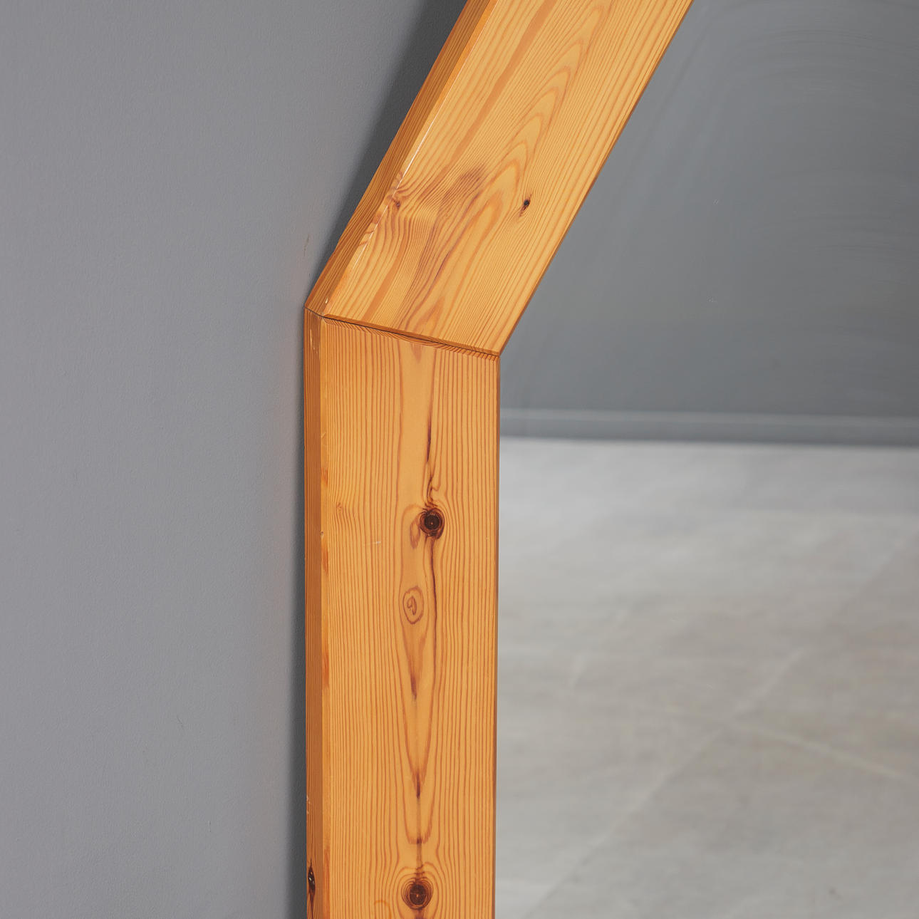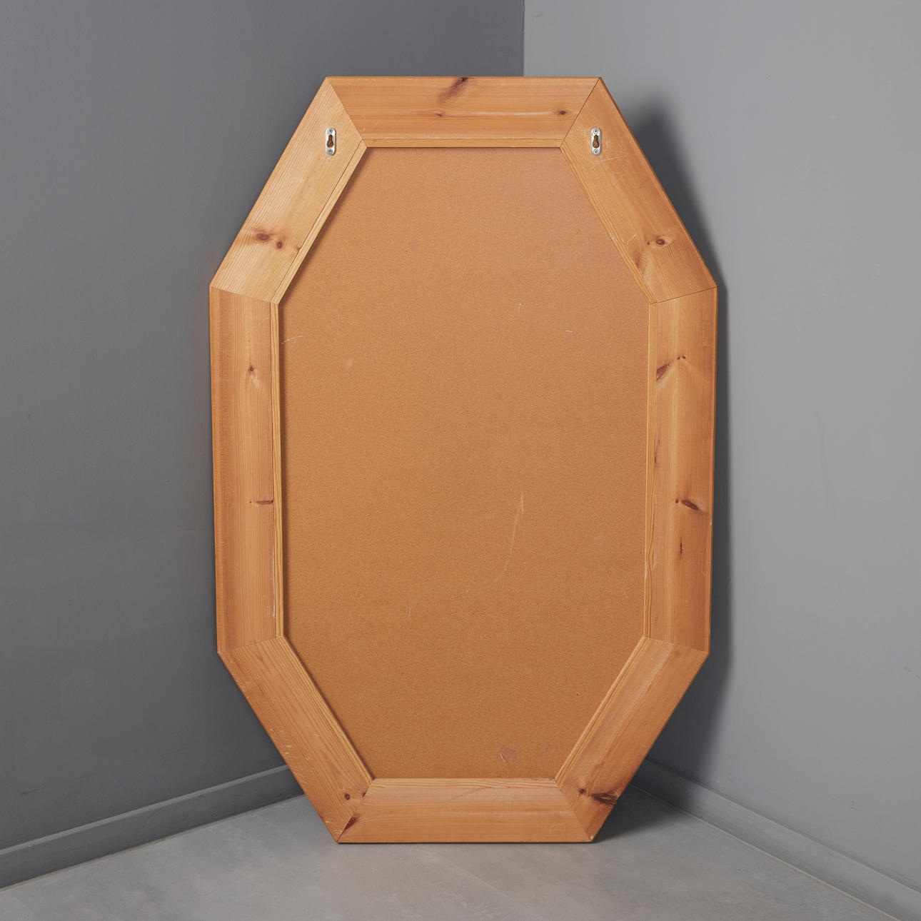 Hexagonal mirror with solid oiled pine frame, metal grommets on the back for wall mounting.