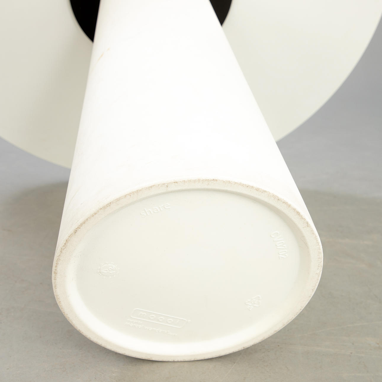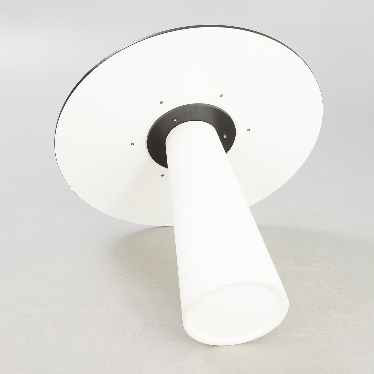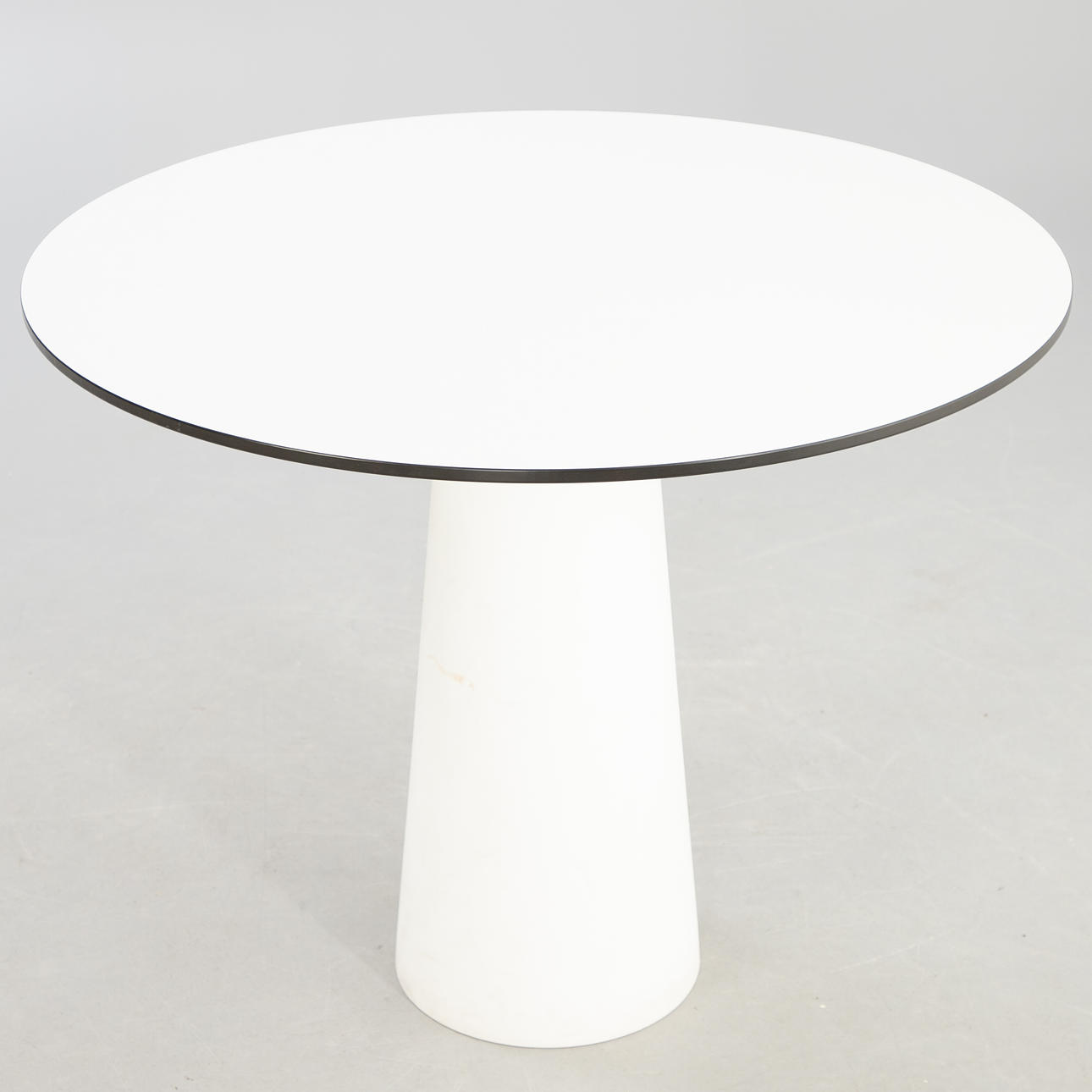 Outdoor table, heavy polyethylene base in white. Table top with white laminate and black table edge. cca Height 73 cm x diameter 90 cm.