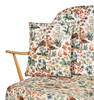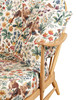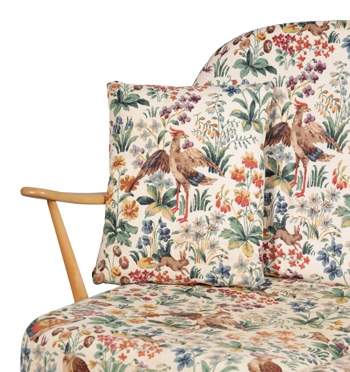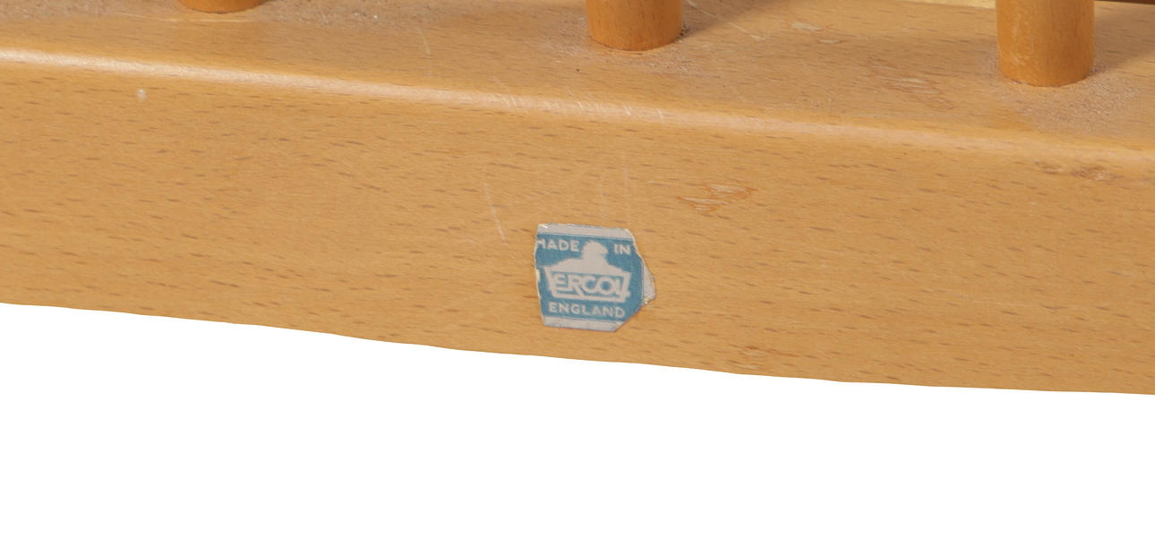 The model 203 beech and elm two-seater sofa by Ercol, with spindle back and curved arm rests, raised on splayed legs connected by stretchers, Ercol label to reverse, together with a set of Ercol cushions, measuring 78cm height, 136cm width, 92cm depth.