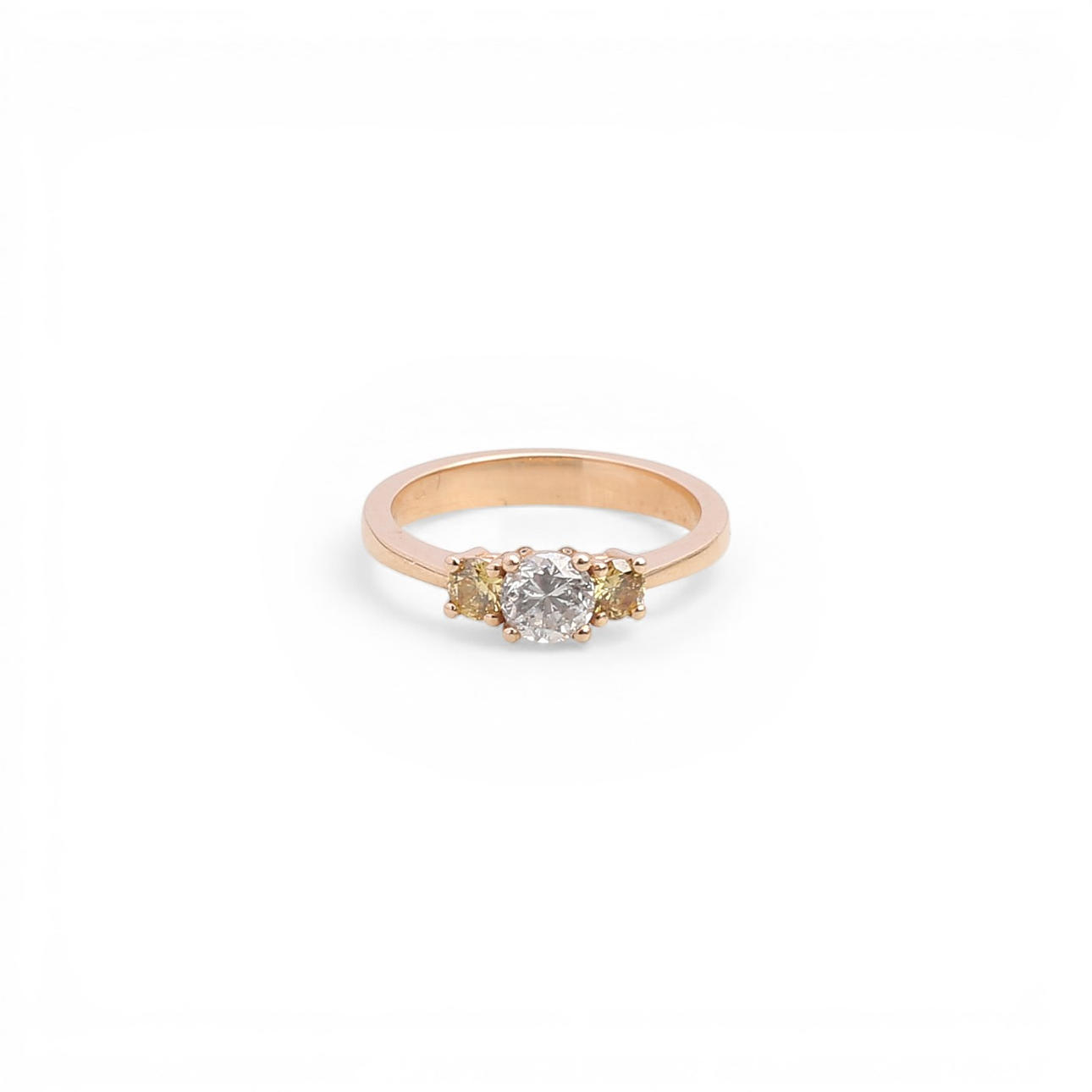 With certificate by Antwerp International Gemological Laboratories (AIG), no. J3111503418, attesting that it is a natural brillian cut diamond, 0.60 cts, F colour and SI3 clarity, and two natural brilliant cut diamonds, 0.32 cts, Fancy Yellow colour and VS1 and VS2 clarity.