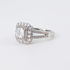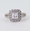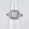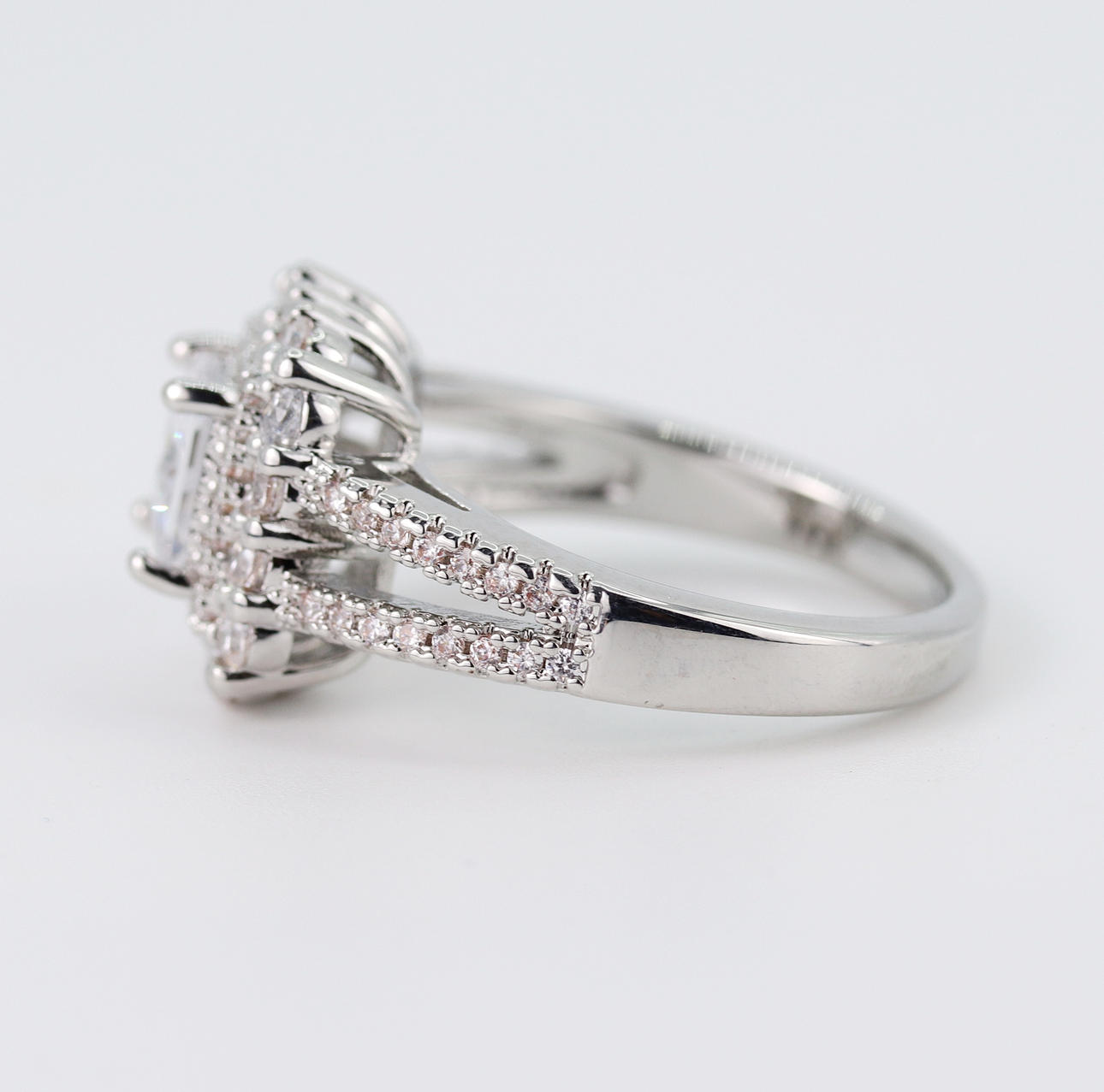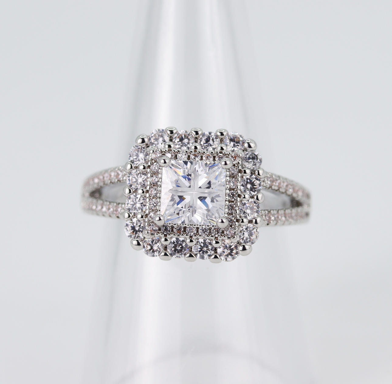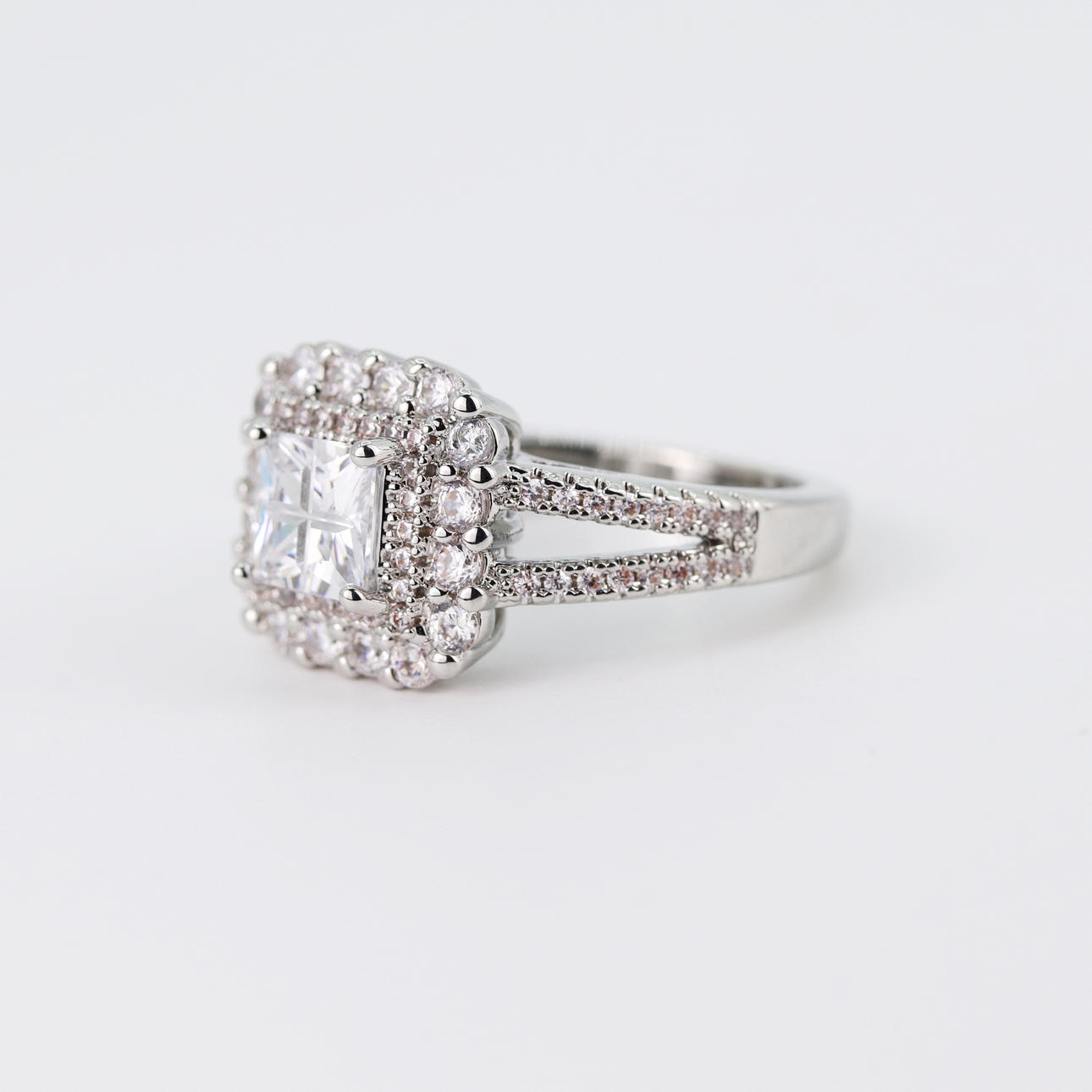 A silver, marked 925, ring set with princess and brilliant cut white stones. Ring size Q.5.