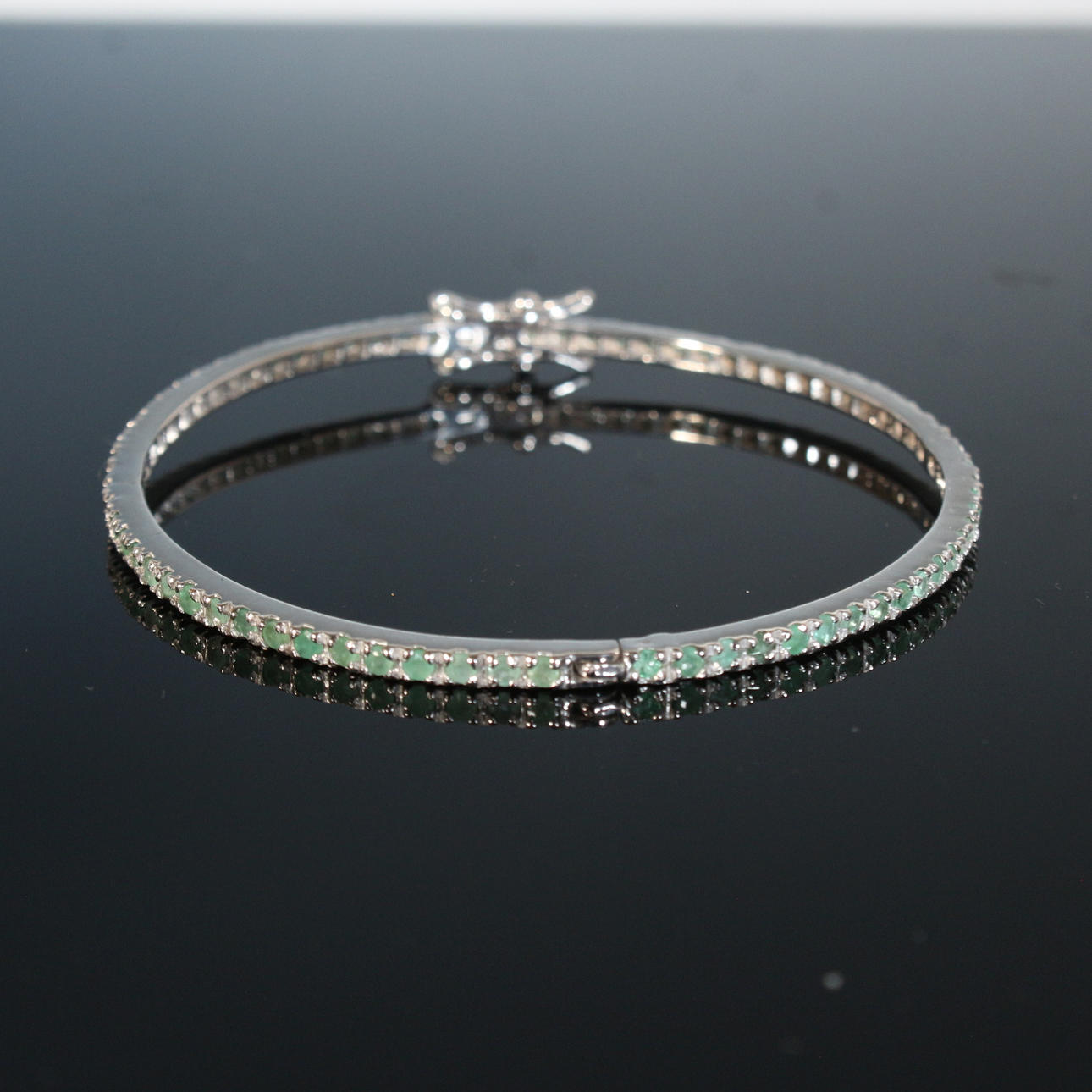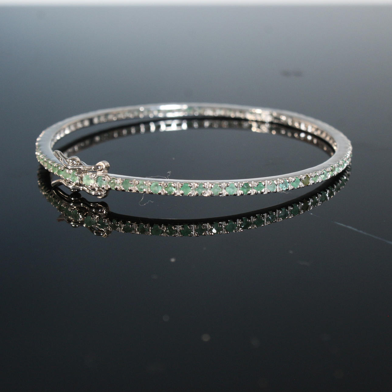 Emerald bangle 925 silver, rhodium-plated with white gold natural emeralds approx. 2 mm, green, round faceted Clarity: transparent Diameter approx. 56 mm Total weight: approx. 6.77 g Treatment: unheated Origin: Brazil.