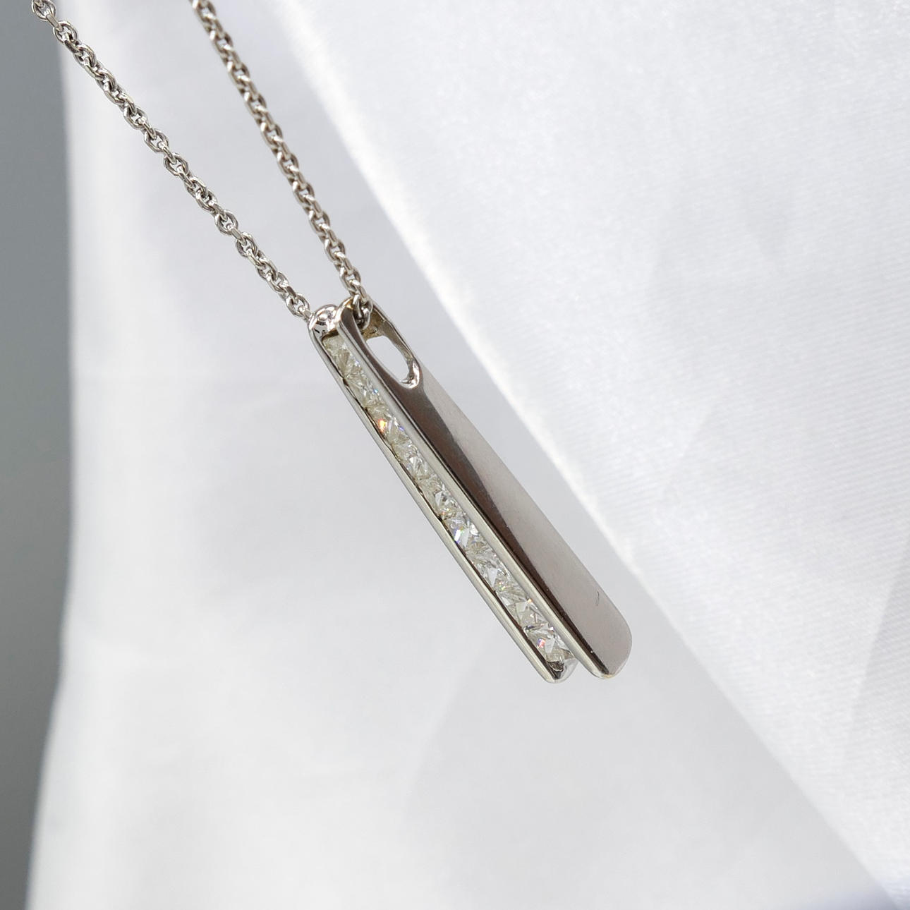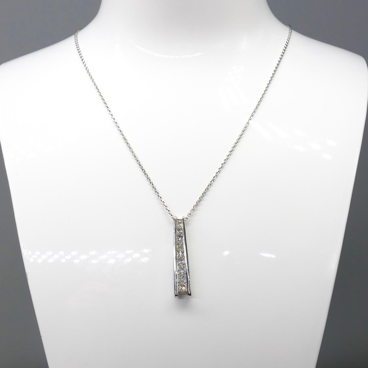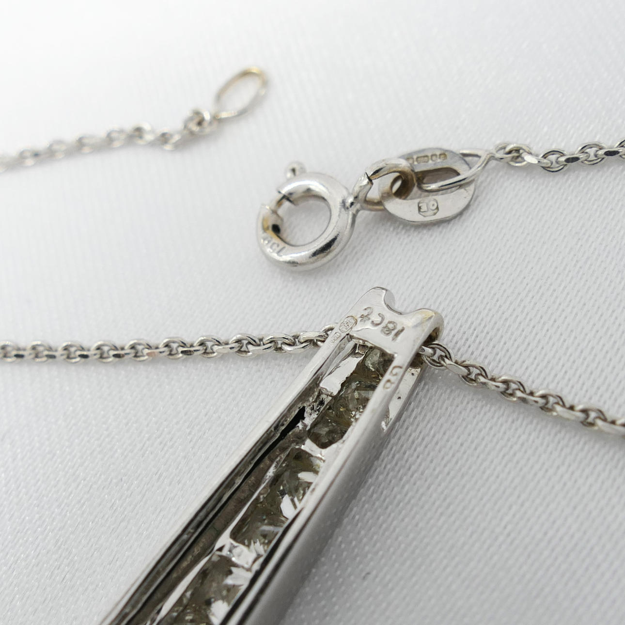 Pendant: 18k white gold as hallmarked, channel set; 25mm long; weight 2.75 grams