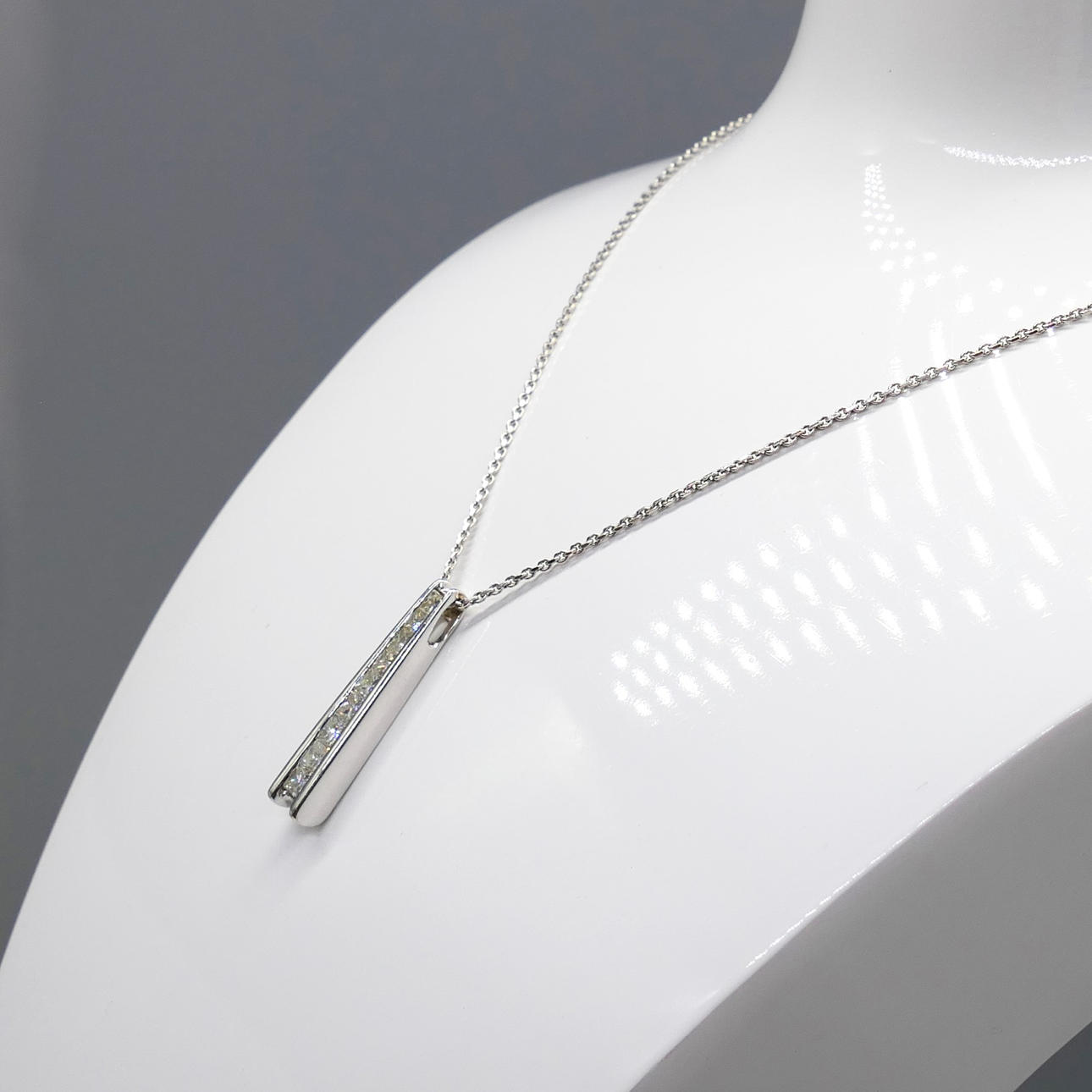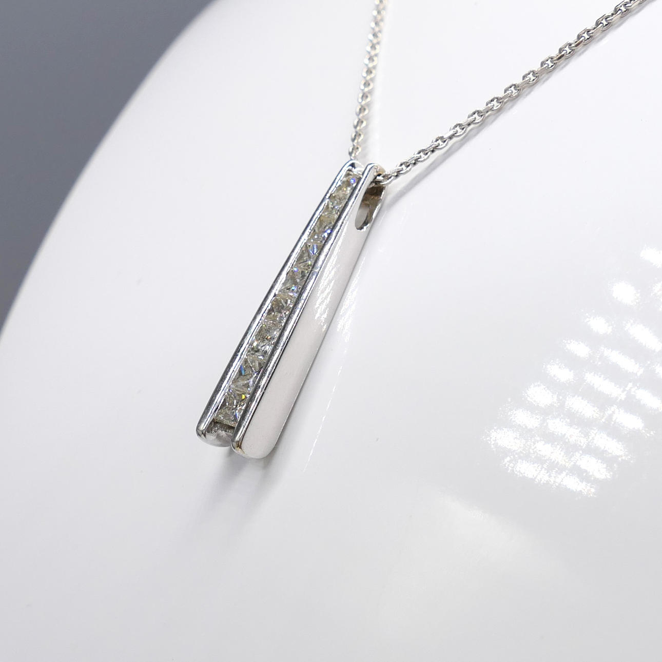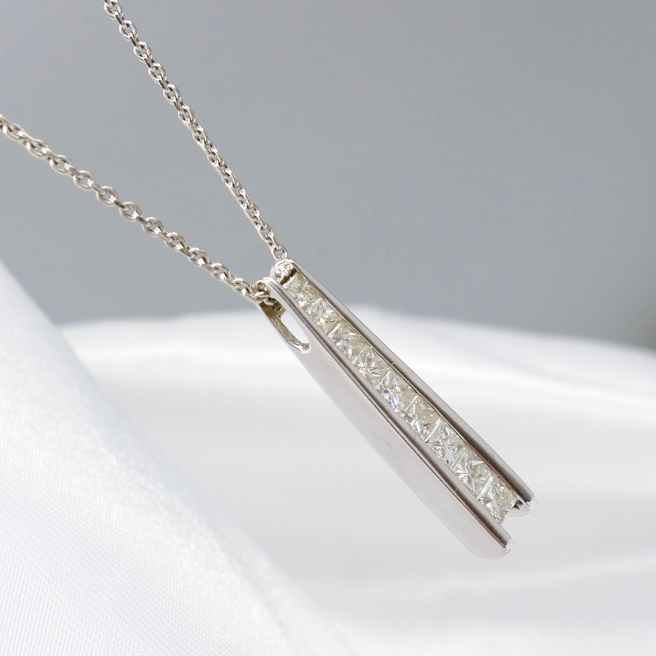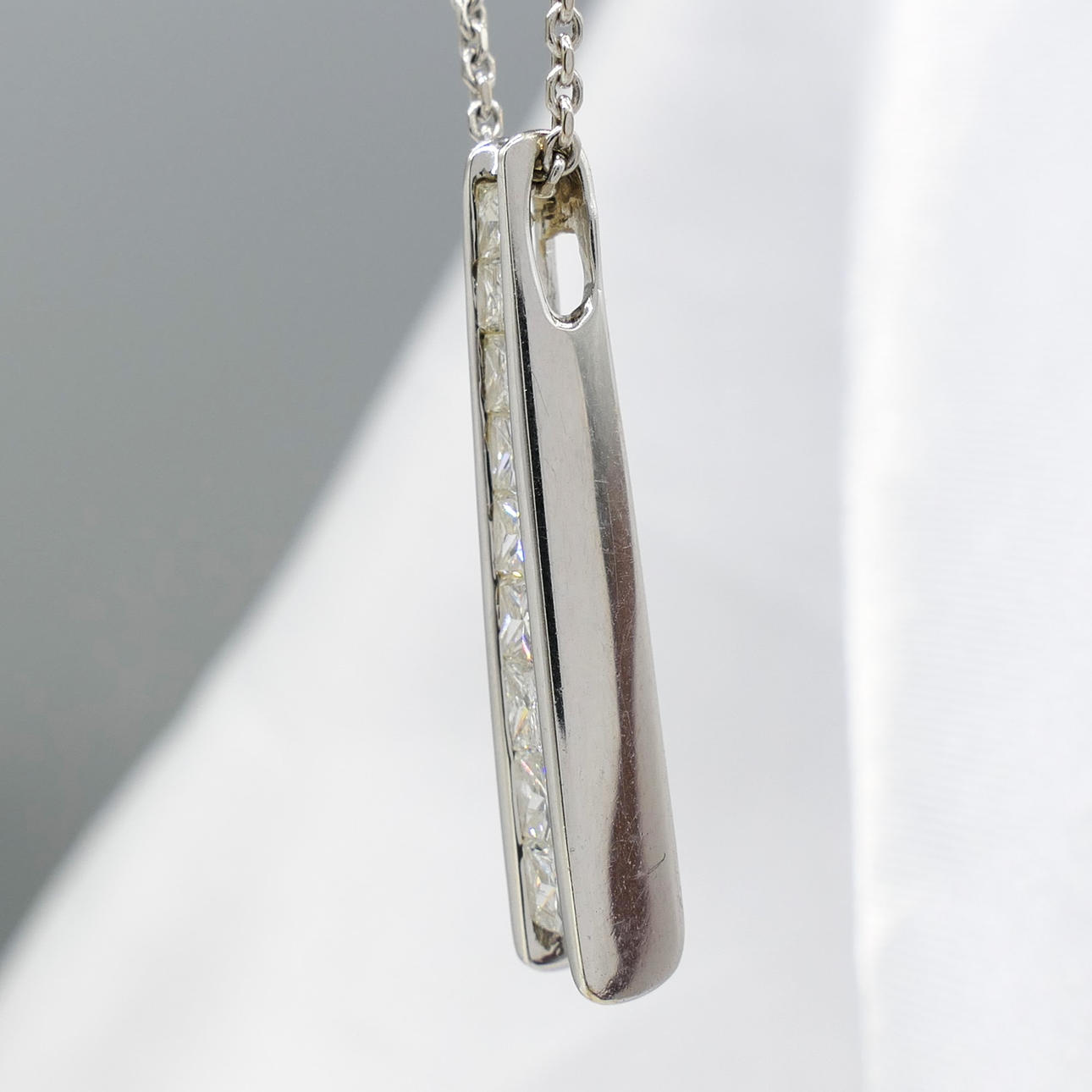Pendant: 18k white gold as hallmarked, channel set; 25mm long; weight 2.75 grams