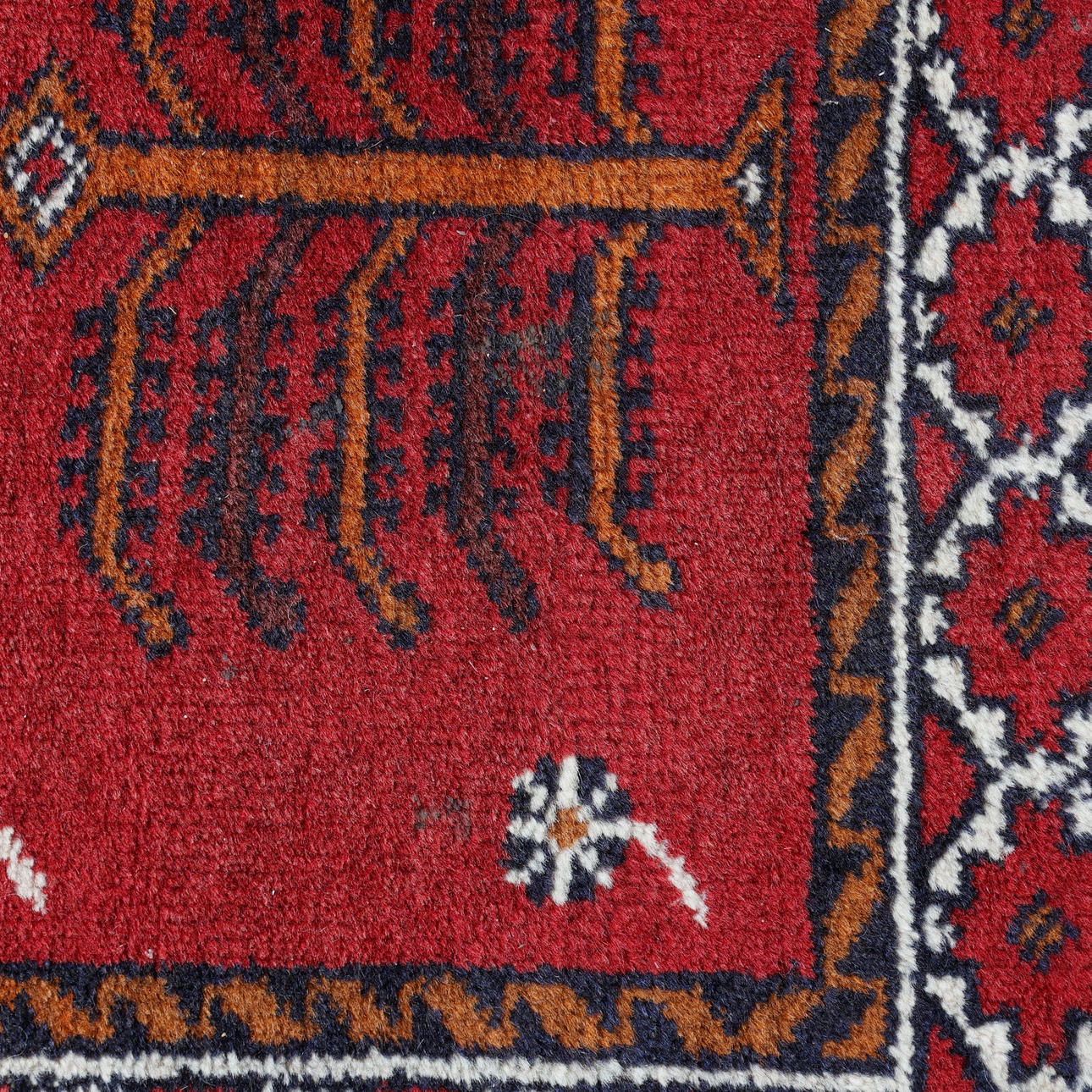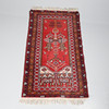 The madder field with stylised decoration, within multiple rosette and geometric border, 140 x 81cm.