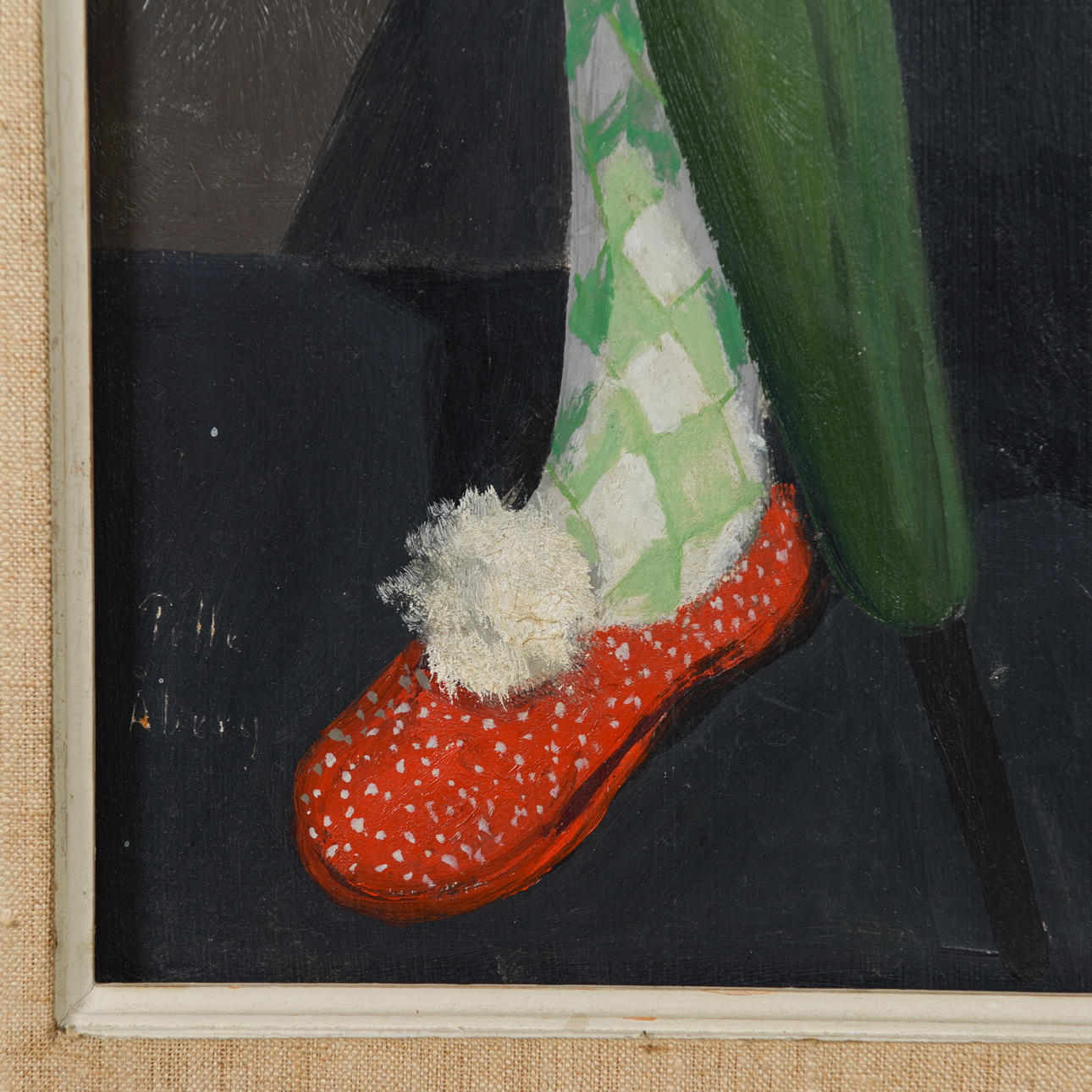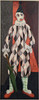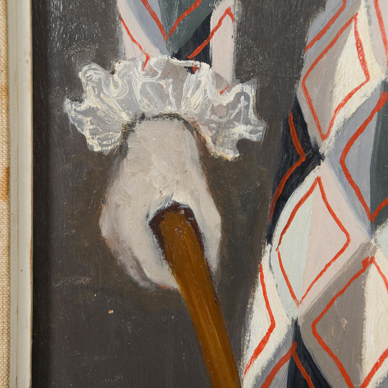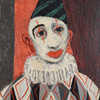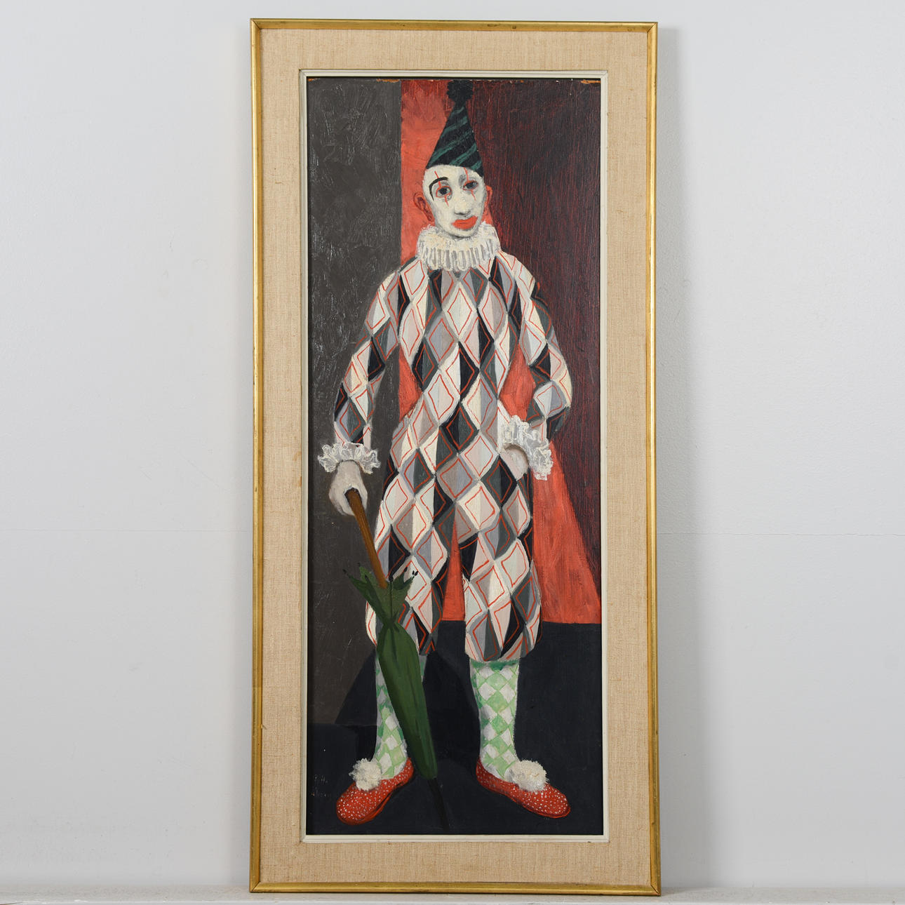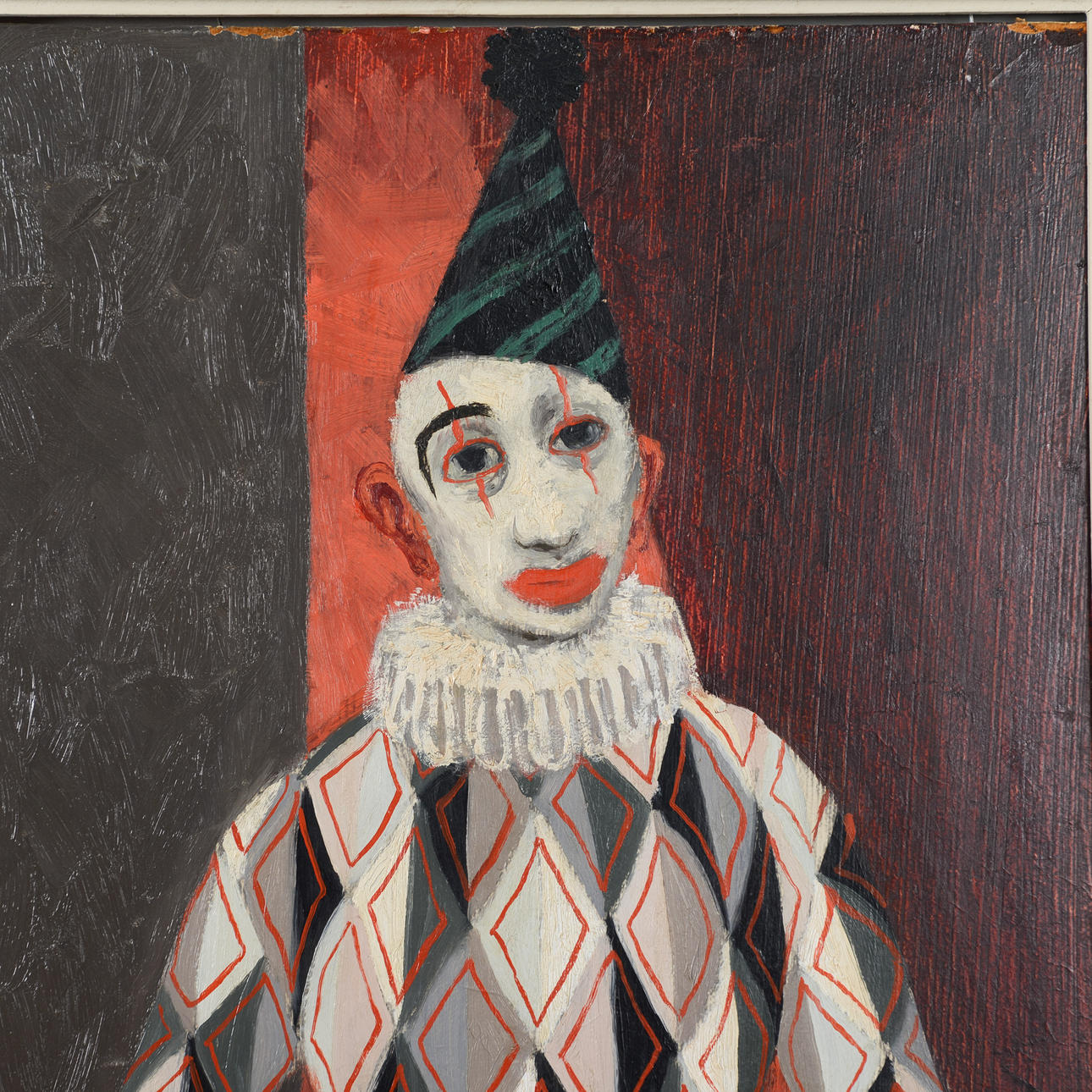 This work by Pelle Åberg depicts a lone jester or harlequin, positioned frontally against a vertically divided fund in dark grey-black and red. The motif is related to Åberg's recurring interest in clowns and folk life types from the city's environments. Here the jester appears not as a comic figure but as a still, almost melancholic figure. The theatrical character is clear and can be related to Åberg's long career as a decorator at Södra teatern and Scalateatern.