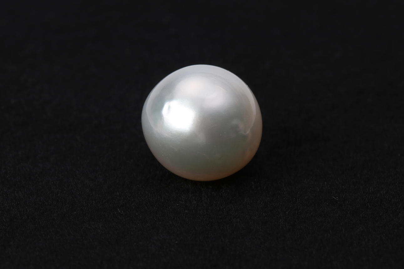 A cultured gem about 13.1 mm, probably South Sea with even prominent luster.