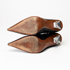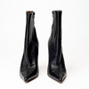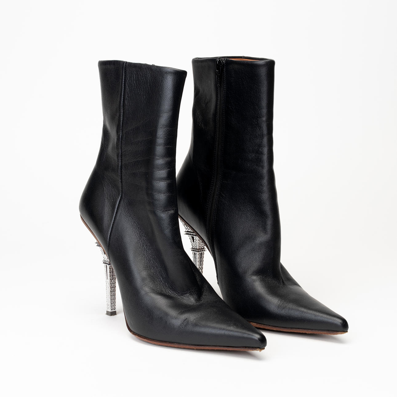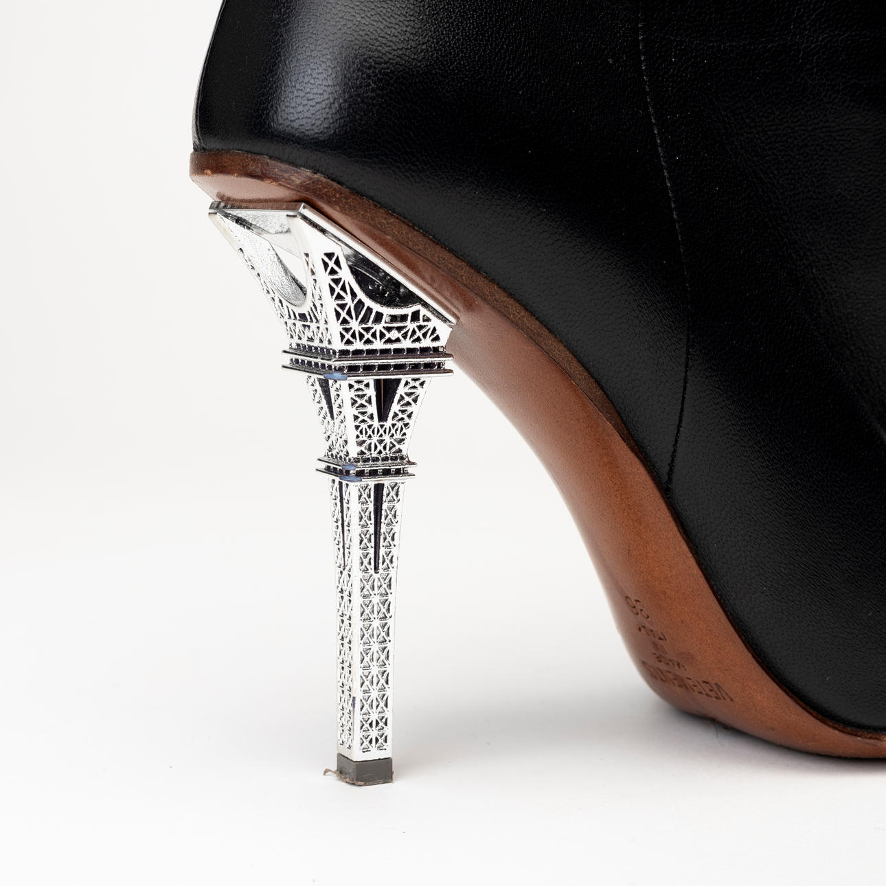 Black leather with silvery stiletto heel in the shape of the Eiffel Tower, height approx. 9.5 cm. Tagged “VETEMENTS”. Enl marking size 36.