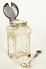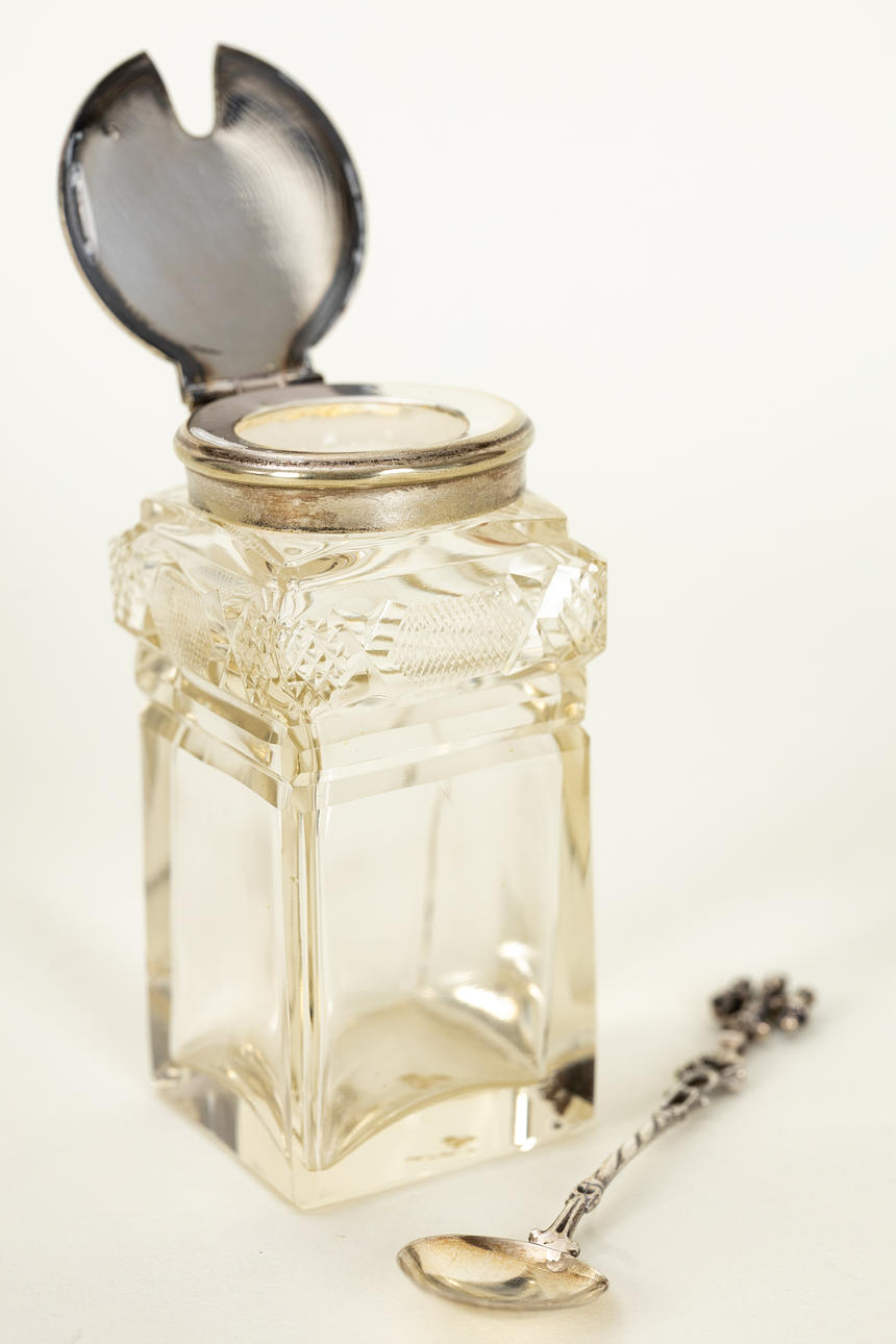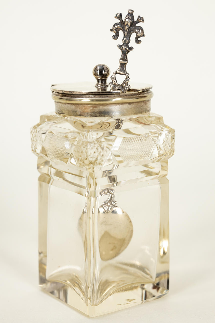 glass mustard pot, silver-plated, h. ca. 9 cm;.