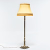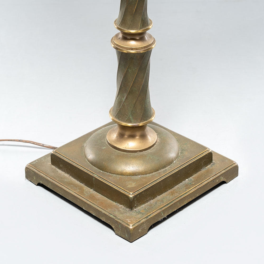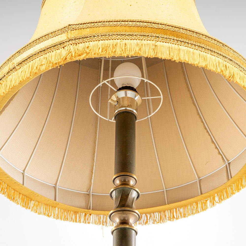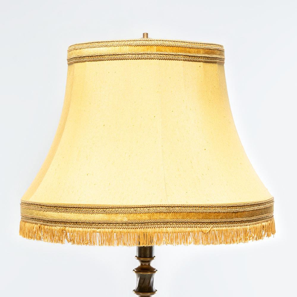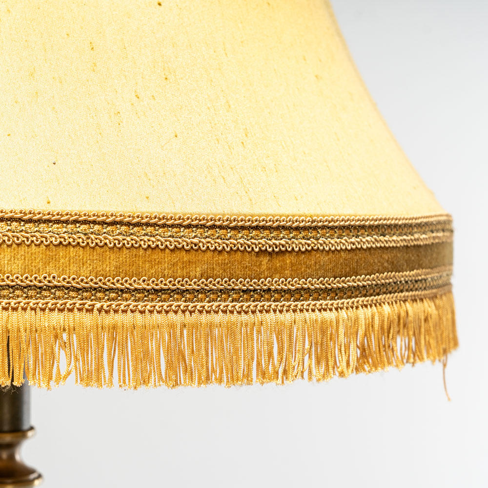 Twisted pillar on square foot. Brass-colored surface. Large textile screen with decorative fringe.