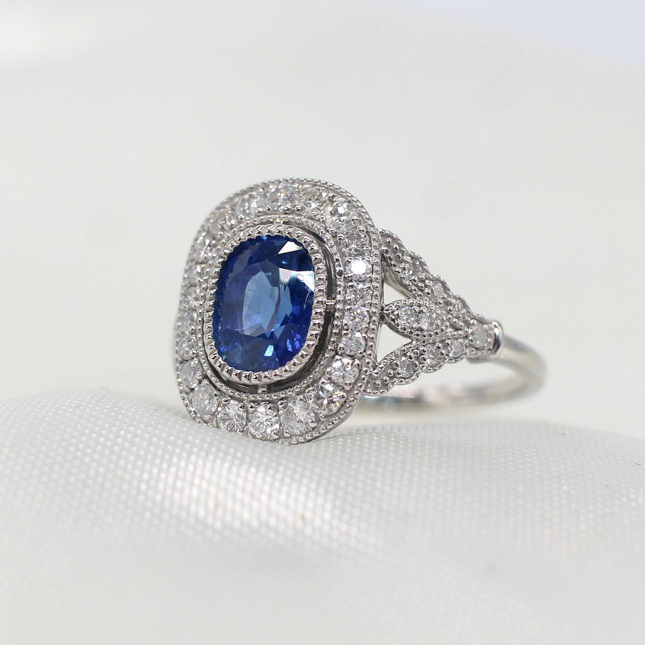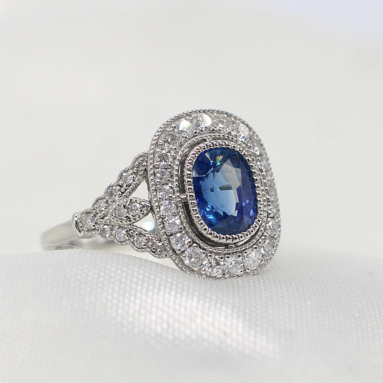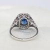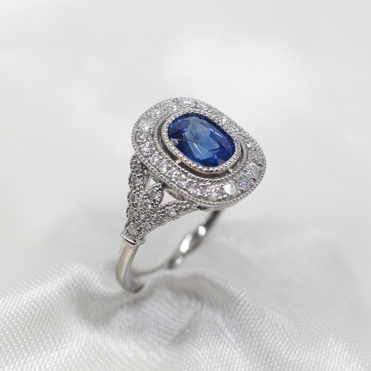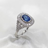 A beautiful platinum (stamped PT950) art deco style ring set with oval sapphire and diamonds.
