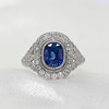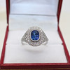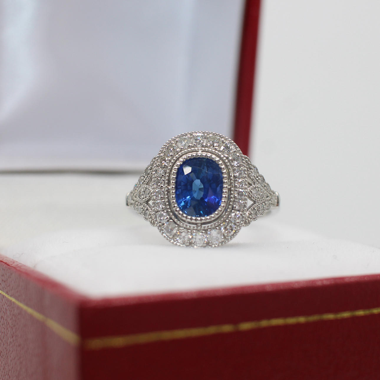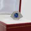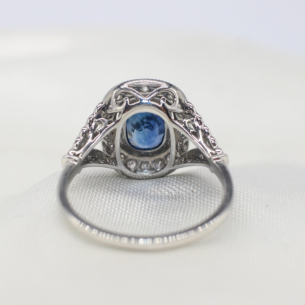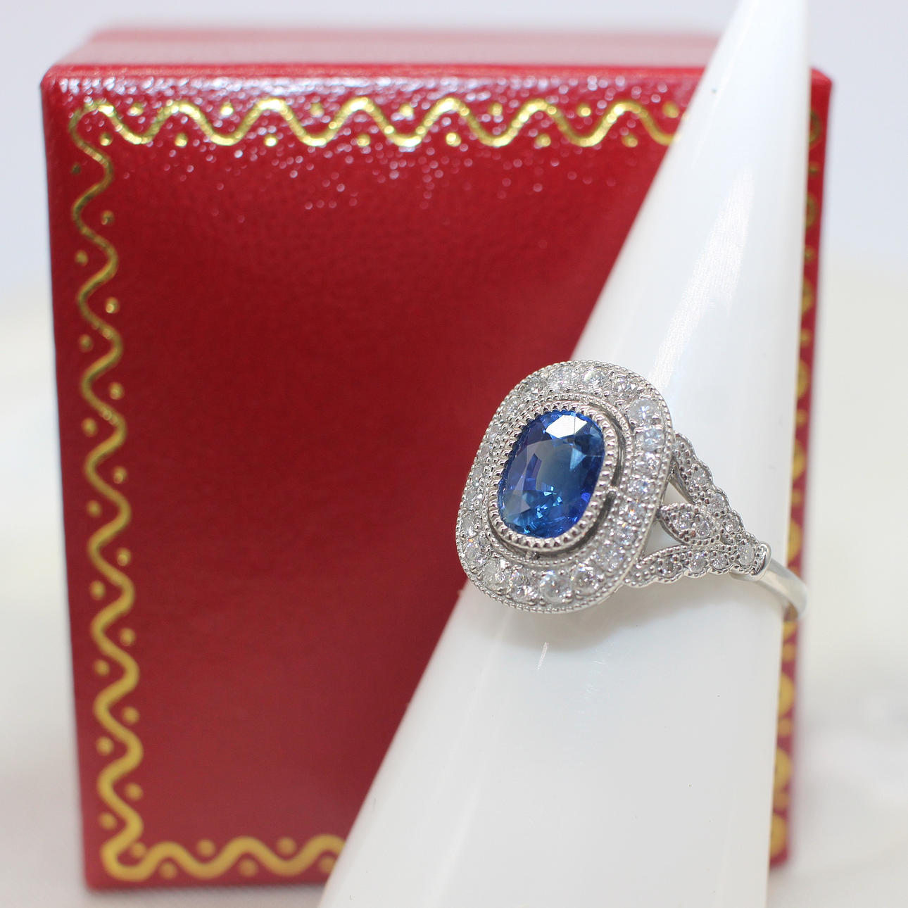 A beautiful platinum (stamped PT950) art deco style ring set with oval sapphire and diamonds.