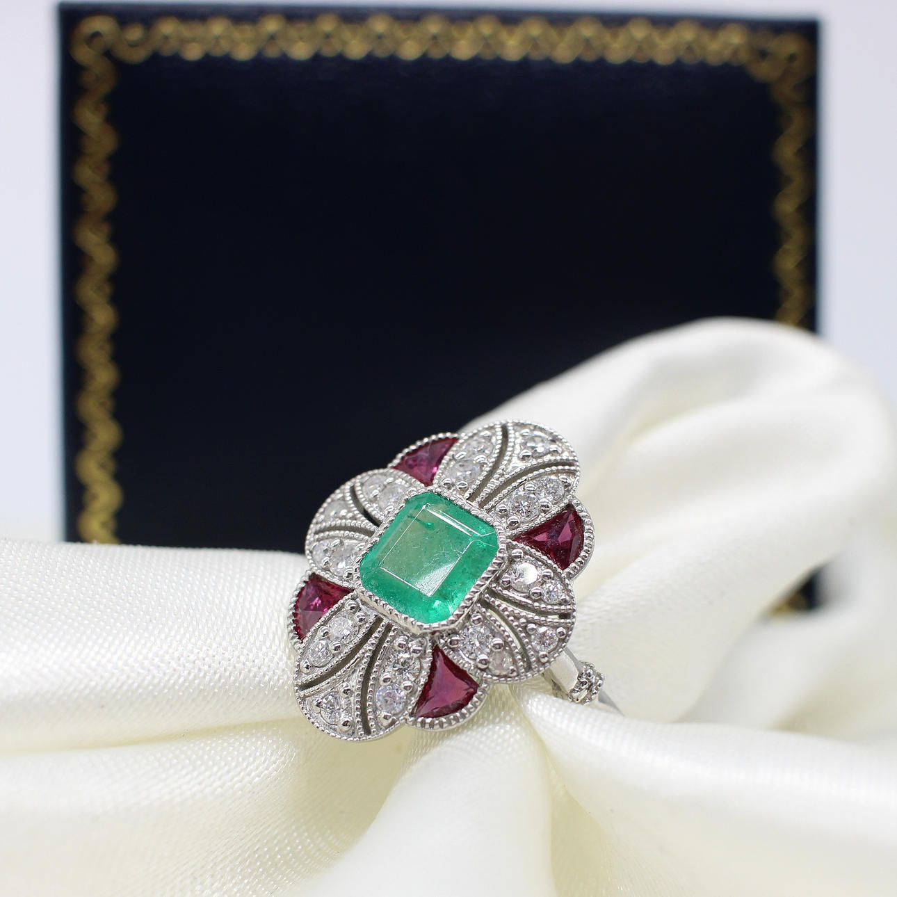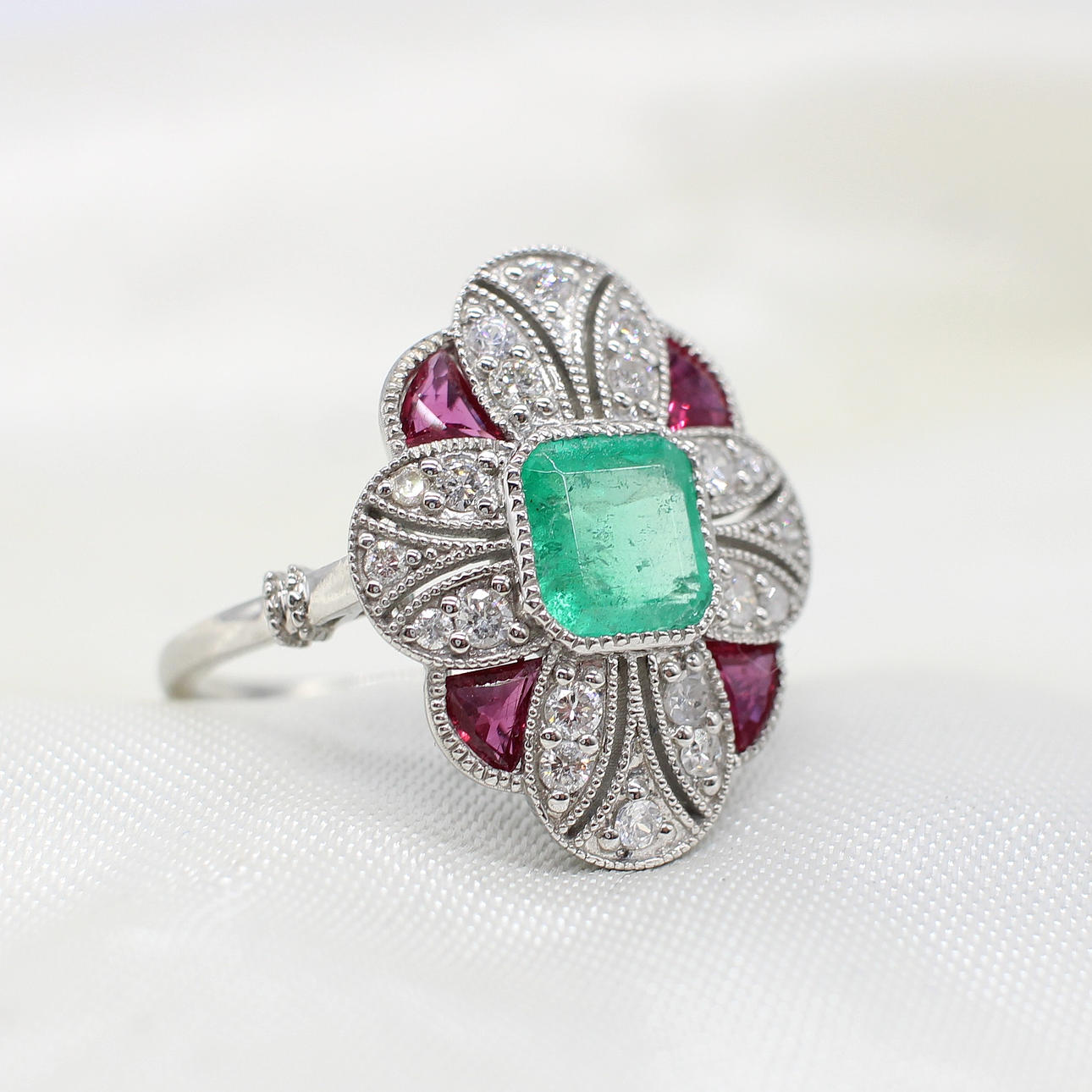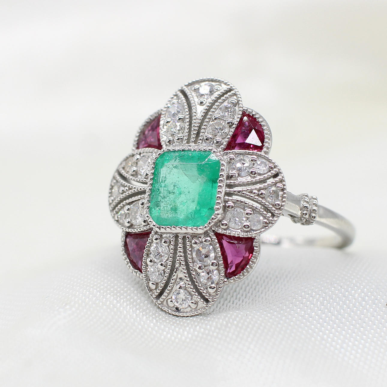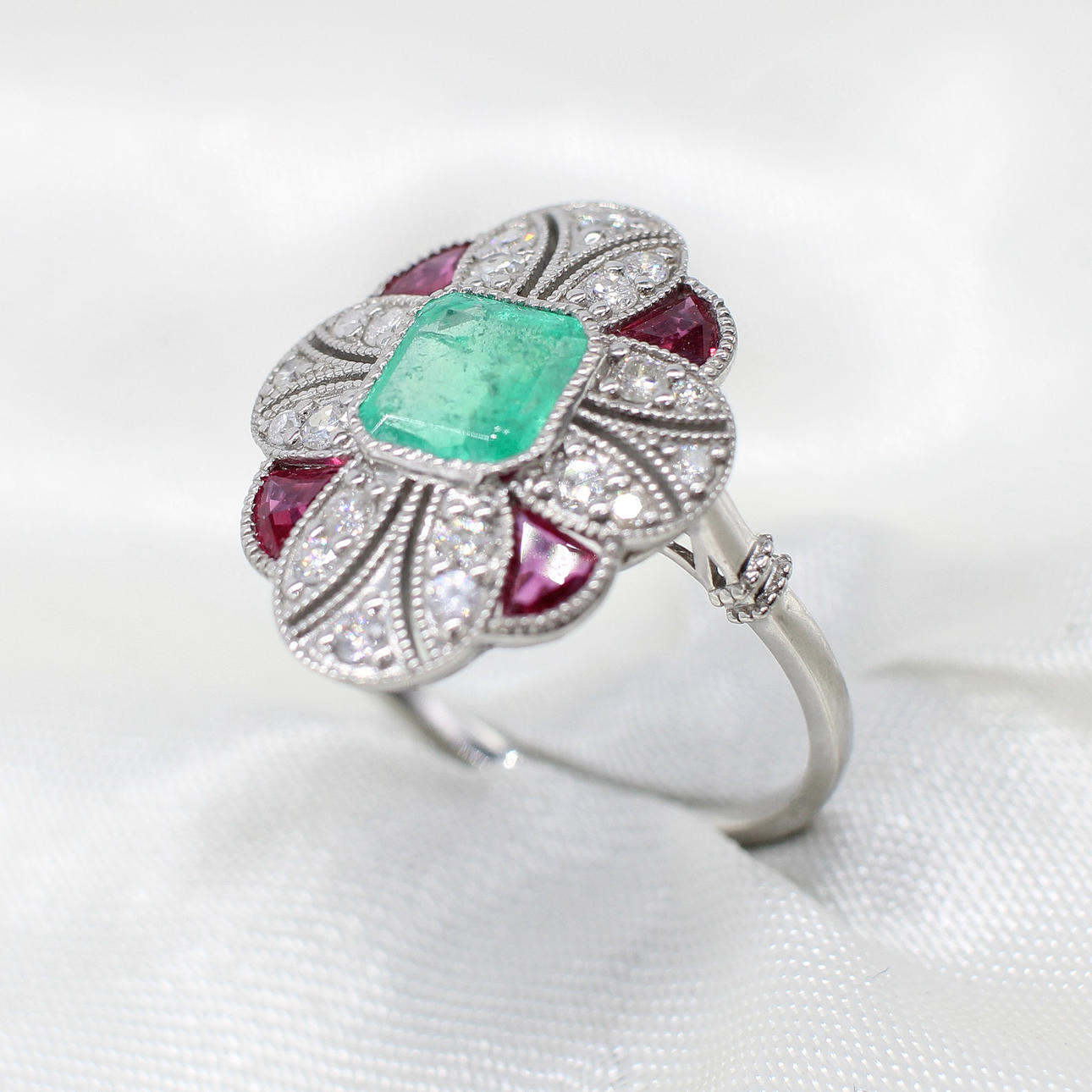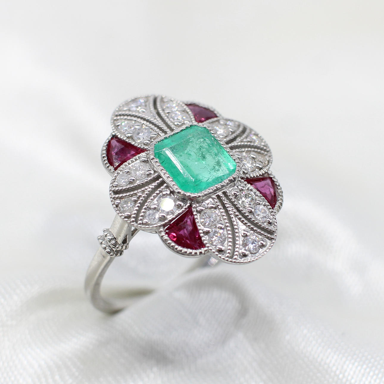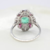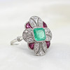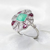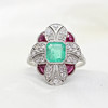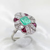 A platinum (stamped PT950) art deco style ring set with central cushion cut emerald, rubies and diamonds.