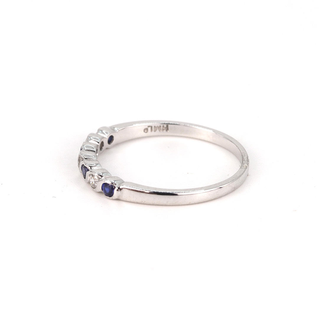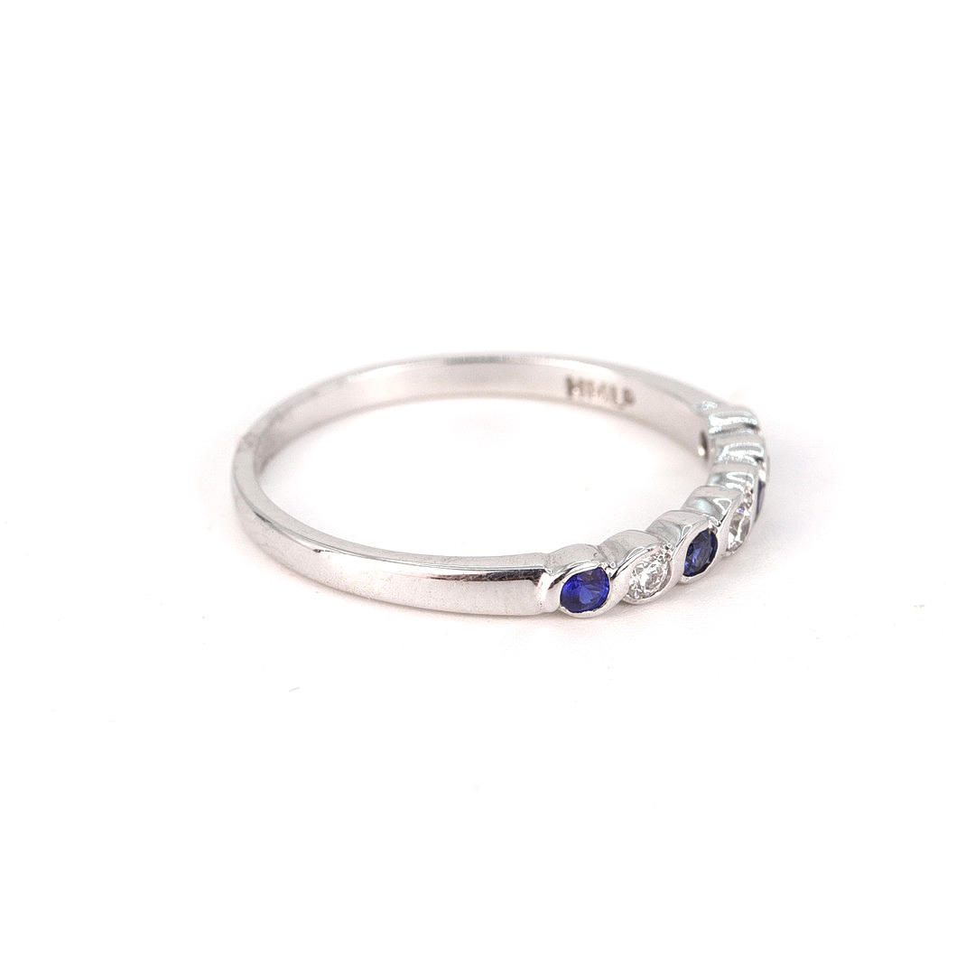 An 18K withe gold ring set with diamonds and blue stones.