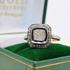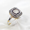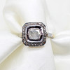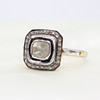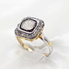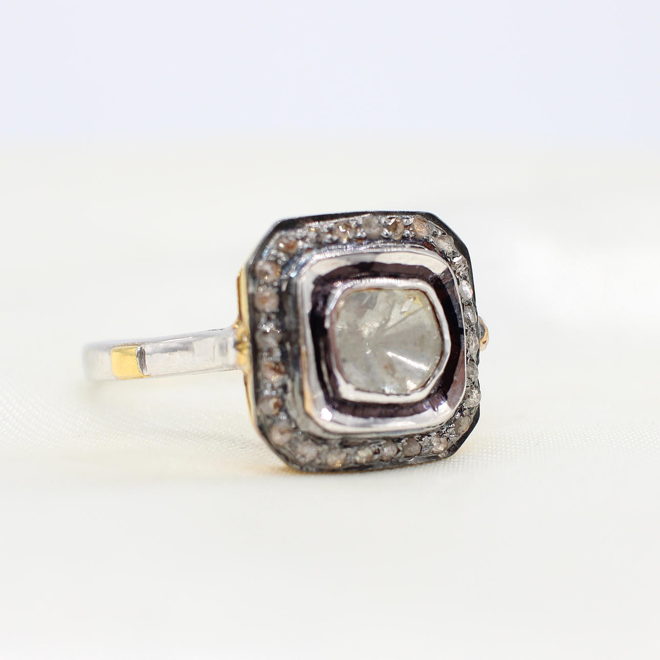 A silver and silver gilt (unmarked but tested as 925) ring with gold (tested) side nibs, set with a central polki diamond surrounded by a further halo of rose cut diamonds.