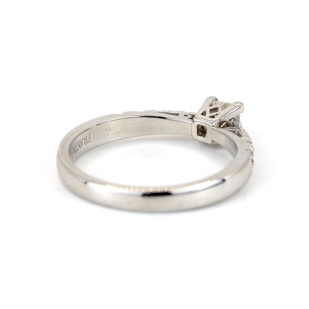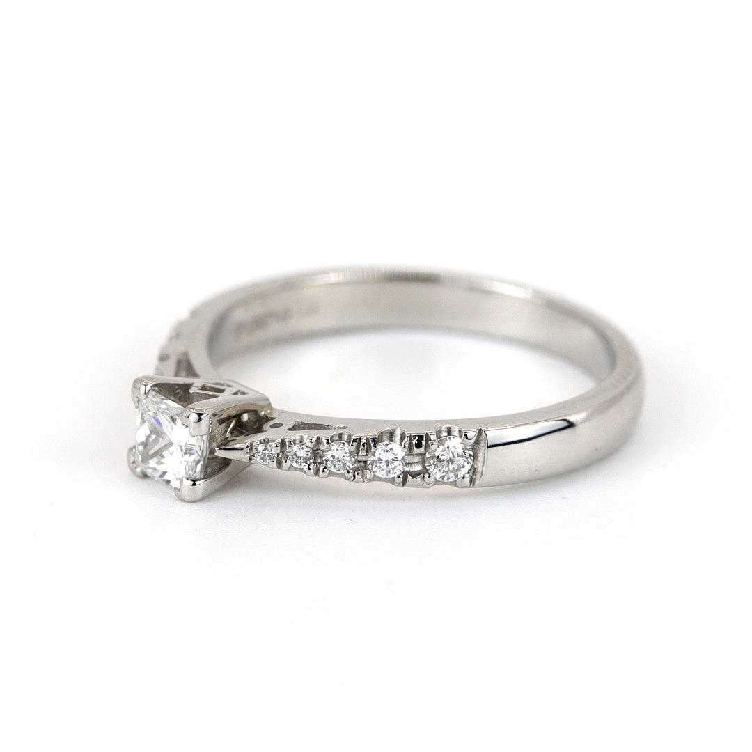A platinum solitaire ring set with princes cut diamond (dia. 0,25ct.) and brilliant cut diamonds to the shoulders (dia total. 0,11ct approx. )