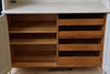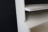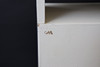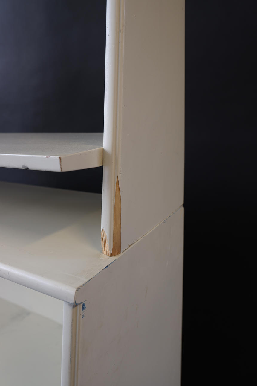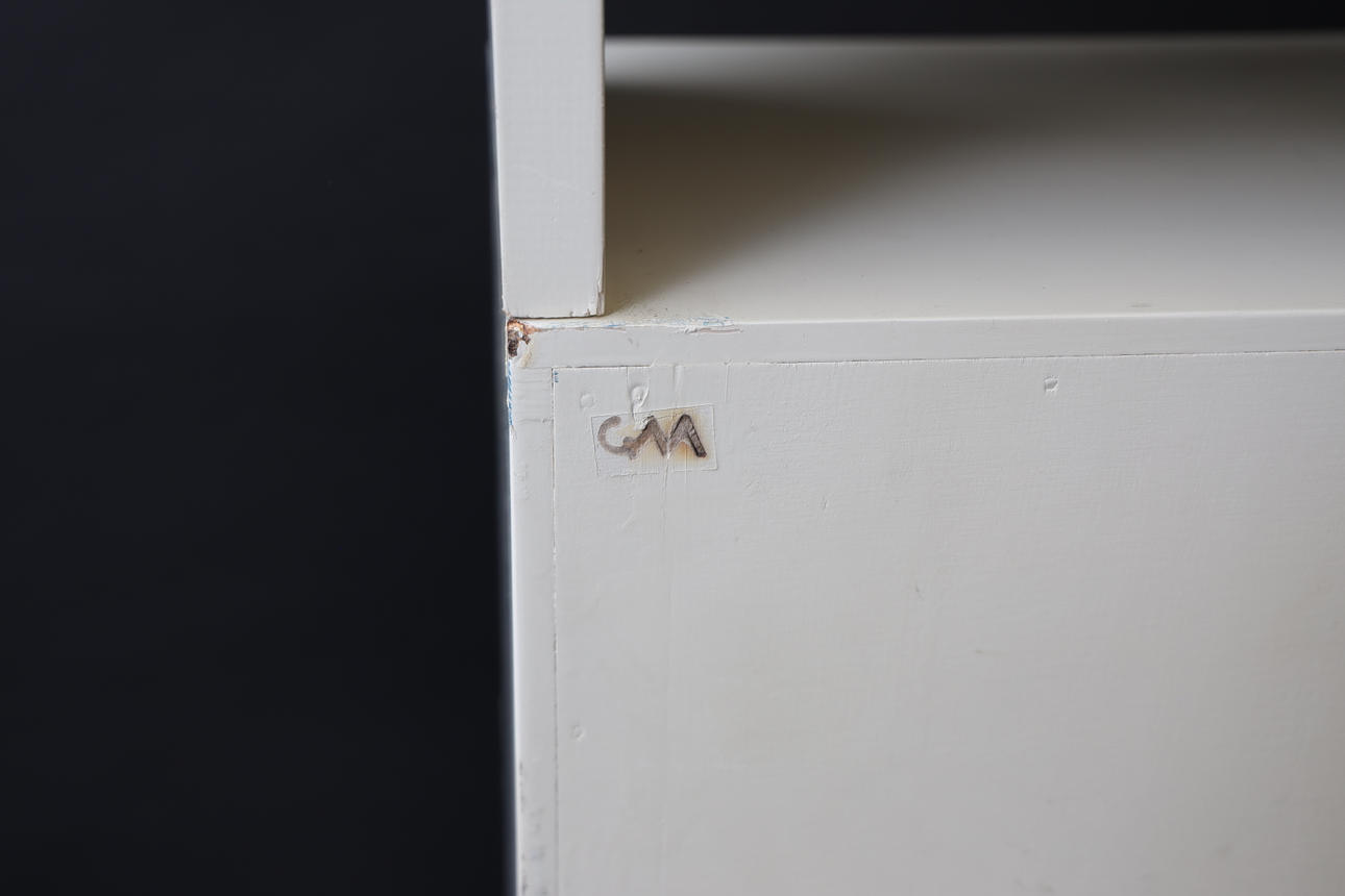 White lacquered wood, at the bottom with double doors. Removable top with a removable shelf and two fixed. Branded.