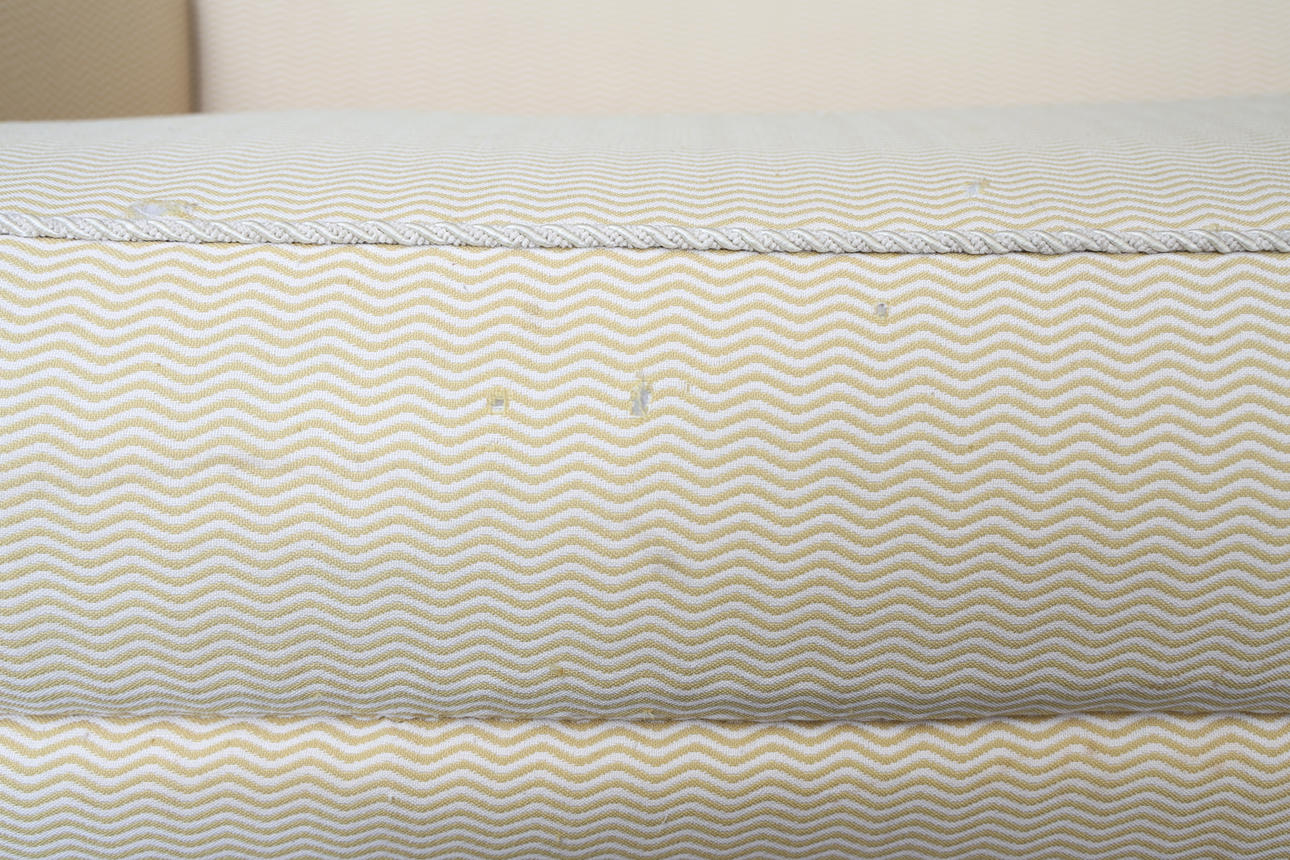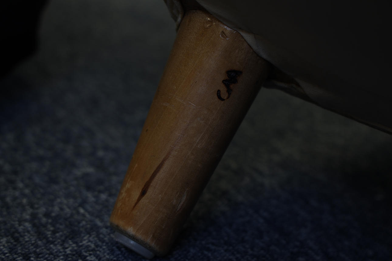 Textile upholstery. Lacquered legs made of wood. Branded.
