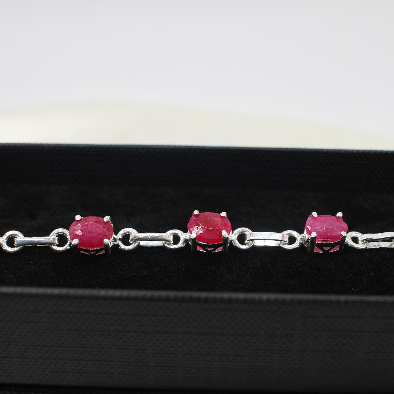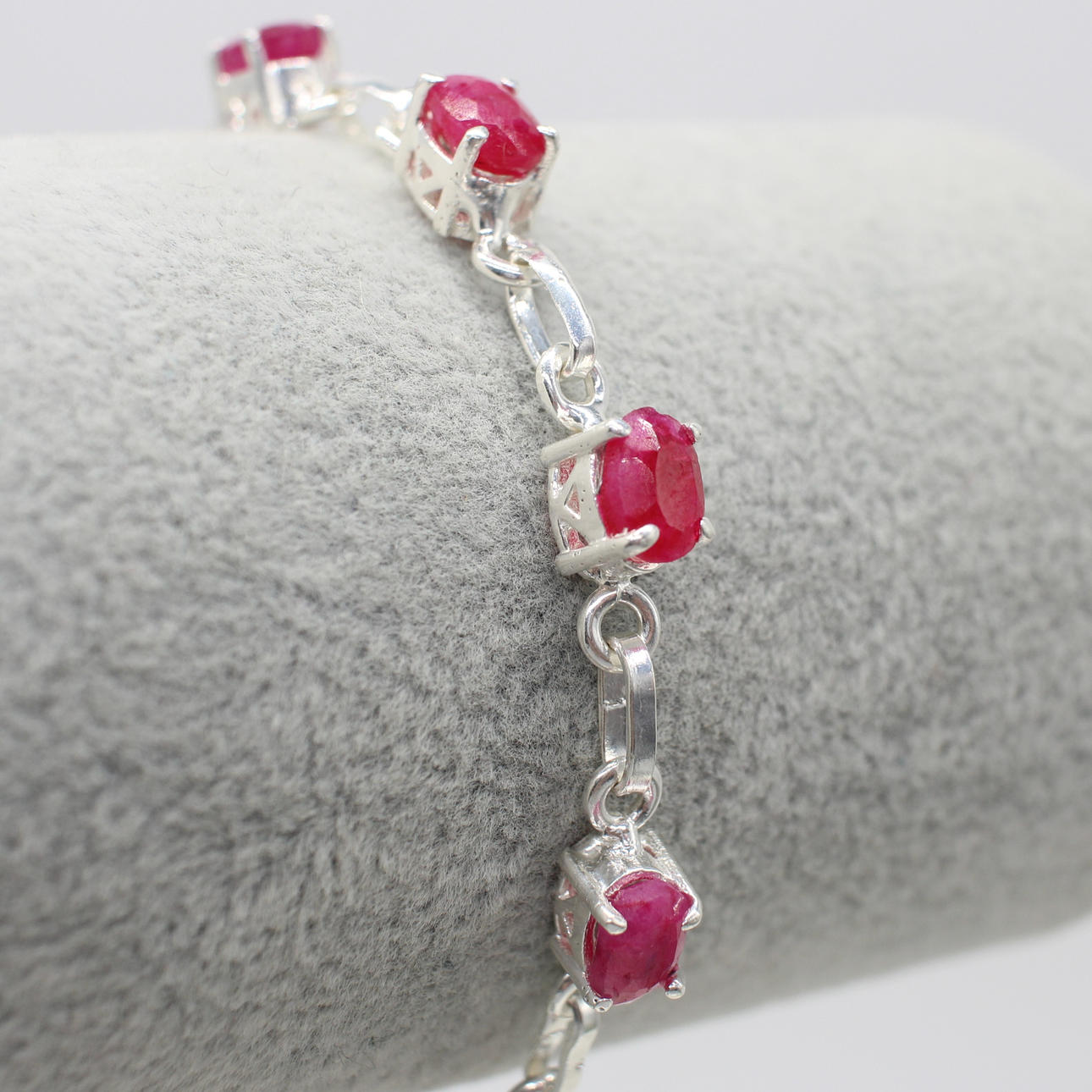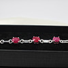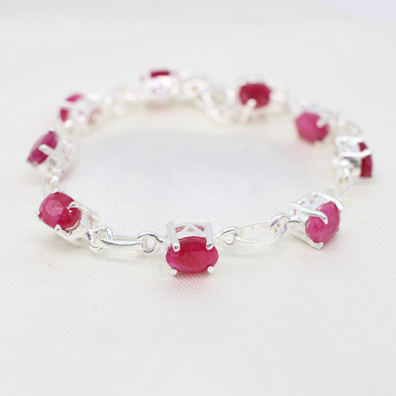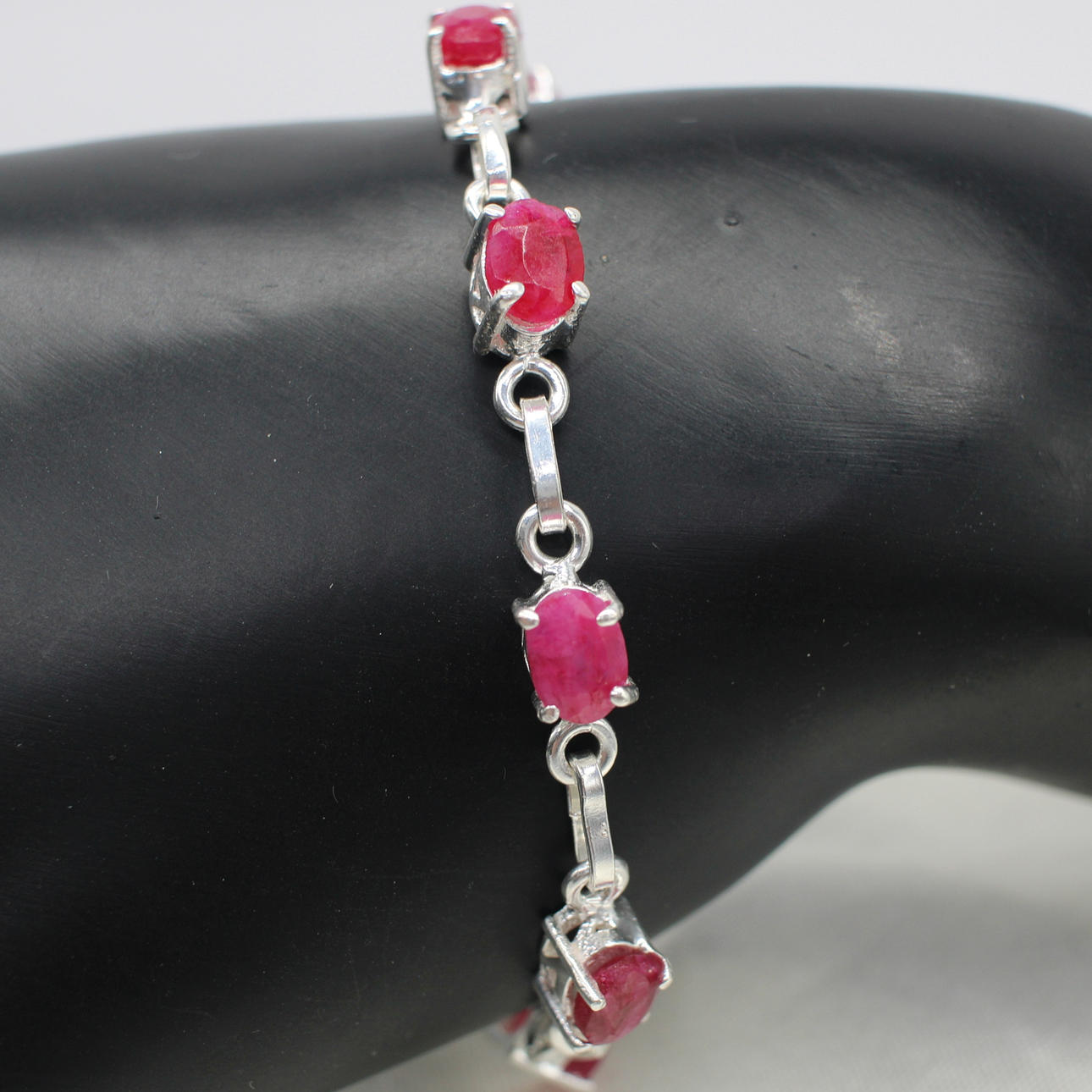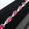 A silver (stamped 925) dress bracelet set with 9 x oval shaped ruby gemstones.