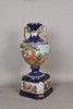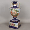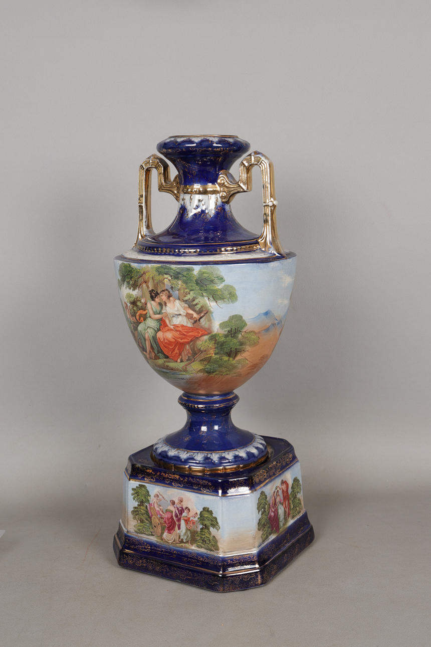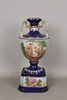 The twin handled vase with a cobalt blue ground paint with classical ladys with cherubs, set ion a stand, 53cm high.