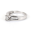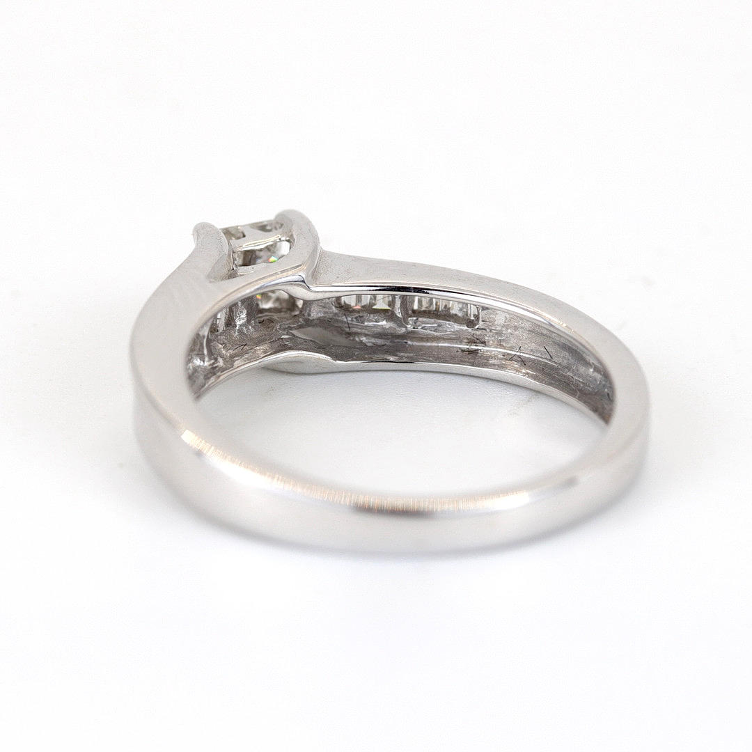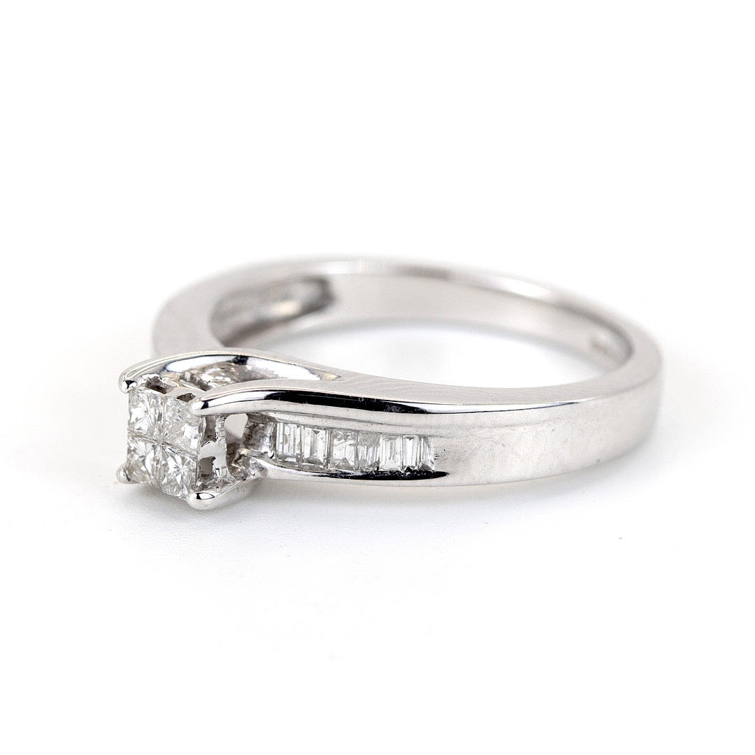 A 14K white gold ring set with four princess cut dimonds and baguette cut diamonds to the shoulders.