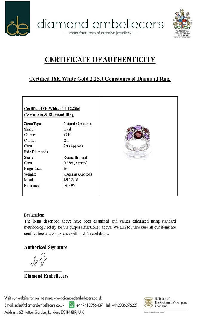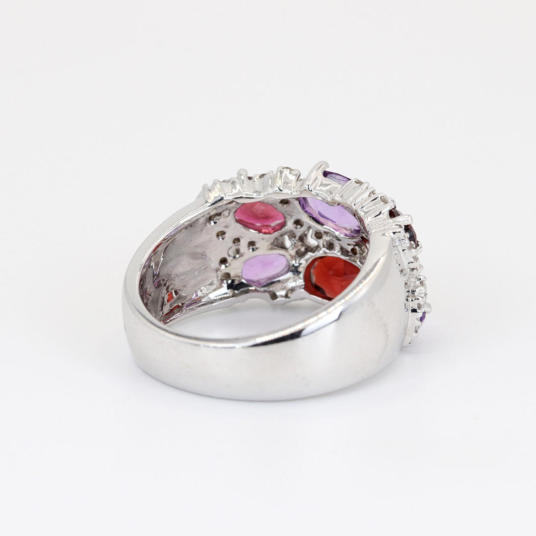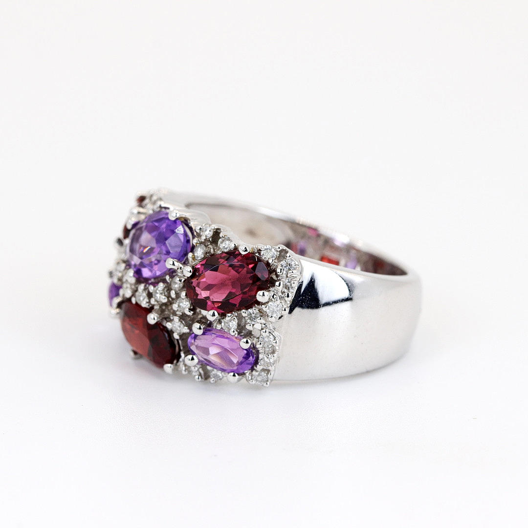 An 18K white gold cluster ring set with oval cut amethysts and garnets surrounded by small diamonds.