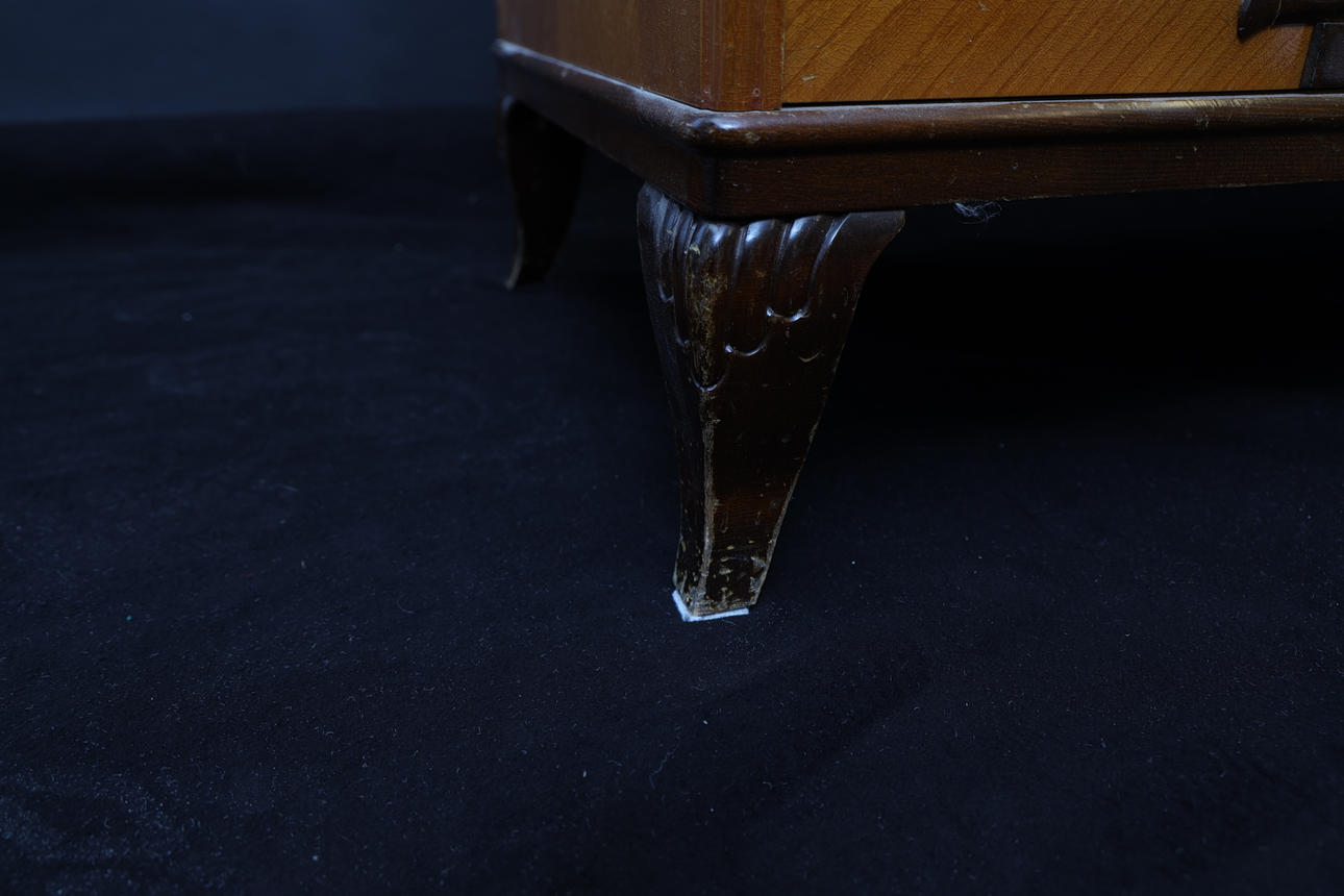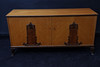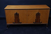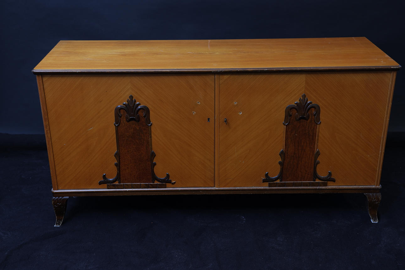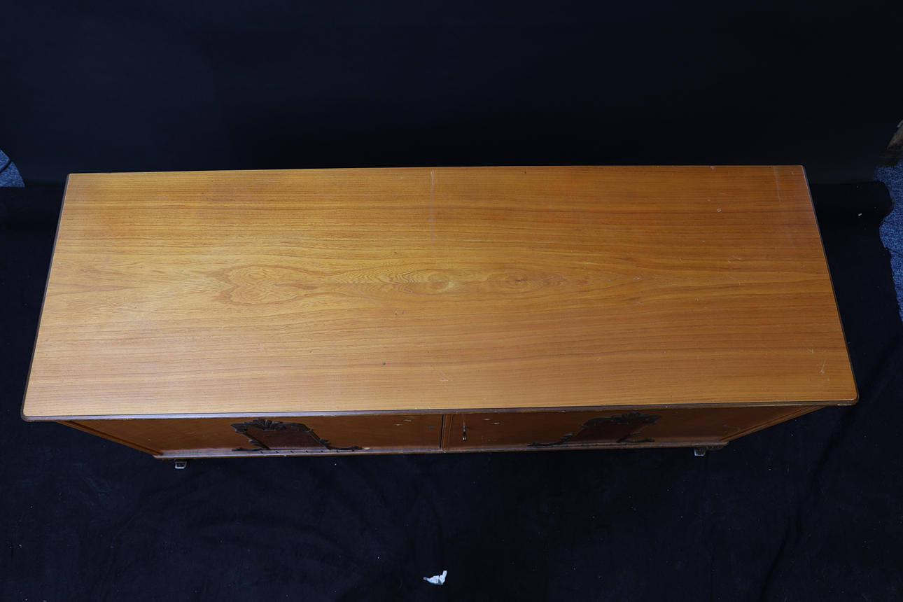 Veneer in elm, among other things. Cut decor. Double doors, inside with 1 shelf and 2 drawers. Height 74cm Width 147 cm Depth 49cm.