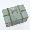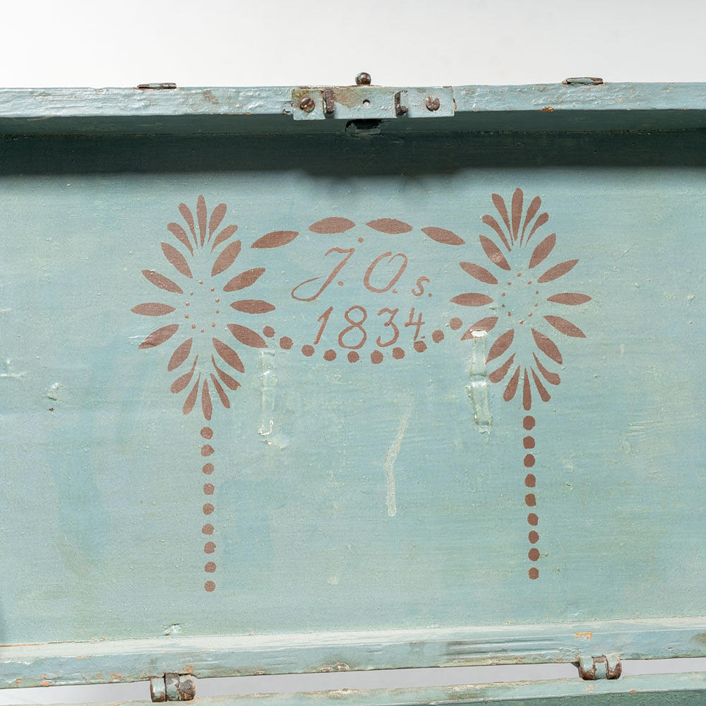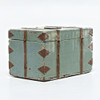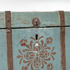 The casket is painted in a blue-green color with a brown, symmetrical decorative pattern on the front.