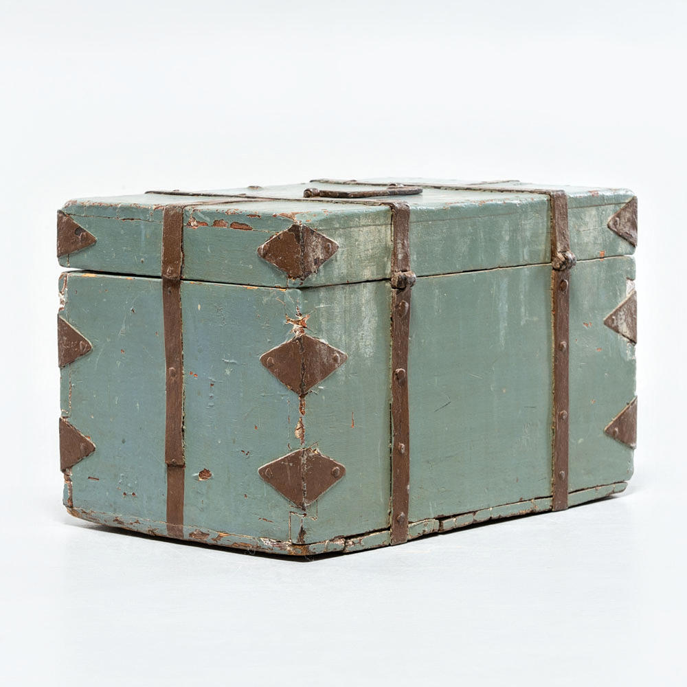 Wrought iron metal fittings in corners and as ties around the casket,