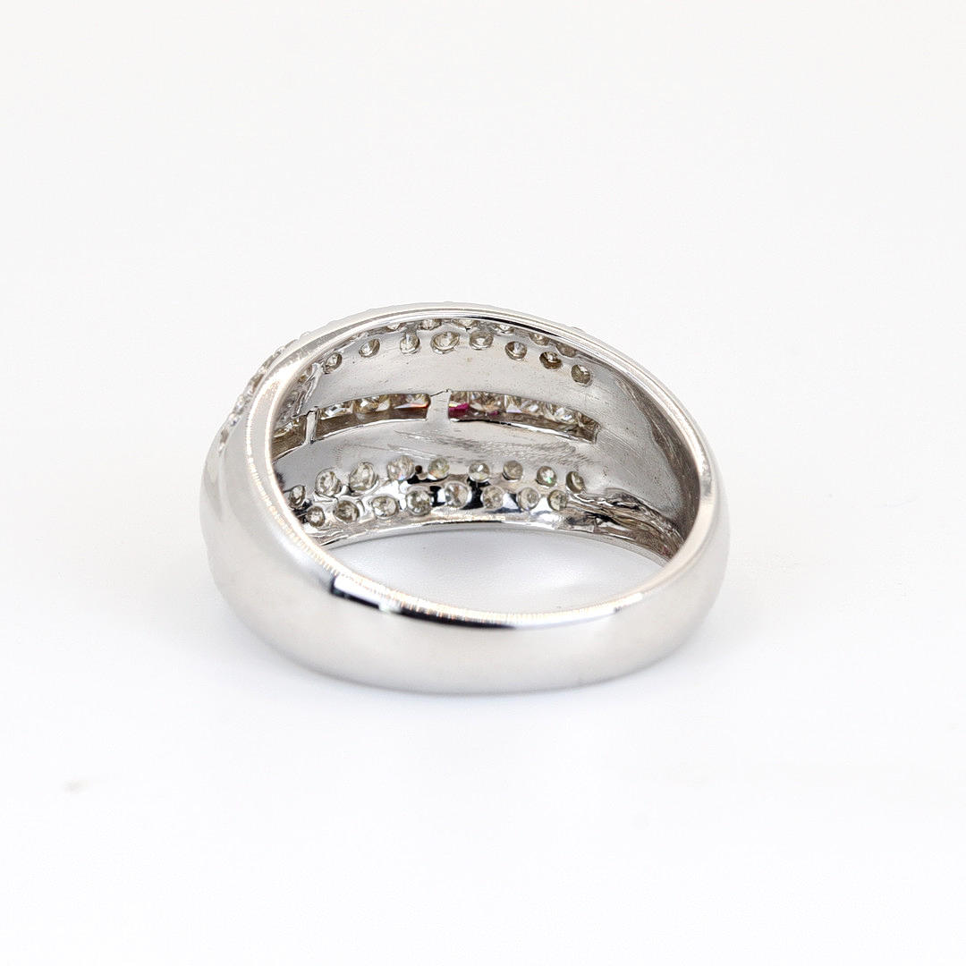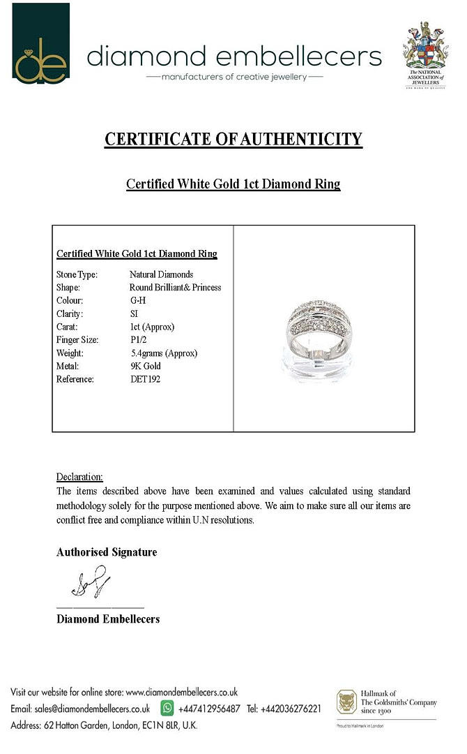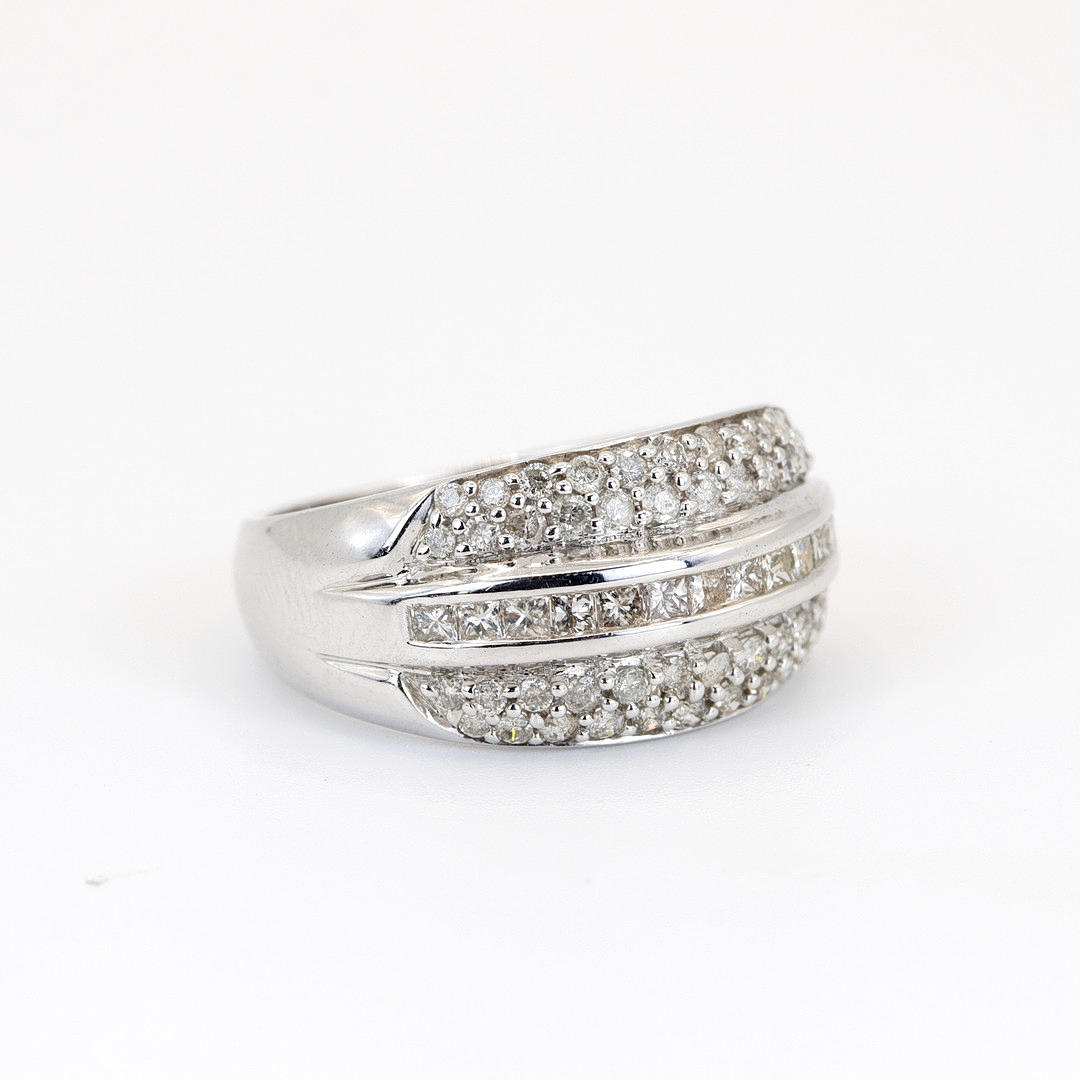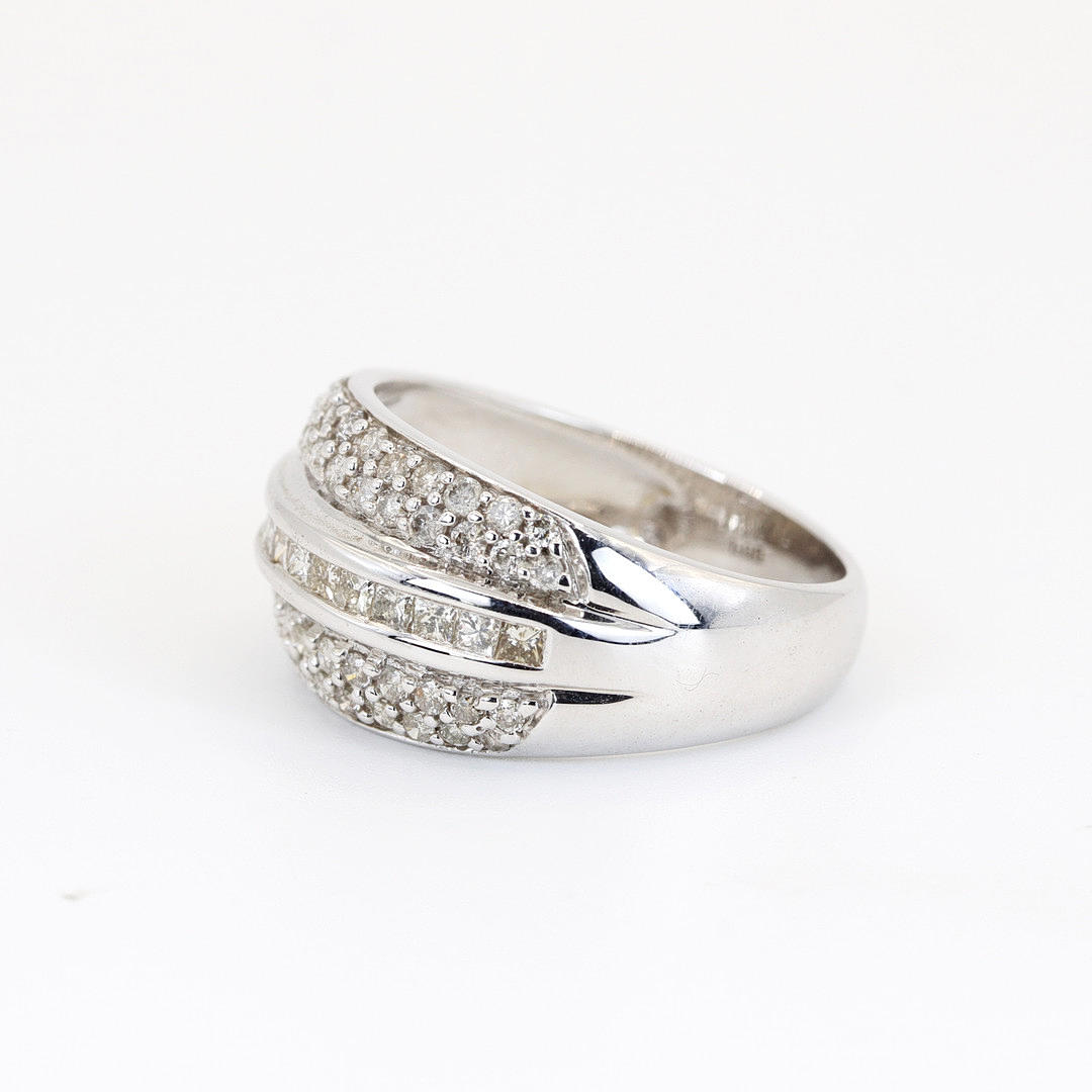9K White gold ring set with round brilliant cut and princess cut diamonds. Dia. total: 1ct. Colour: G-I. Clarity: SI.