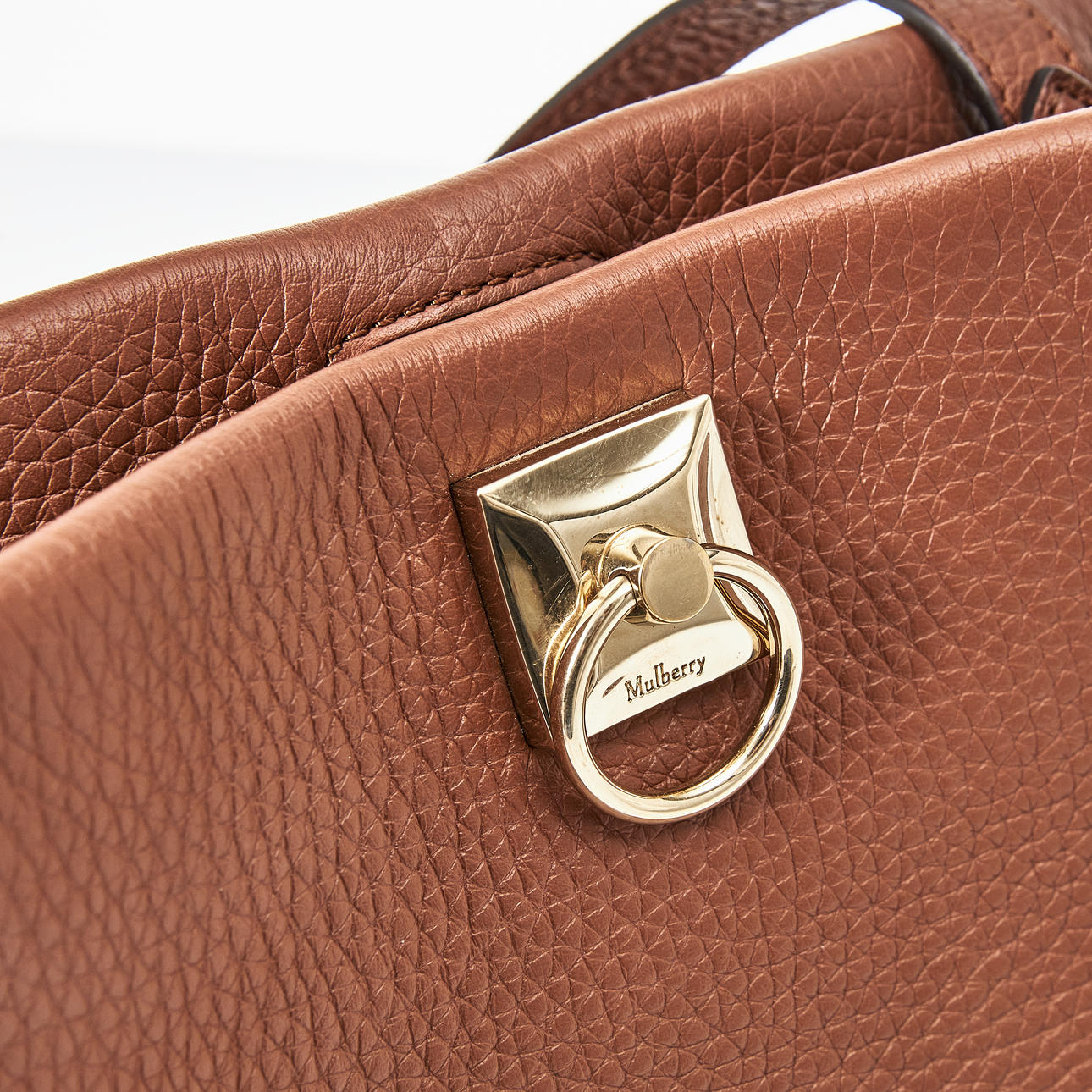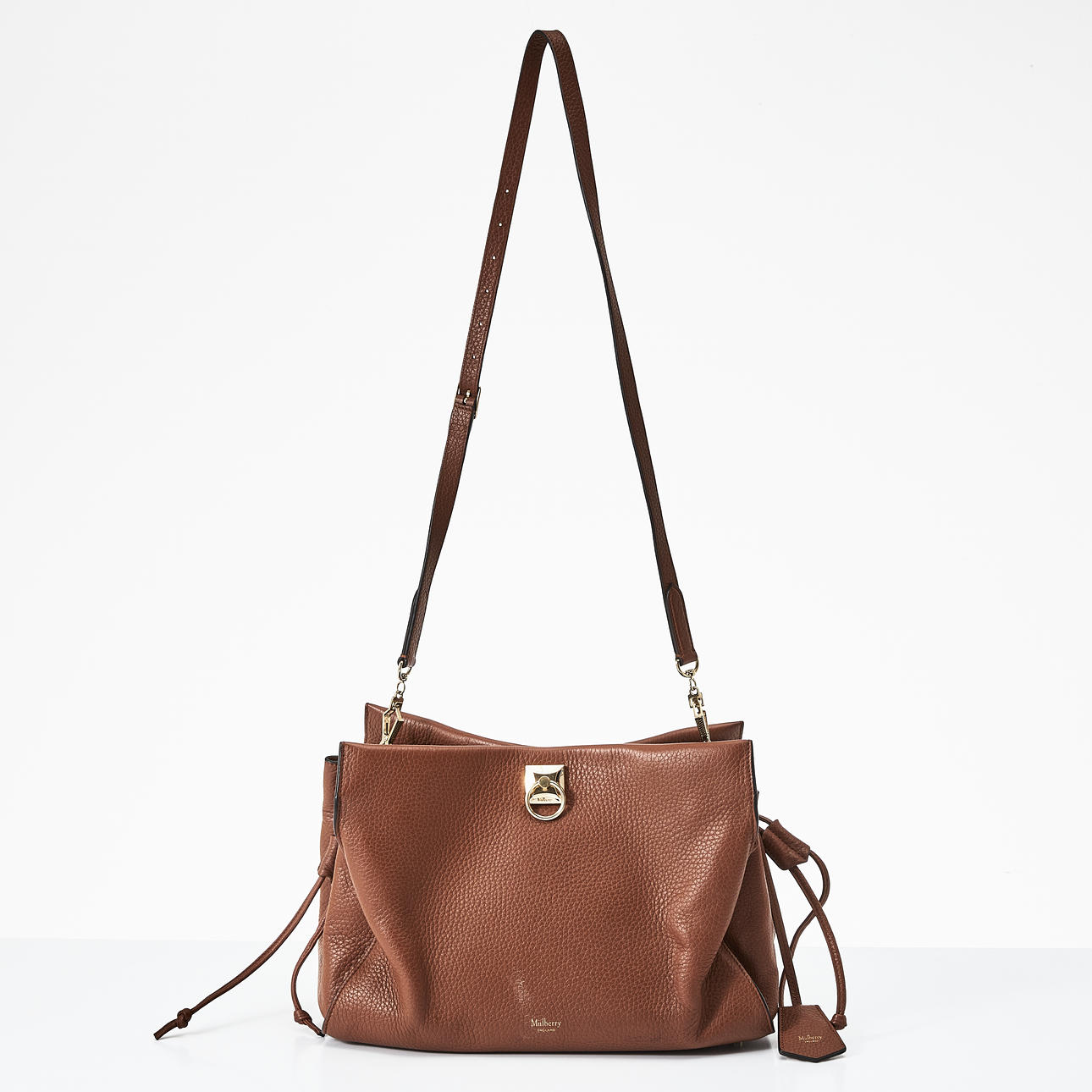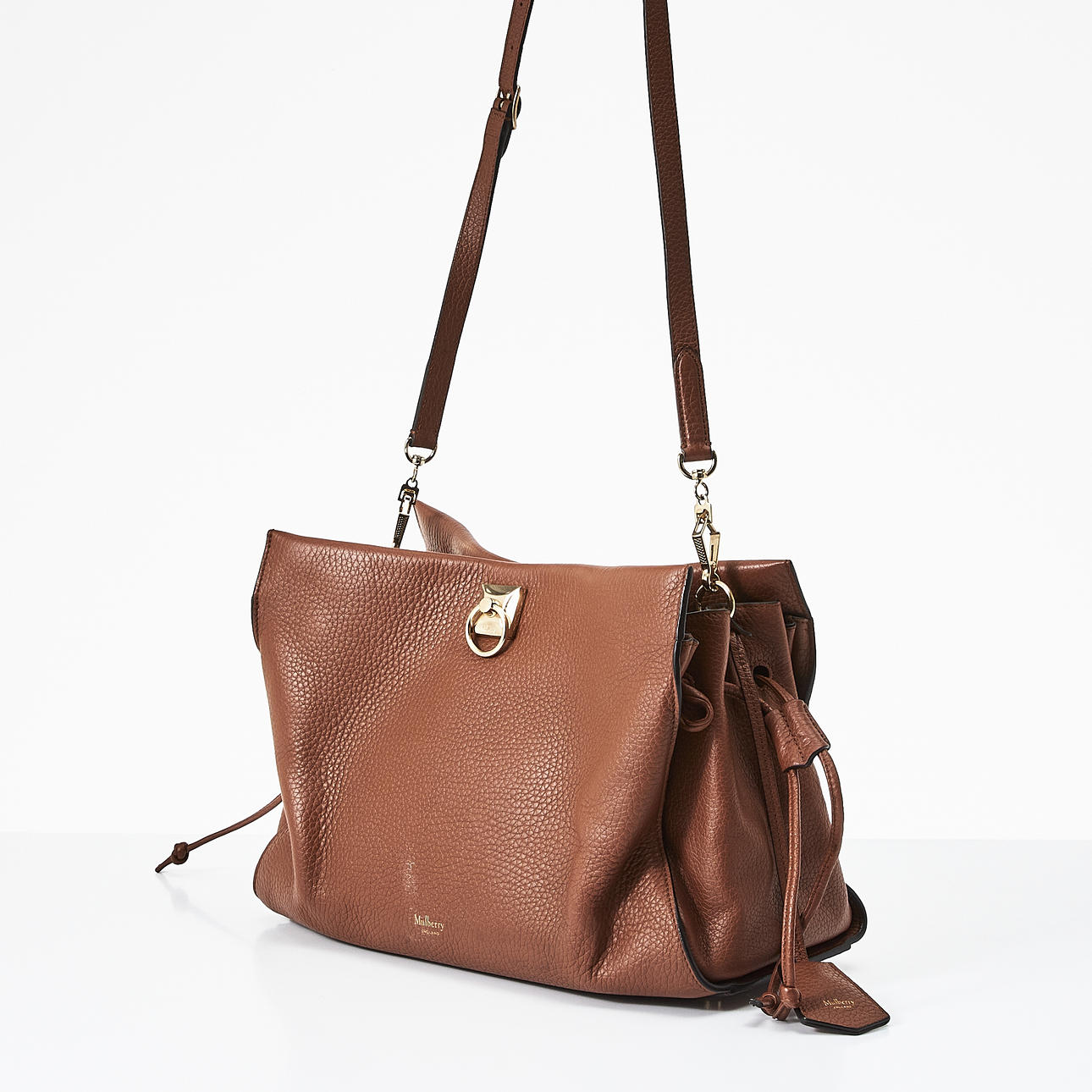 Embossed, brown leather, front detail in yellow metal, drawstring at the sides, magnetic closure, adjustable and removable crossbody strap, lined in matching suede, inside with two pockets, one with zipper, marked "Mulberry England”, clochette with keychain, dimensions approx. 35 x 26 x 16 cm.