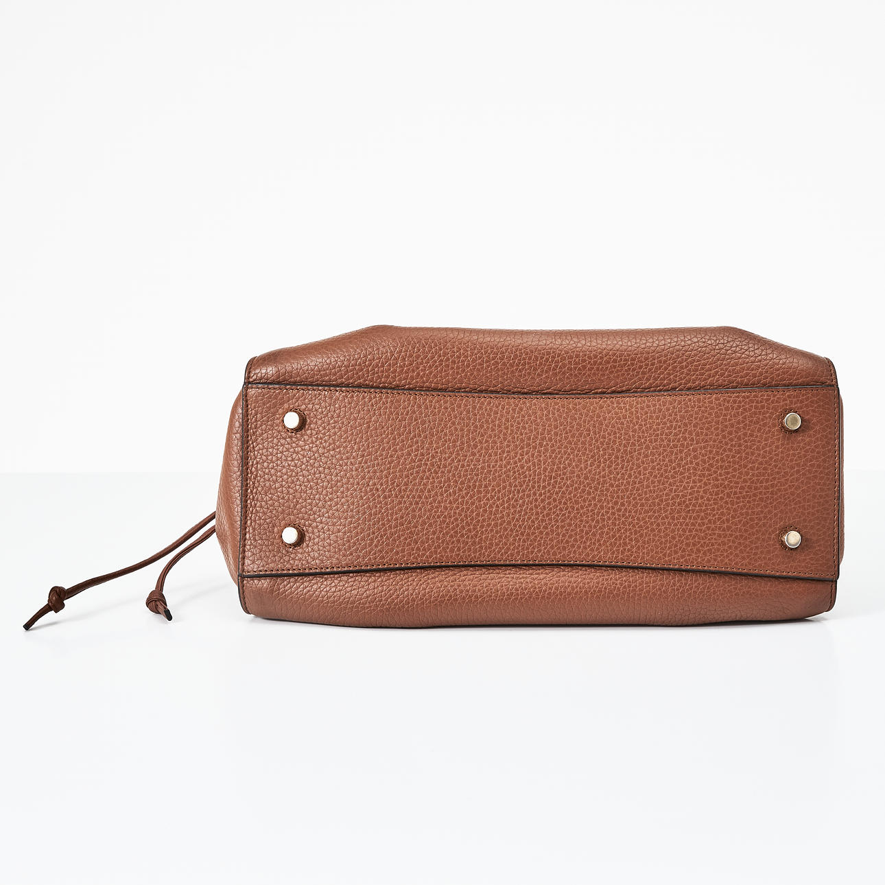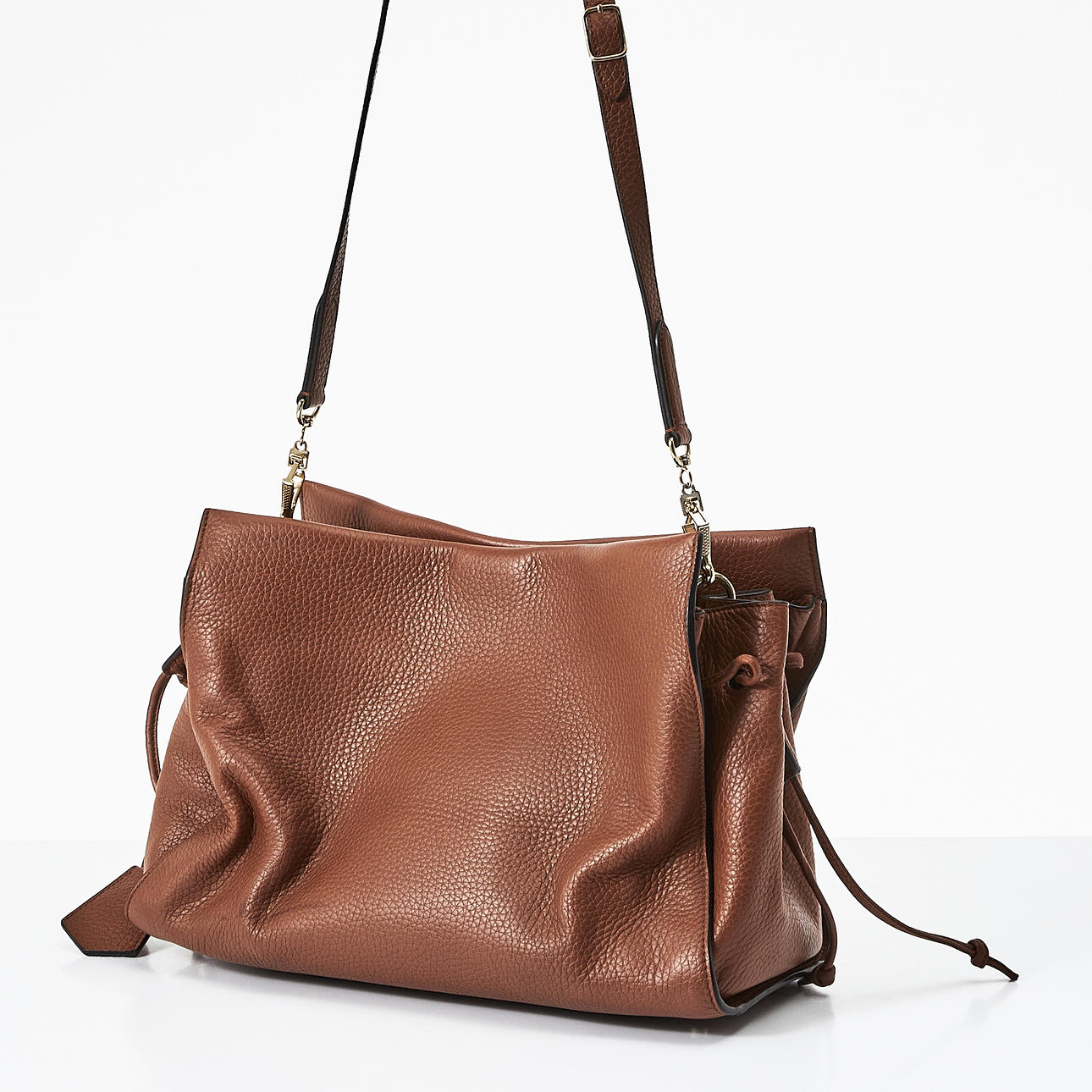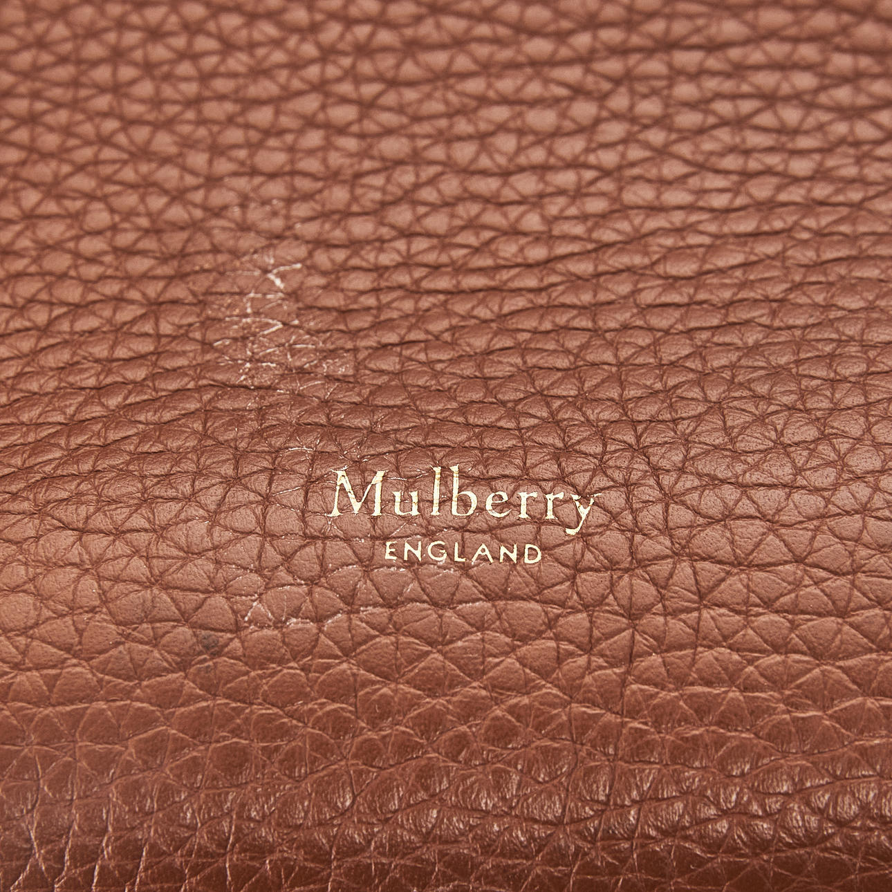 Embossed, brown leather, front detail in yellow metal, drawstring at the sides, magnetic closure, adjustable and removable crossbody strap, lined in matching suede, inside with two pockets, one with zipper, marked "Mulberry England”, clochette with keychain, dimensions approx. 35 x 26 x 16 cm.