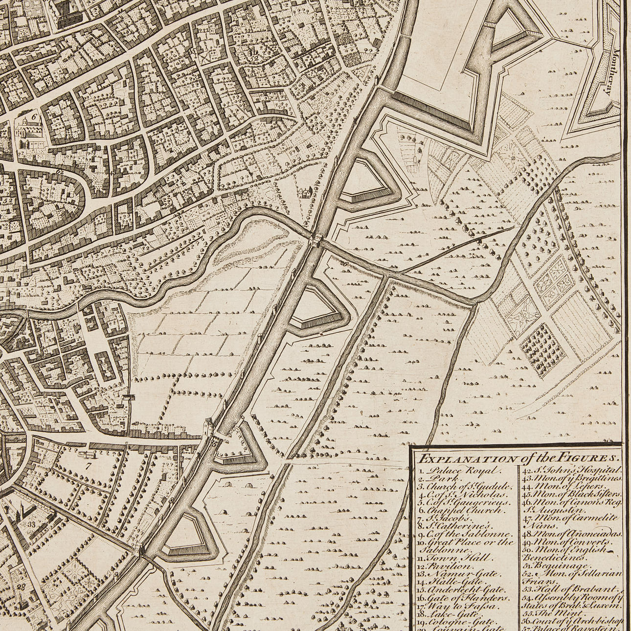 The whole blade approx. 400 x 490 mm. Engraved city plan of Brussels with two folds from the original binding.