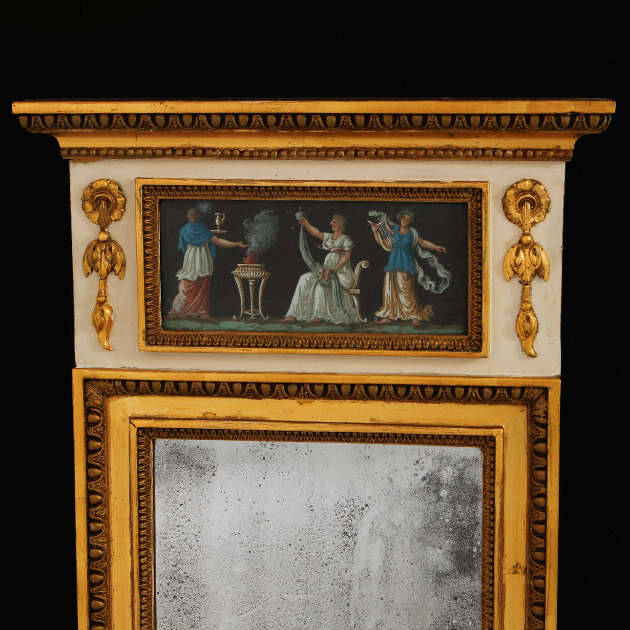 Wooden frame with two decorative panels with figurative scenes in gouache. Frame with decoration of fleurons and egg-and-dart moulding. 106 x 42.