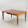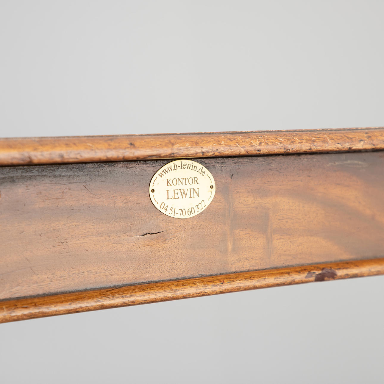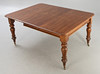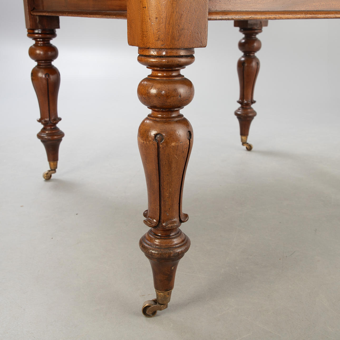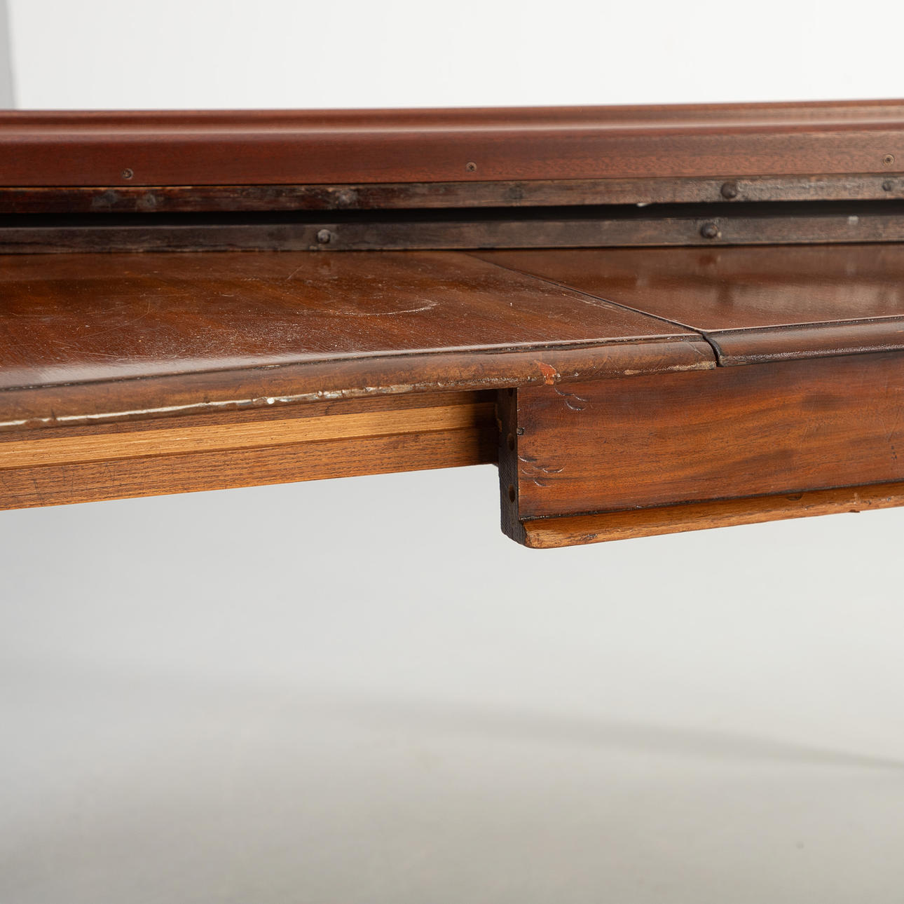 Mahogany and mahogany veneered. Articulated, fluted legs on rollers. Protruding table top with rounded corners 3 insert plates are available each, approx. 40 cm