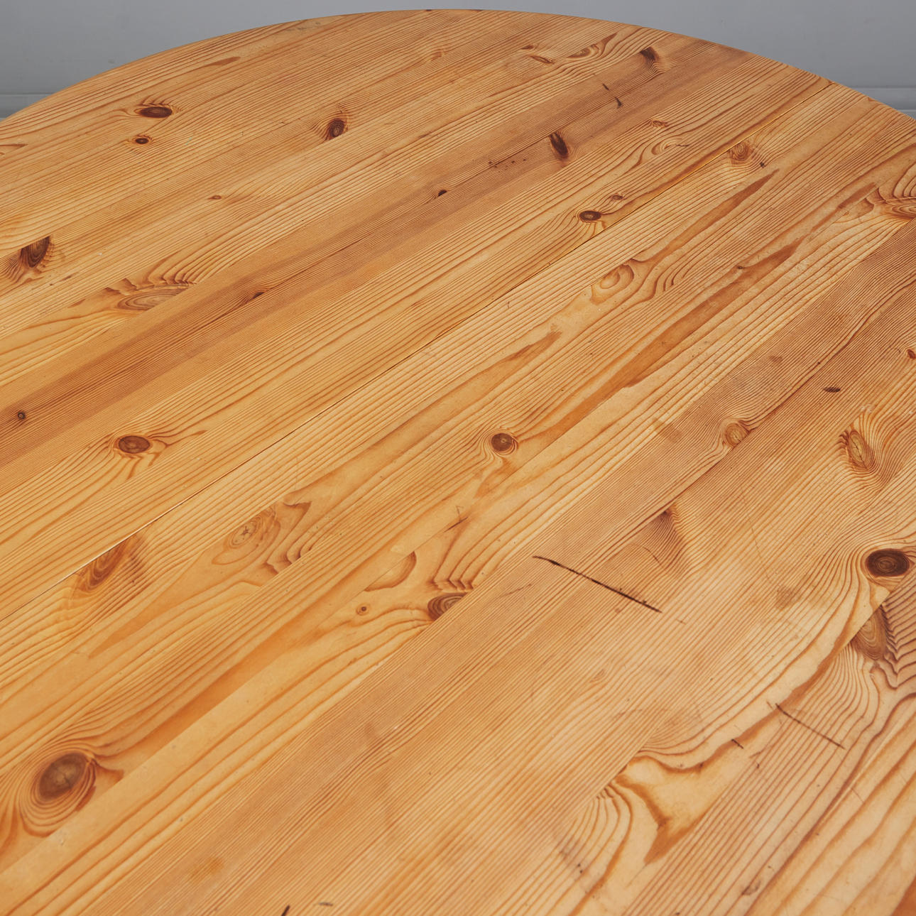 Round dining room table made of oiled pine wood, extendable table top, with manufacturer's label on the underside, h.73cm, d.120cm.