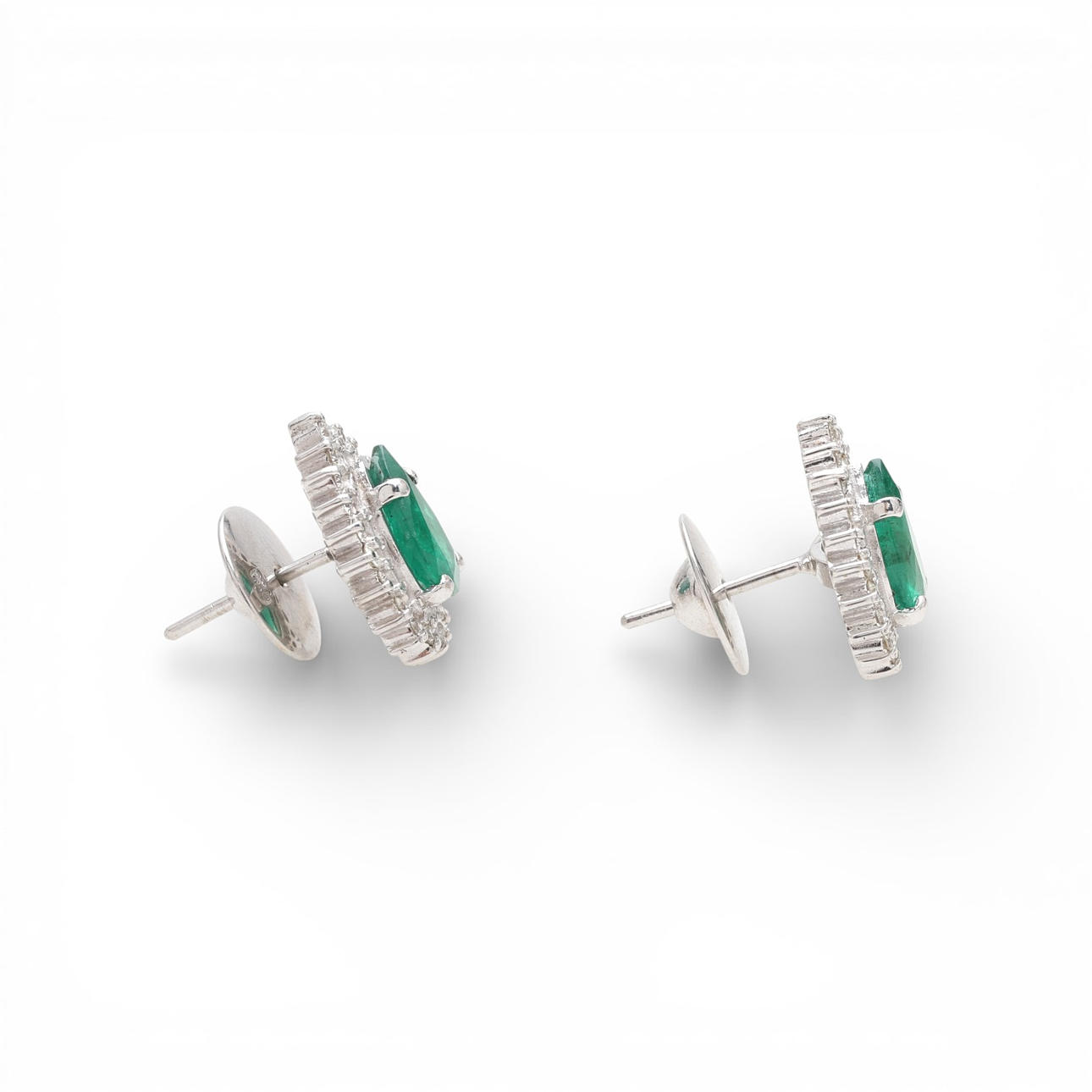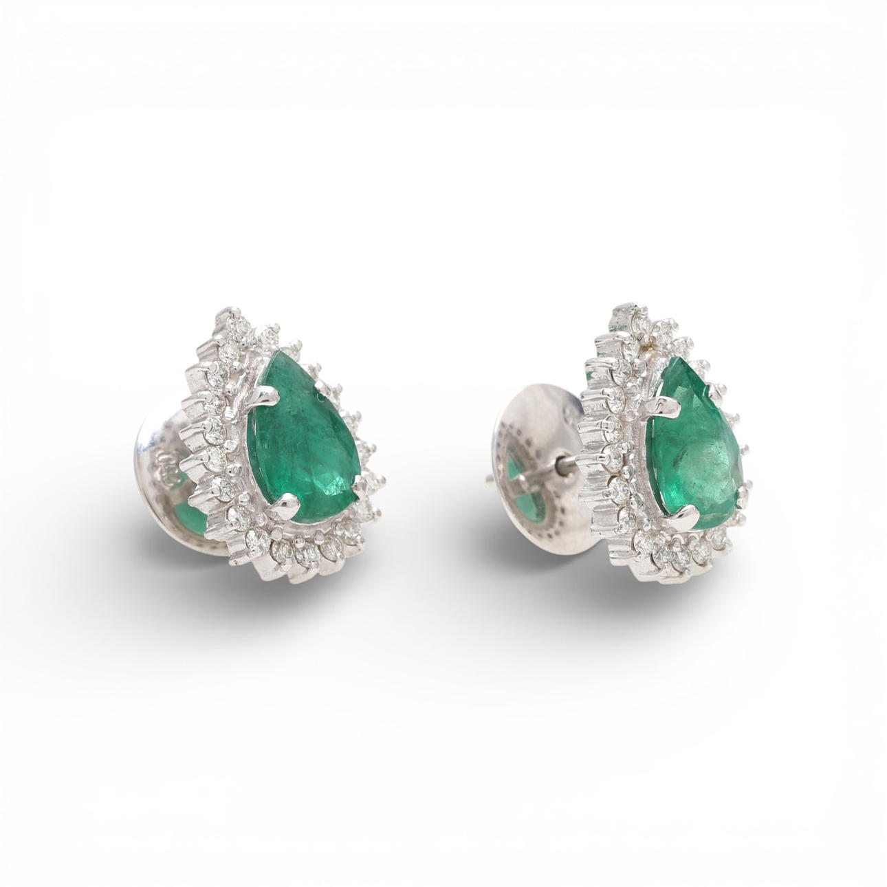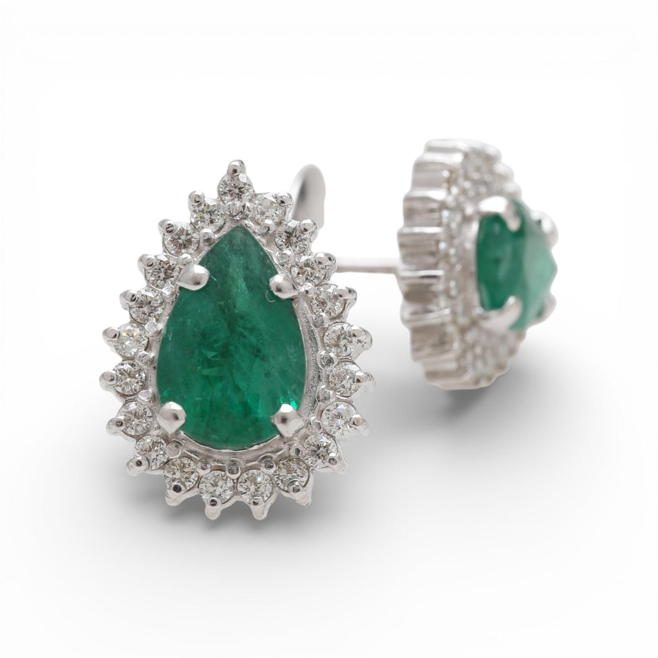 18K white gold, pear cut emeralds, approx. 2.44 cts., and brilliant cut diamonds, approx. 0.65 cts. 1.6 cm. 6 gr.