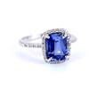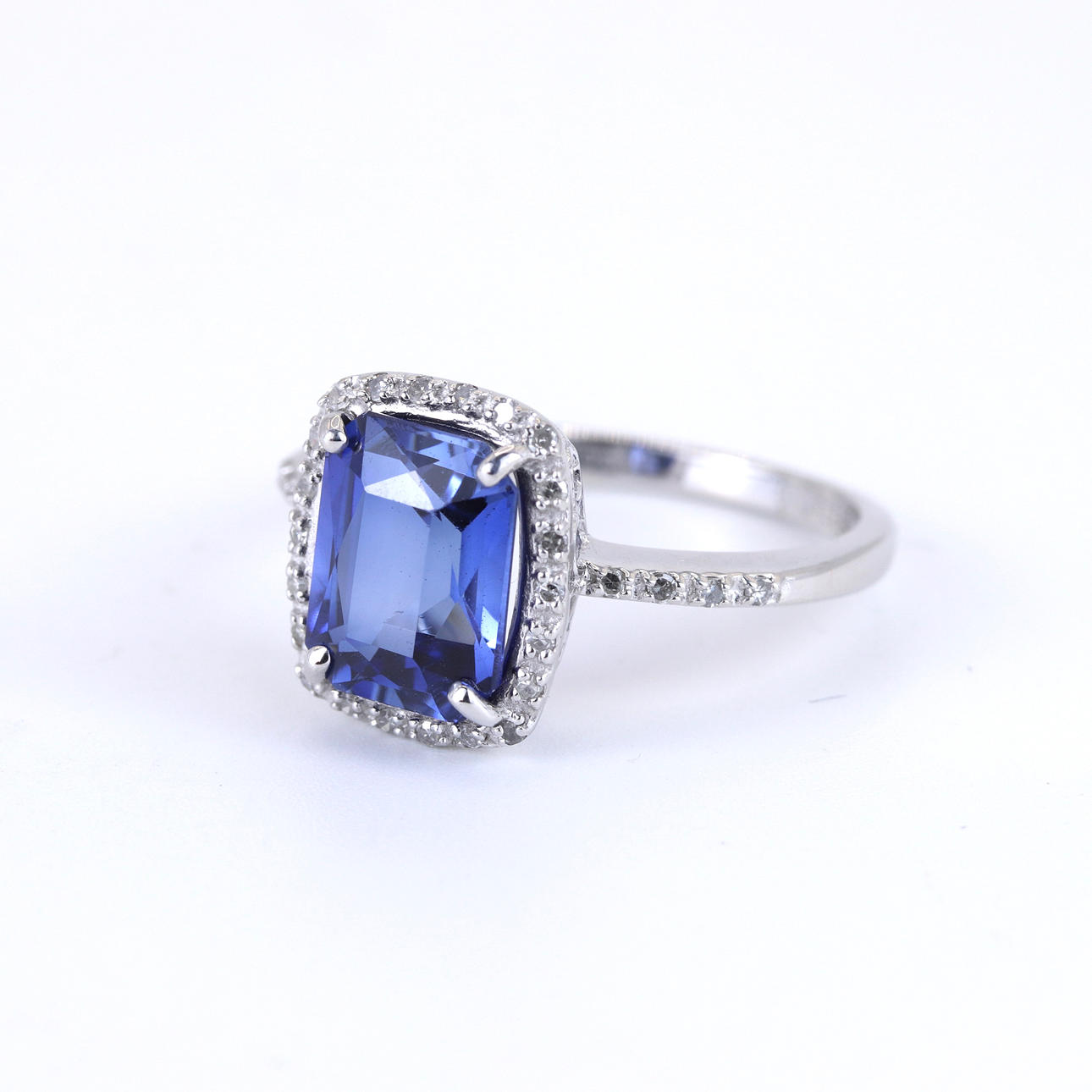 A 9ct white gold ring set with large cushion cut blue stone surrounded by diamonds.