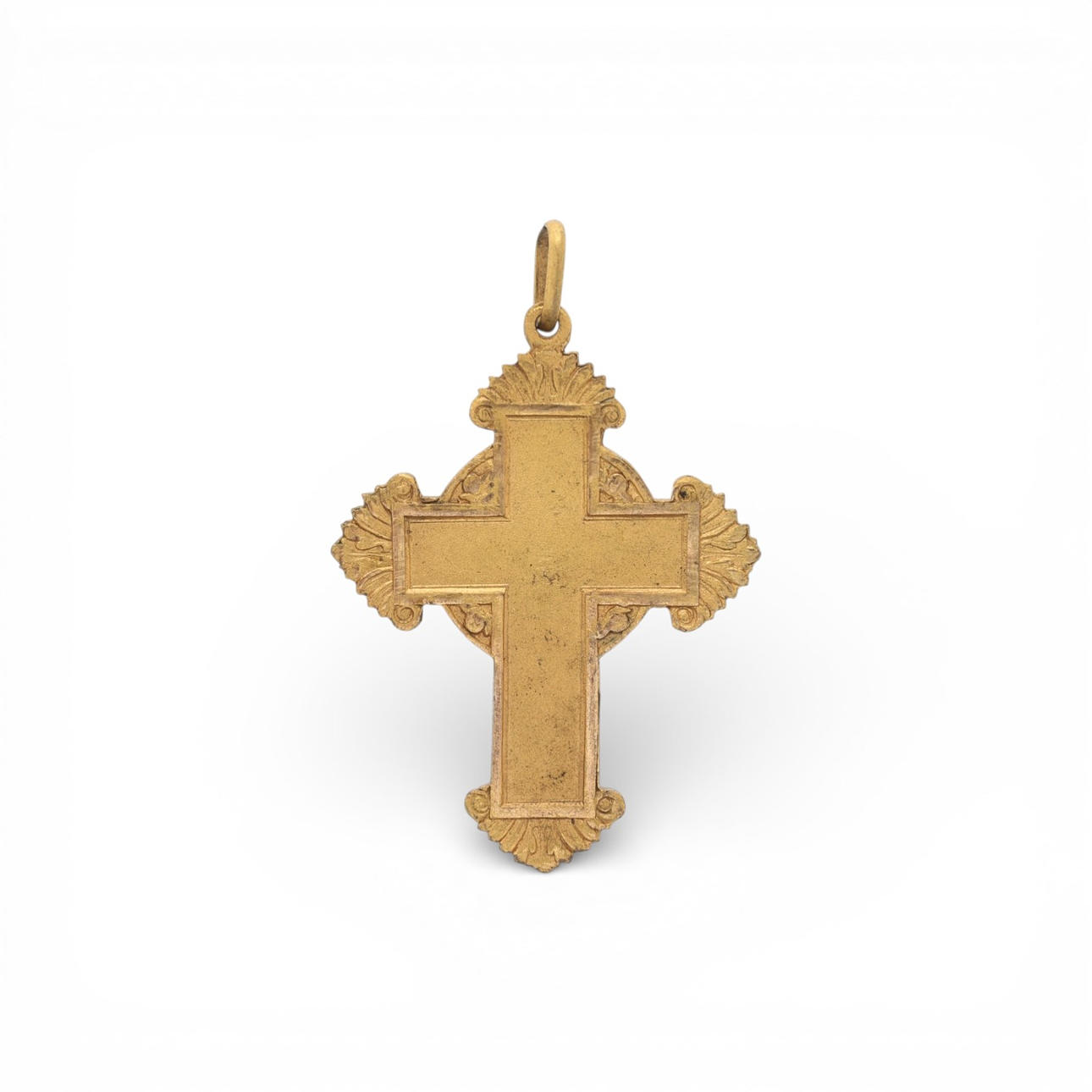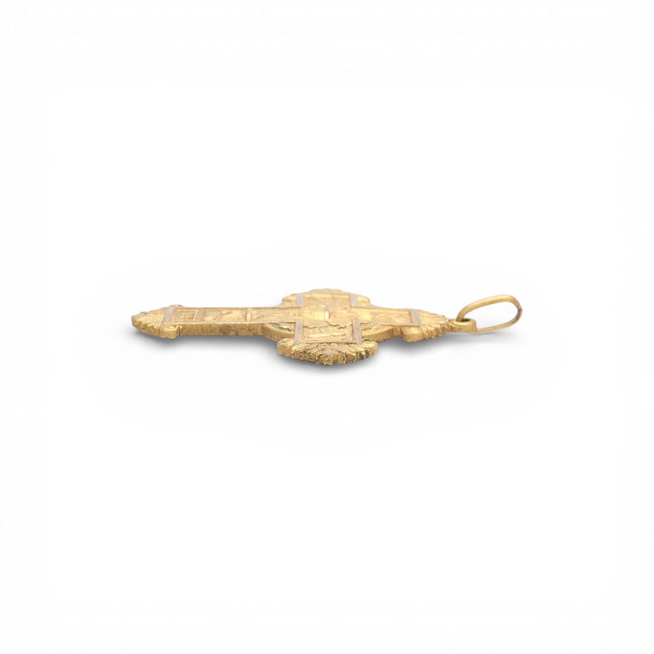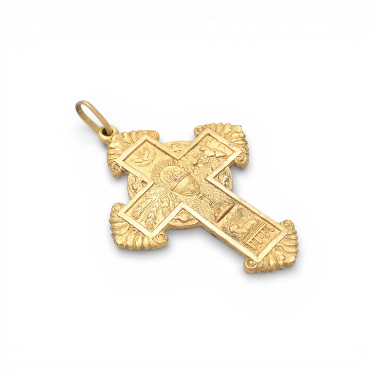Over-gilded metal depicting Christian symbols. 5.9 x 3.8 cm.